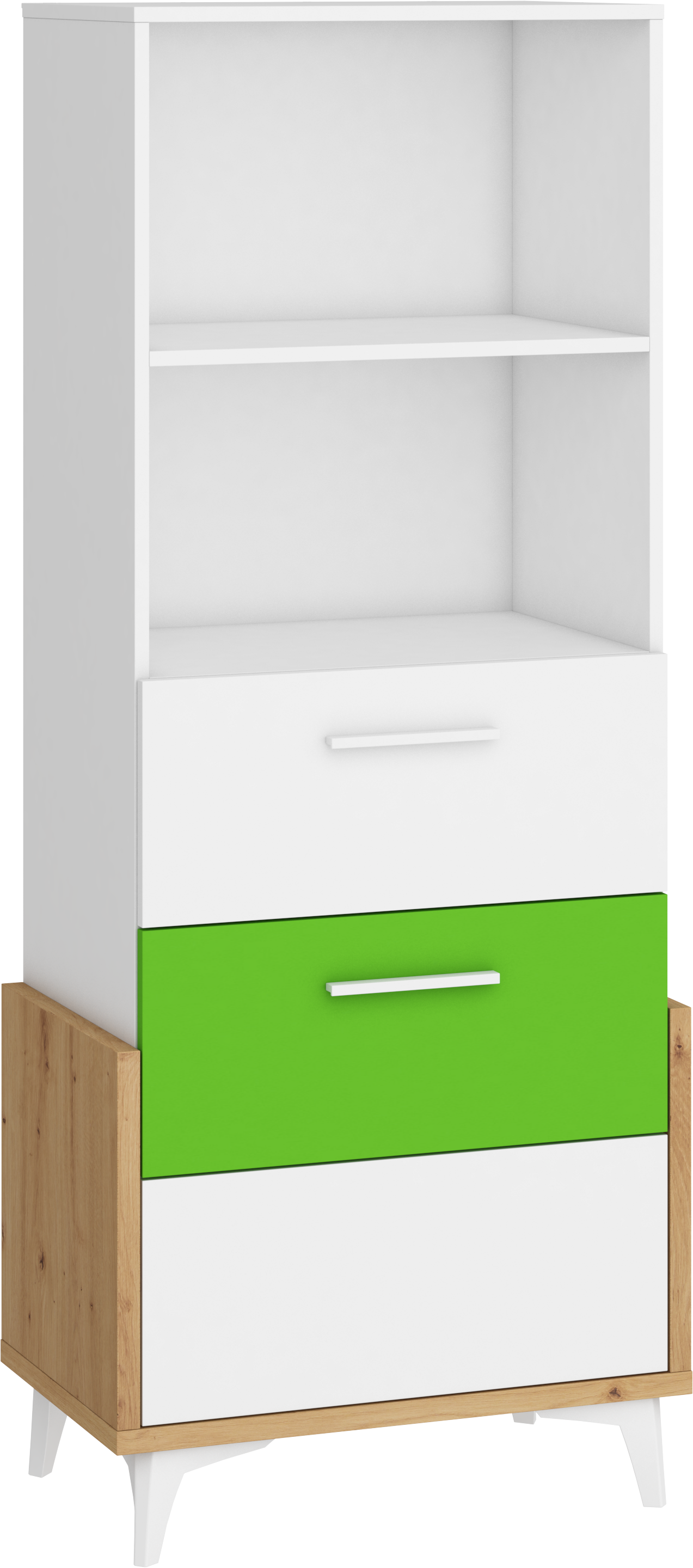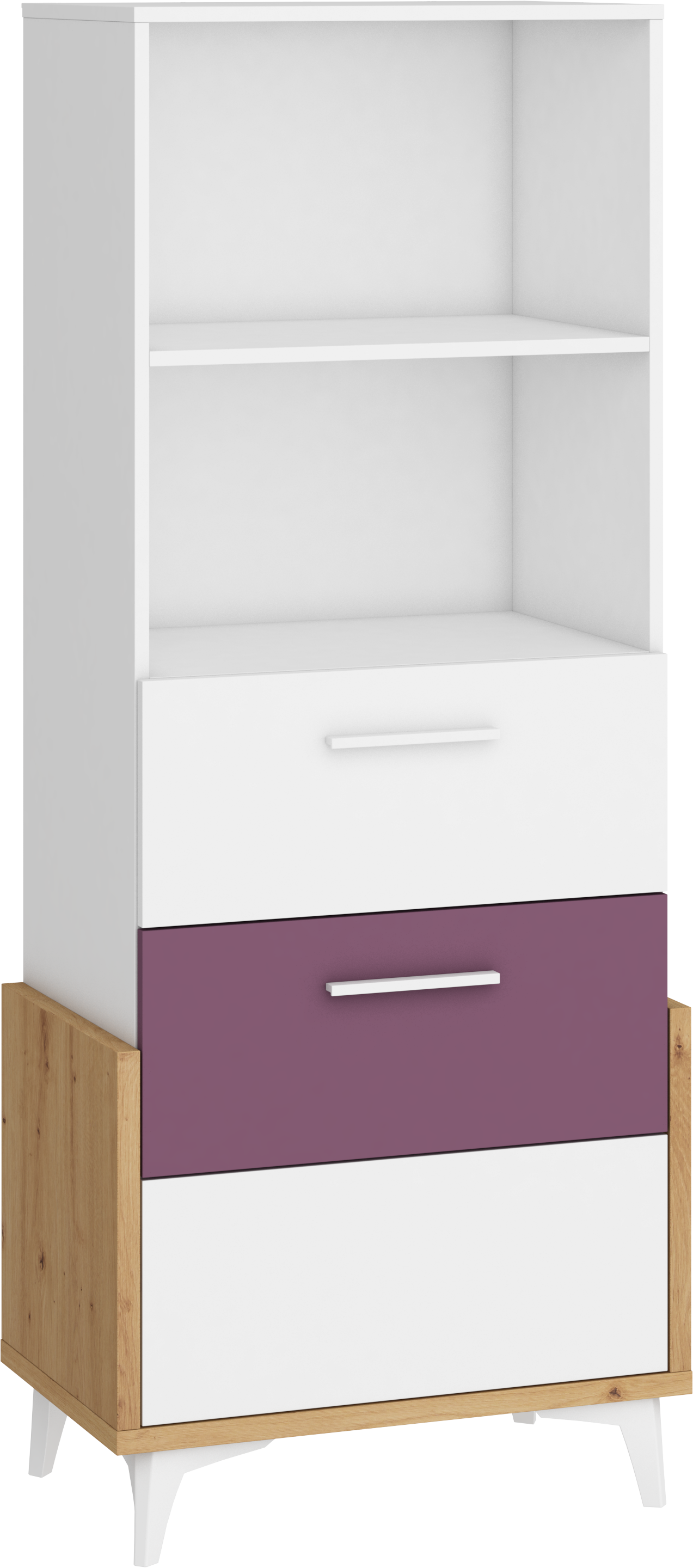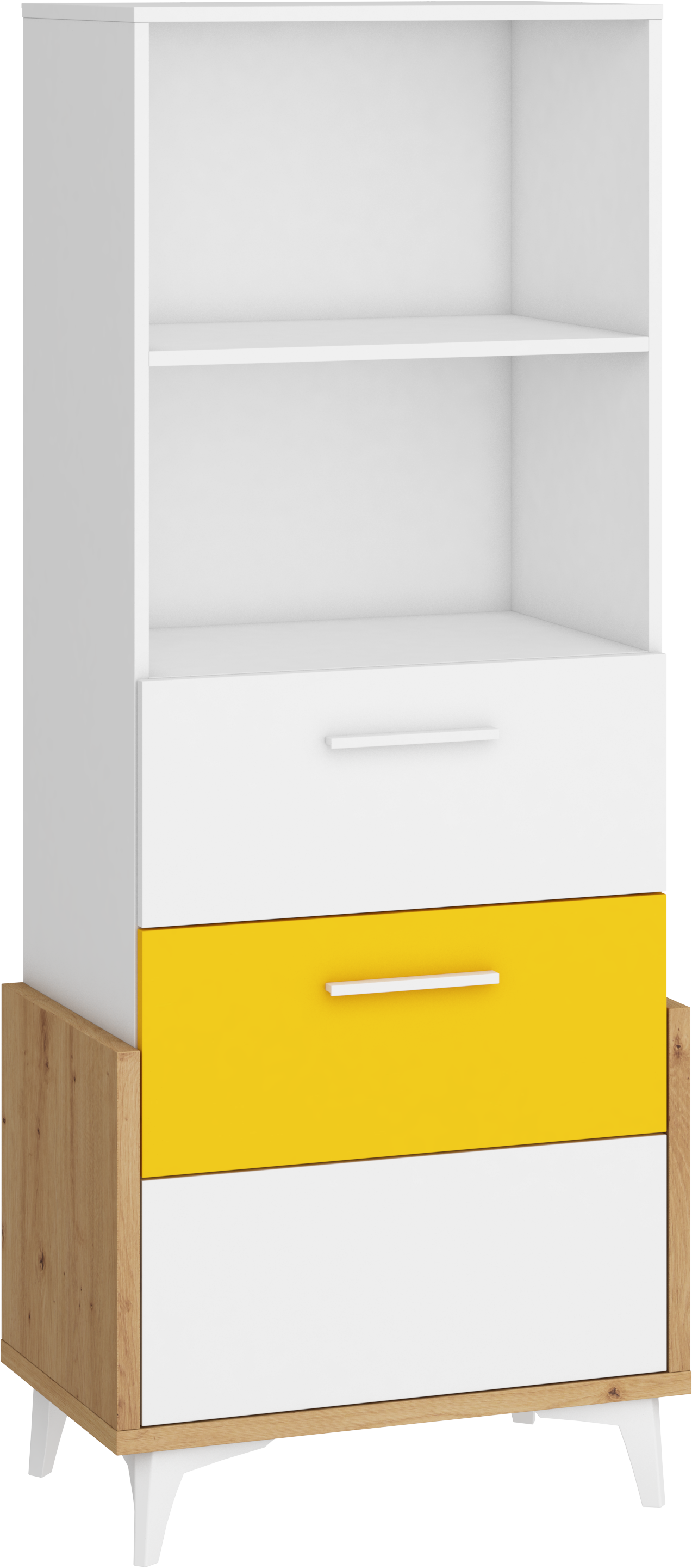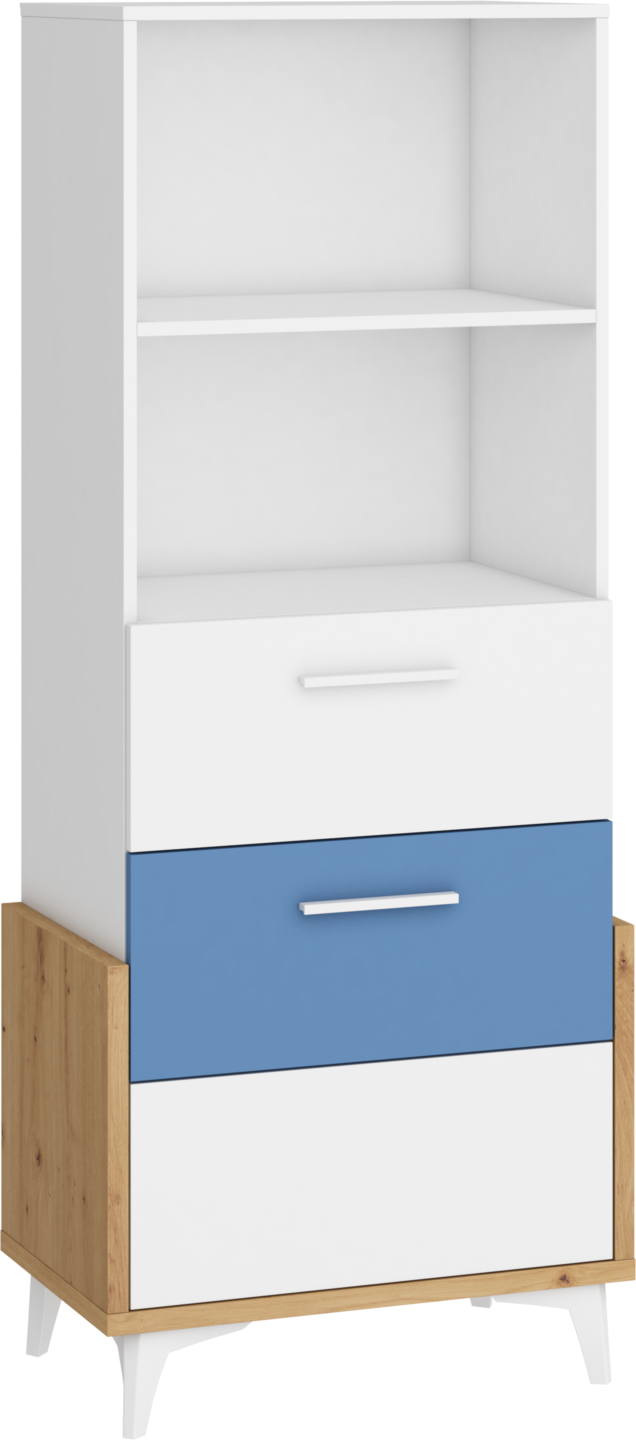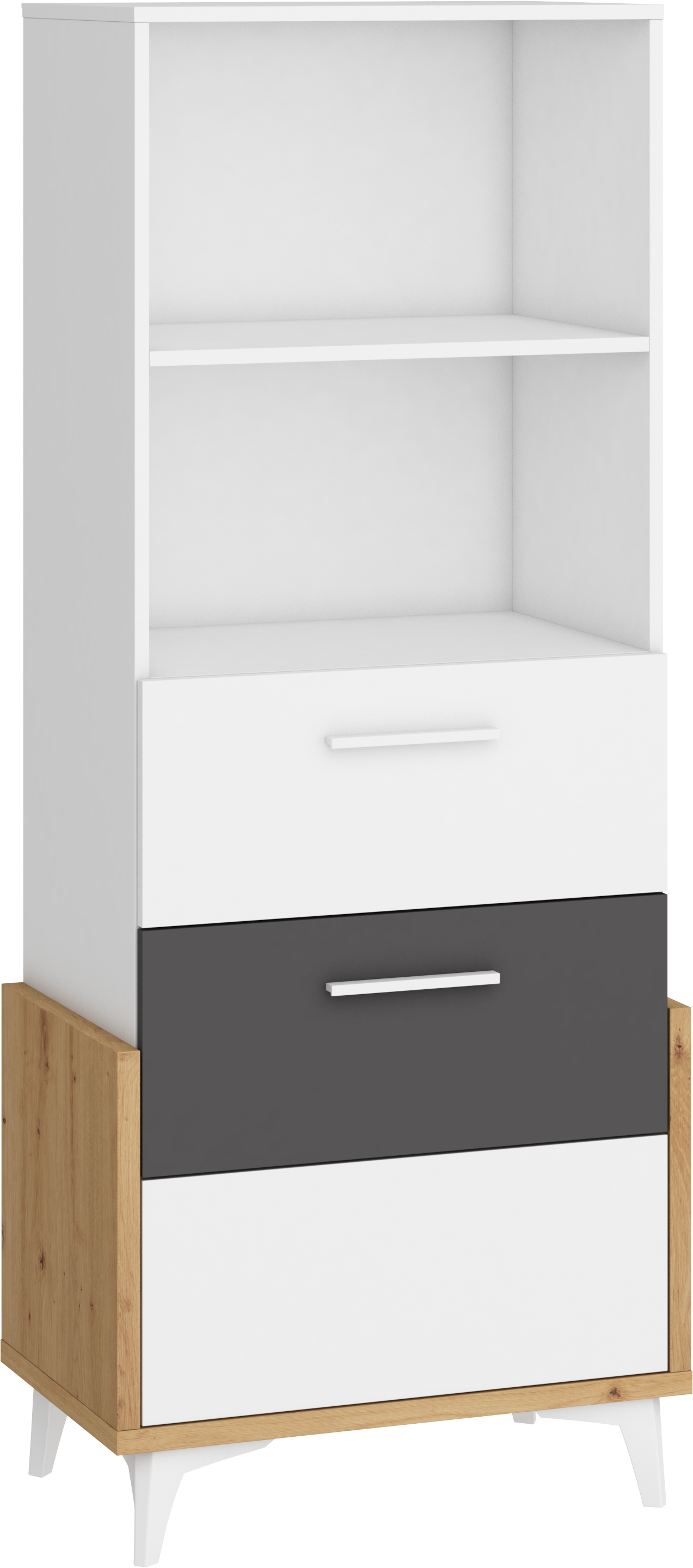 Součástí regálu jsou 3 zásuvky na kovových pojezdech a 2 otevřené niky k vystavení vašich oblíbených knih, dekorací, rámečků s fotografiemi či dekoračních košíčků.