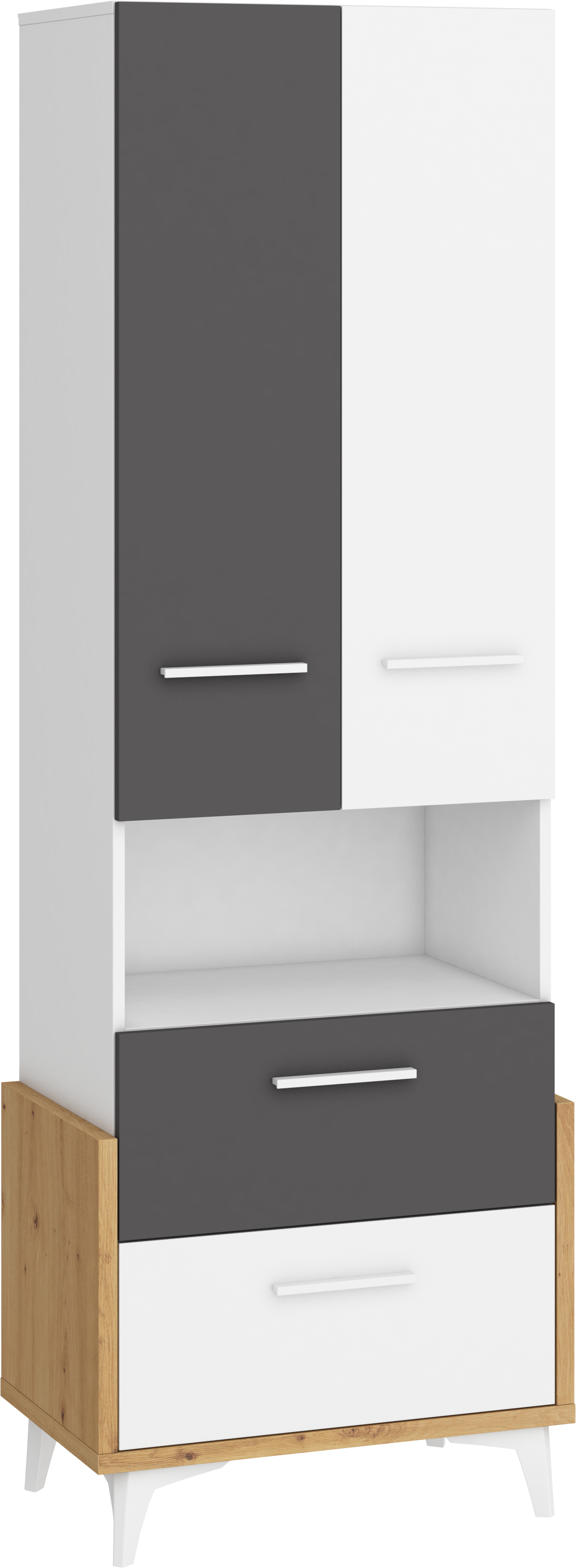 Součástí regálu jsou 2 dvířka, za kterými jsou vloženy 2 lakované police. Pod dvířky je otevřená nika a 2 hluboké prostorné zásuvky na kovových pojezdech.