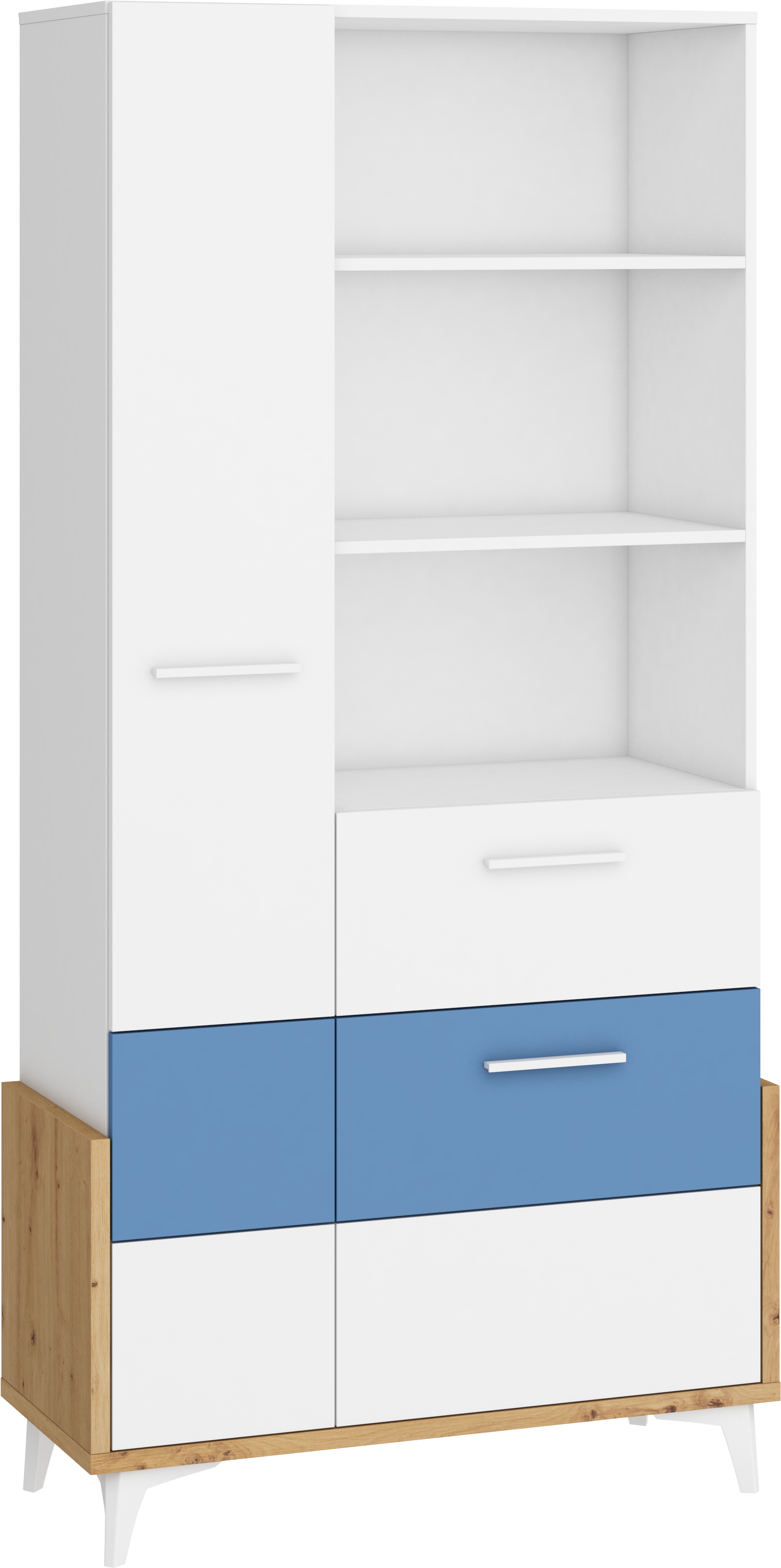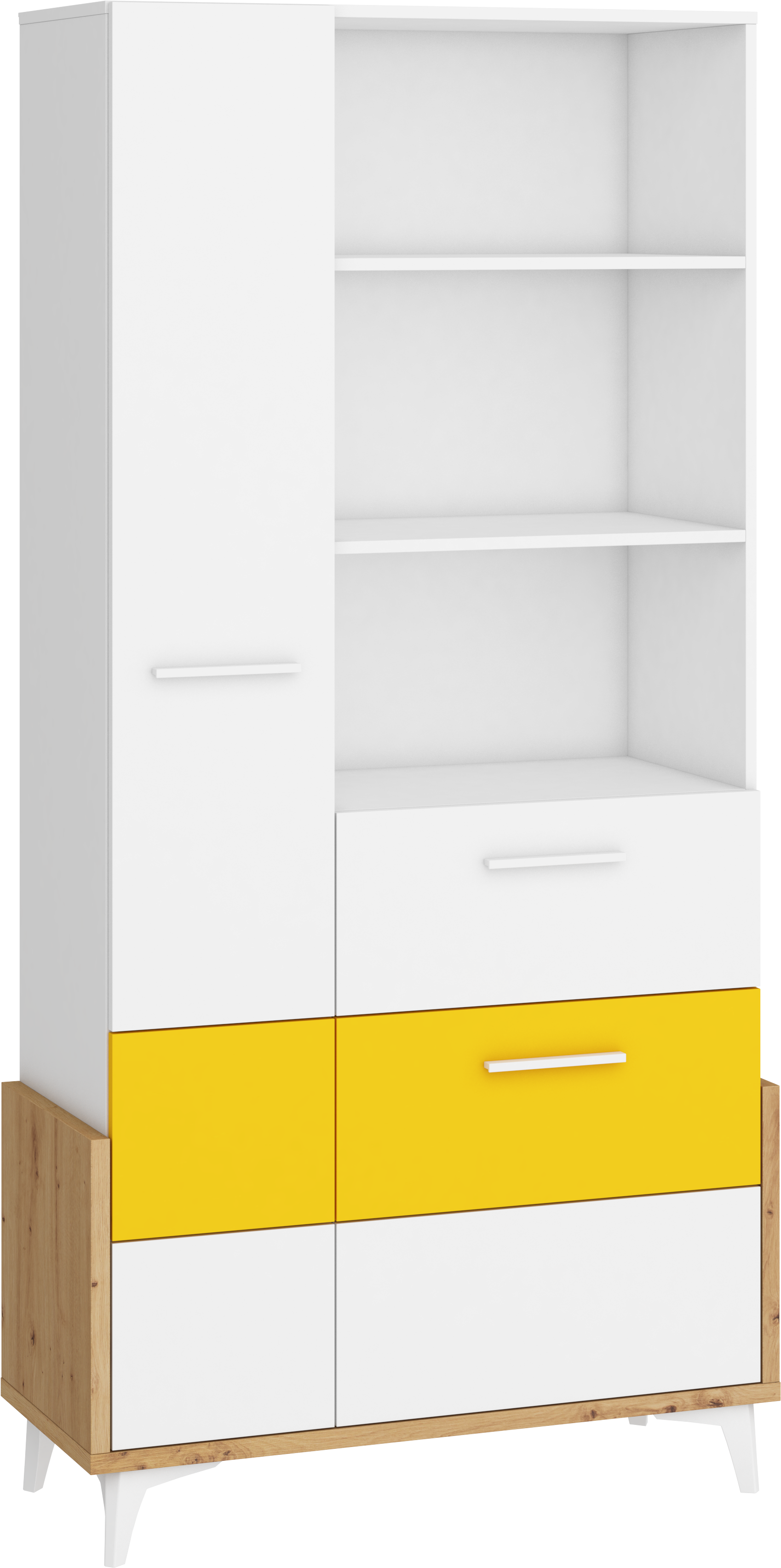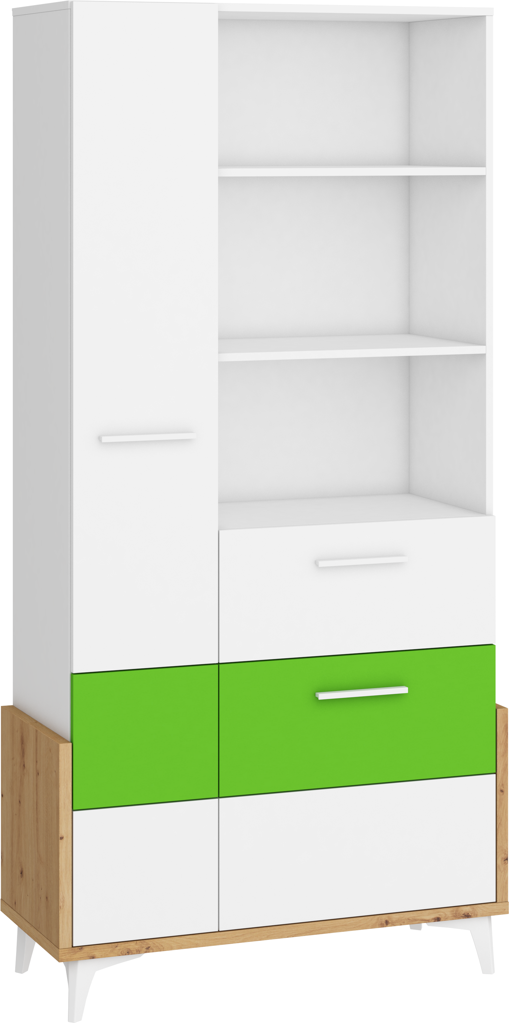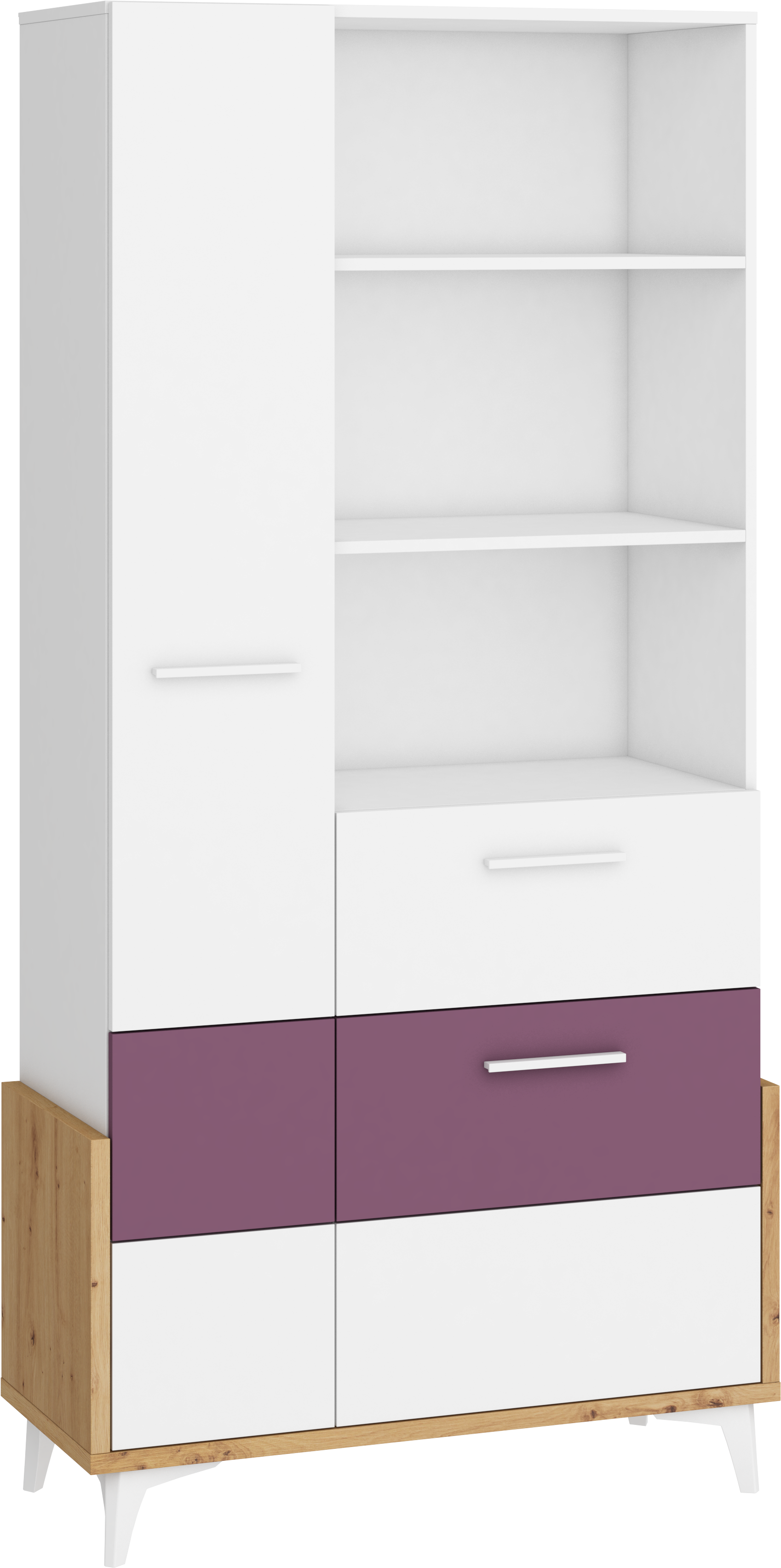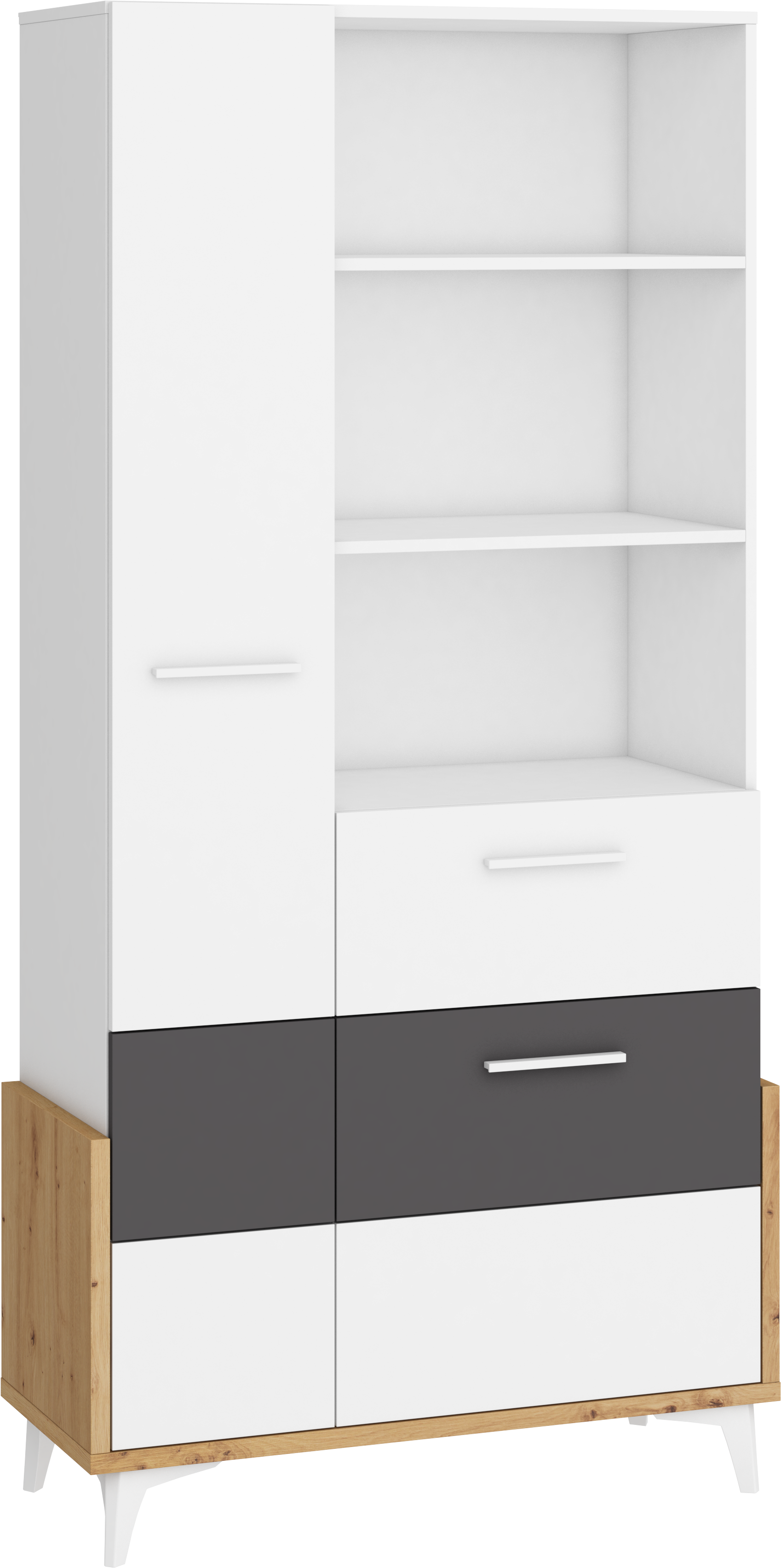 Součástí regálu jsou 2 dvířka, za kterými je vloženo 5 lakovaných polic. V pravé části jsou 3 otevřené niky, k vystavení vašich oblíbených dekorací, knih, rámečků s fotografiemi či dekoračních košíků, a 1 prostorná zásuvka na kovových pojezdech.