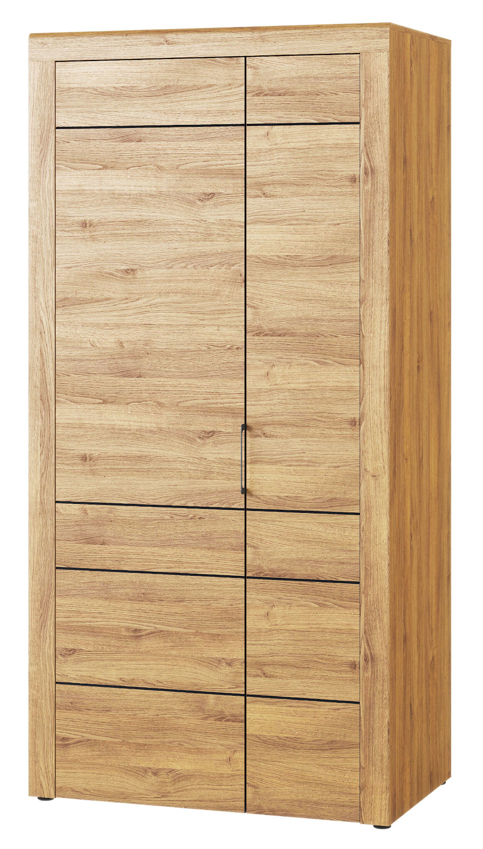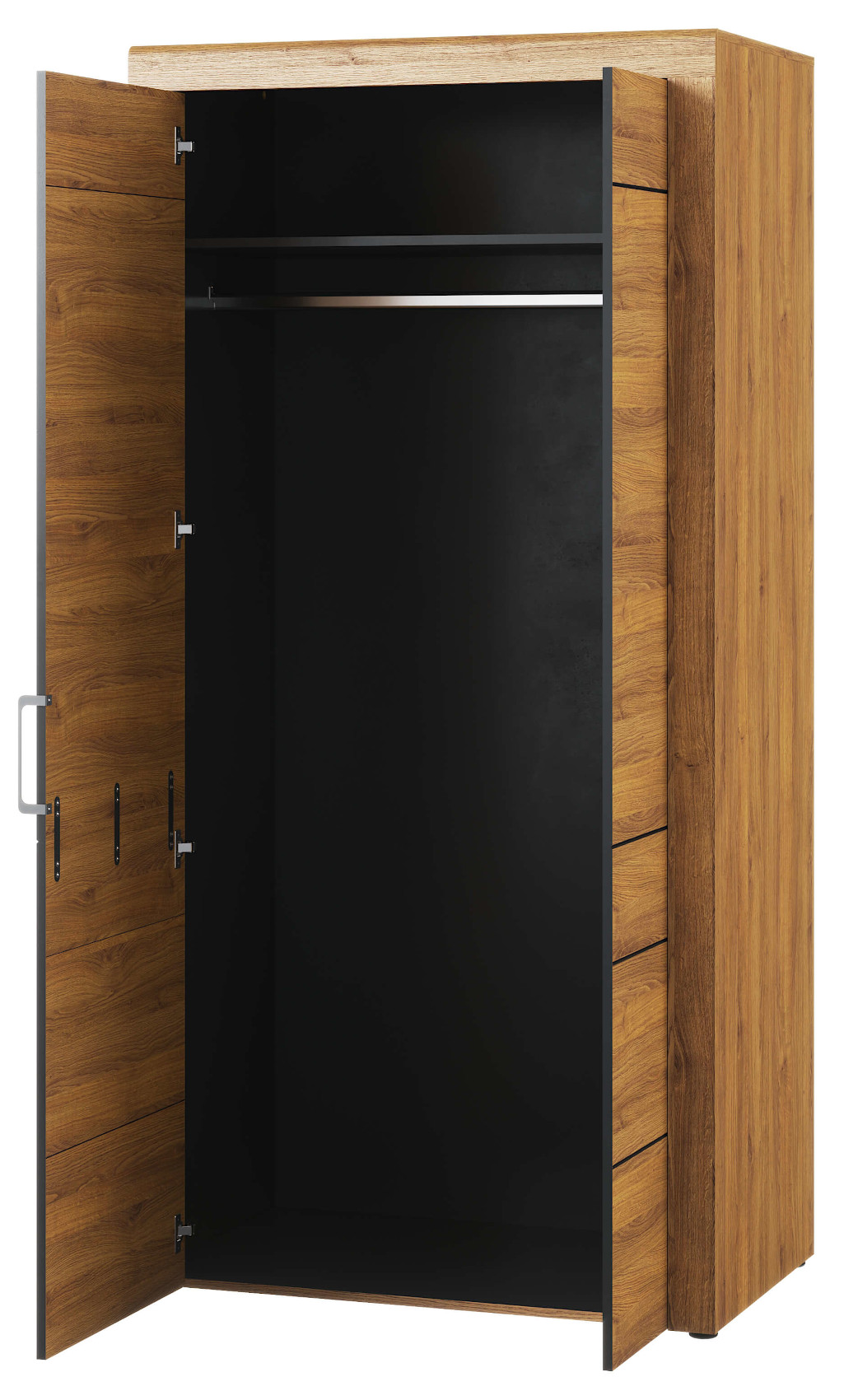 Moderní šatní skříň Kama 70 vás zaujme svým prostým designem s viditelnou strukturou dřevěných lét. Je vyrobena z lamina potaženého fólií, která navodí dojem přírodního dřeva. Jedinečným prvkem jsou matně černé lakované detaily s úchyty. Dvířka mají systém tichého dovírání.