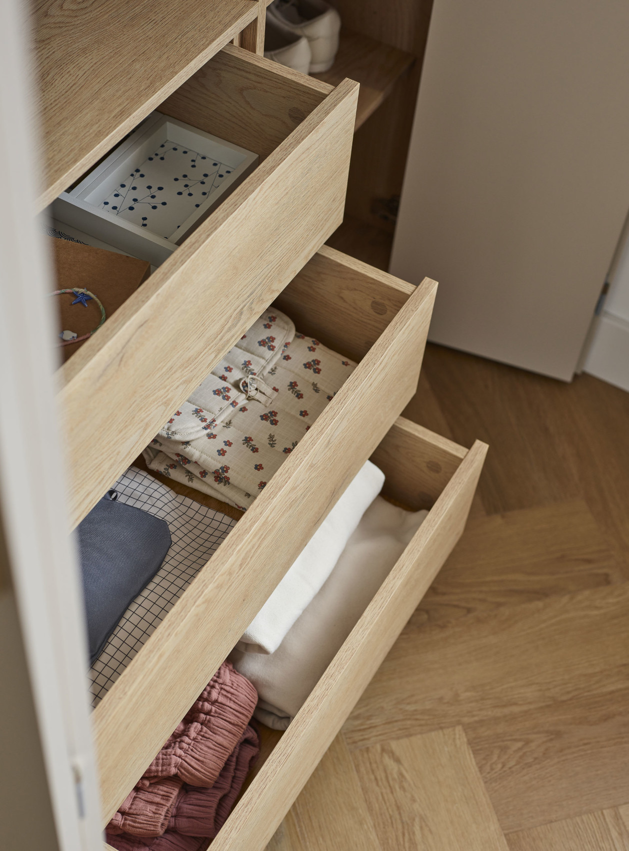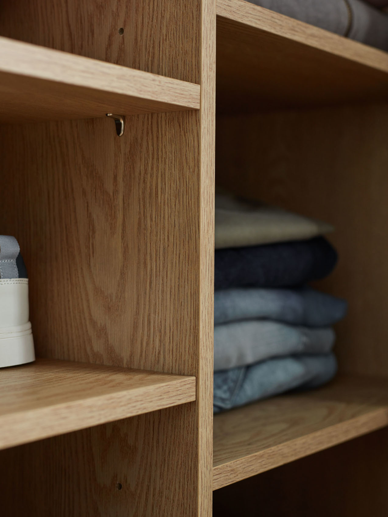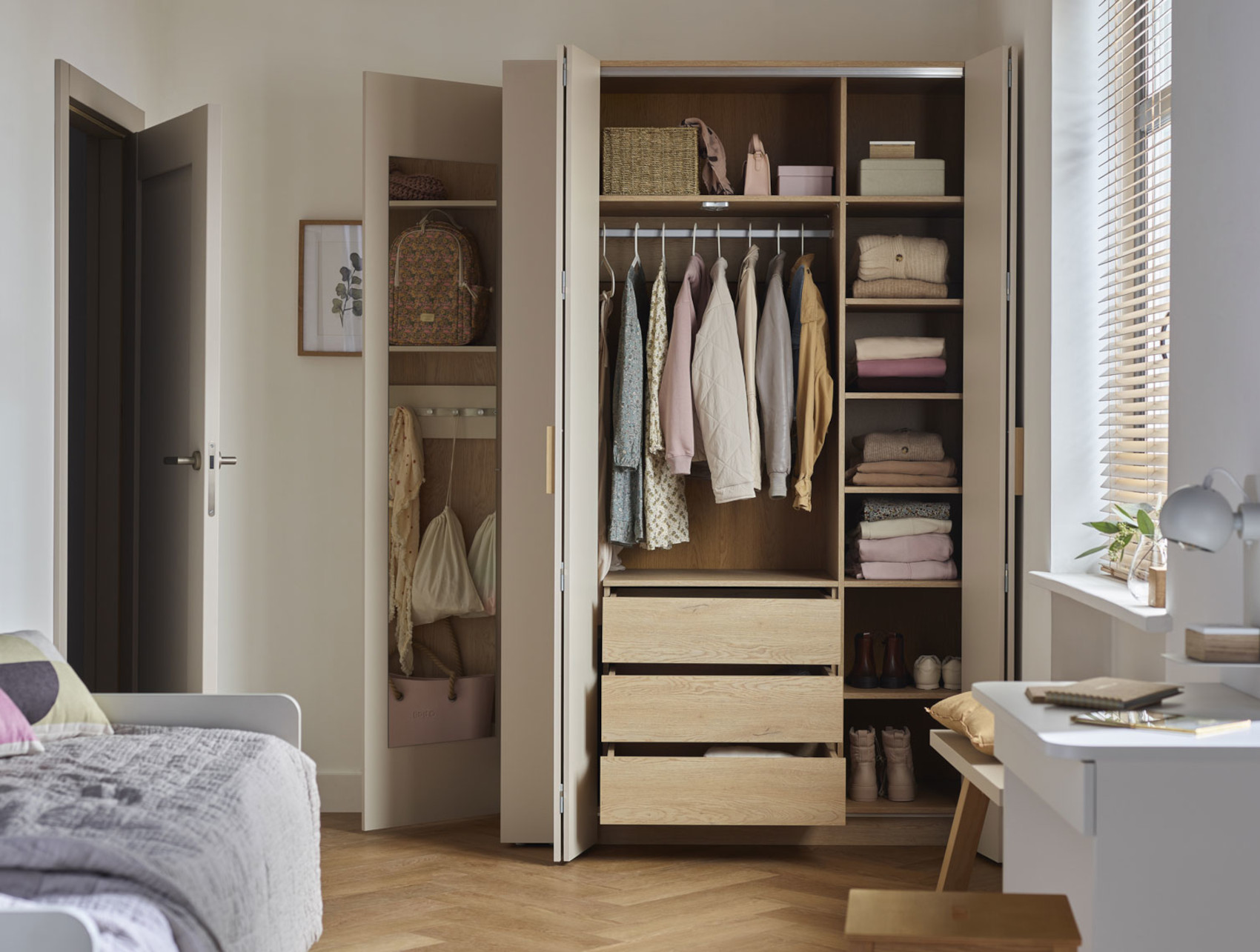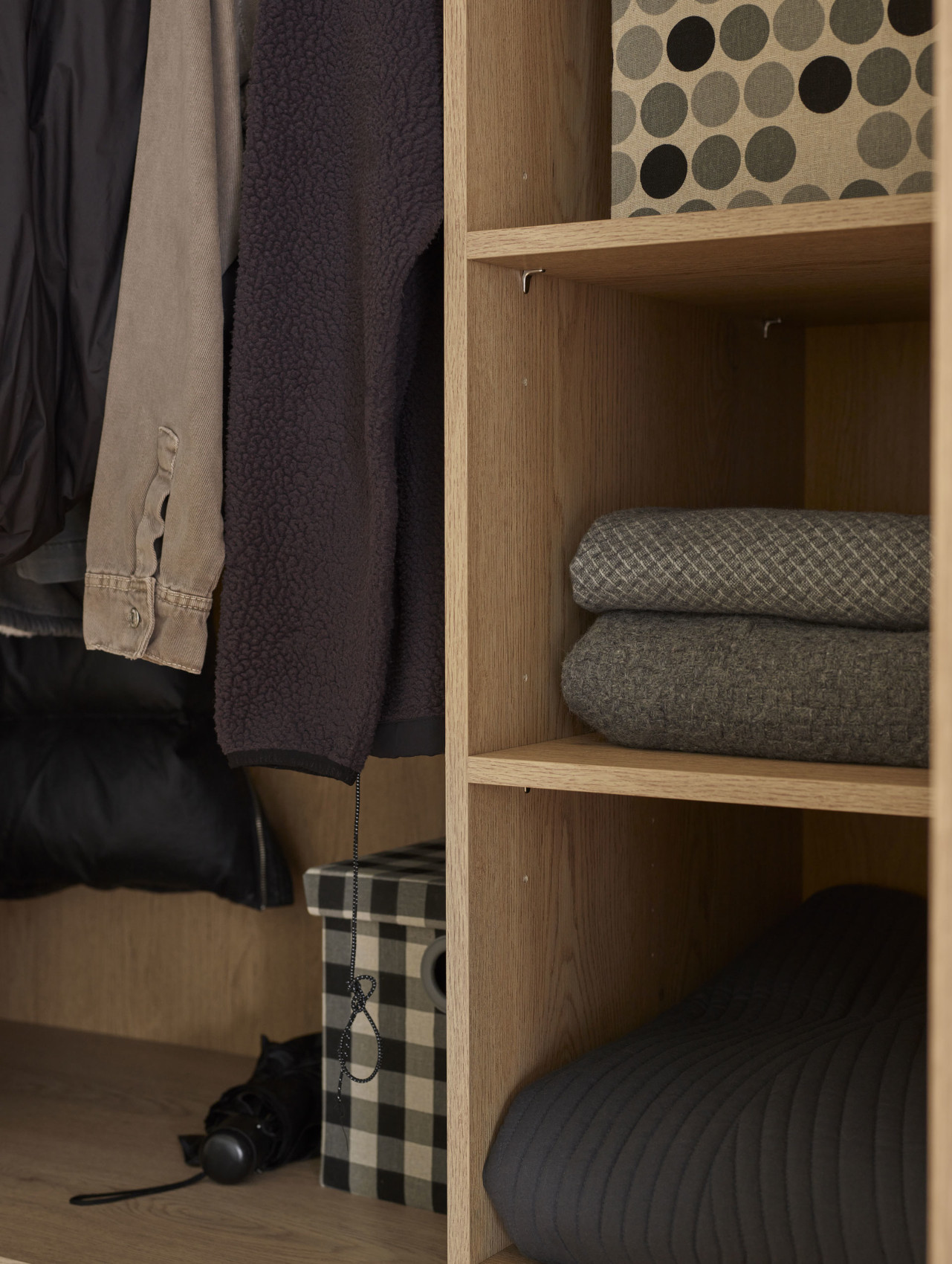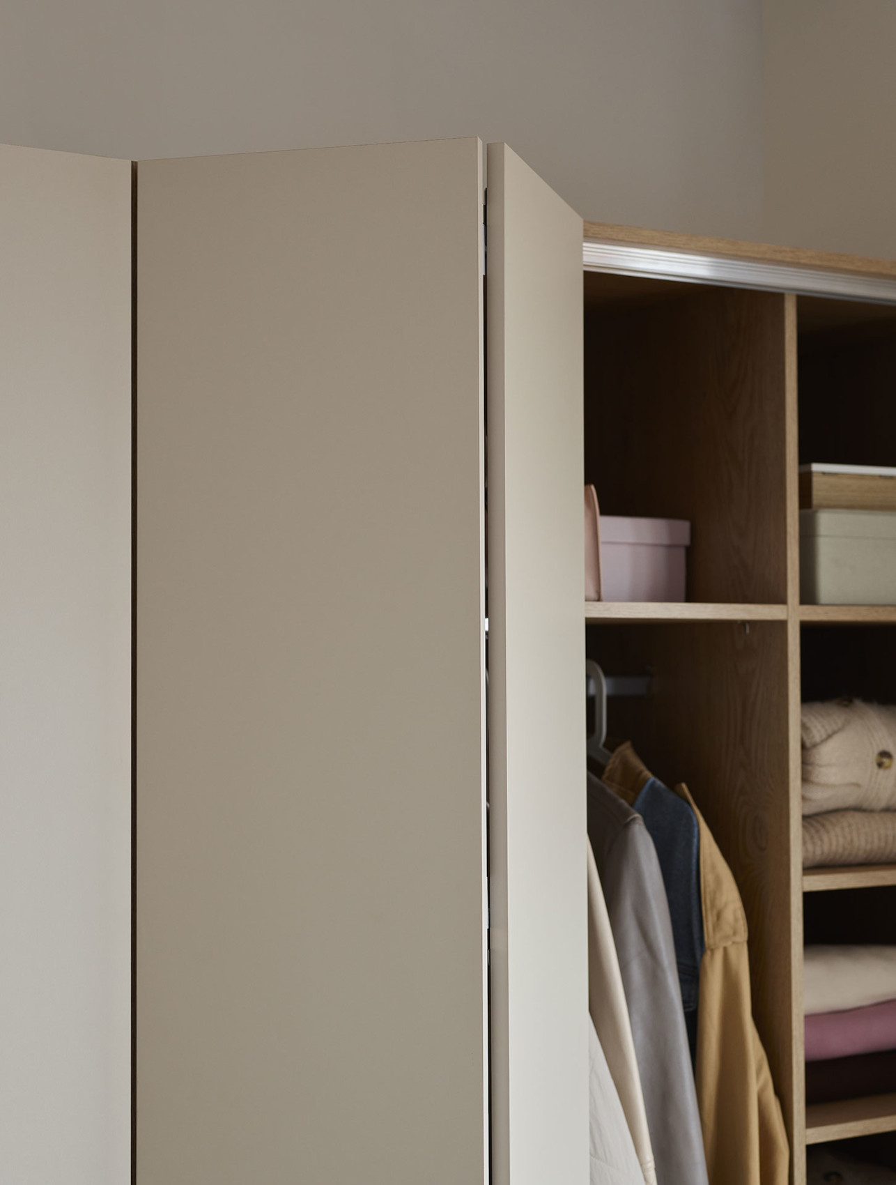 Šatní skříň Stor vás zaujme svým moderním designem s luxusními prvky. Můžete ji využít jako samostatně stojící skříň nebo díky maskovacím panelům snadno nahradí nábytek na míru. Je vyrobena z vysoce kvalitní nábytkové desky, odolná vůči poškození. Úchyty jsou z masivního dubového dřeva nebo z kovu, záleží, jaký ze 6 typů rukojetí si vyberete. Součástí skříně je LED osvětlením s pohybovým senzorem, které se rozsvítí při otevření skříně. Dveře jsou posuvné a skládací do akordeonu. Zároveň mají zabudovaný systém tichého dovírání. Vnitřní část skříně je vždy v odstínu dubu, na vás záleží jakou barvu předních a bočních částí si vyberete.