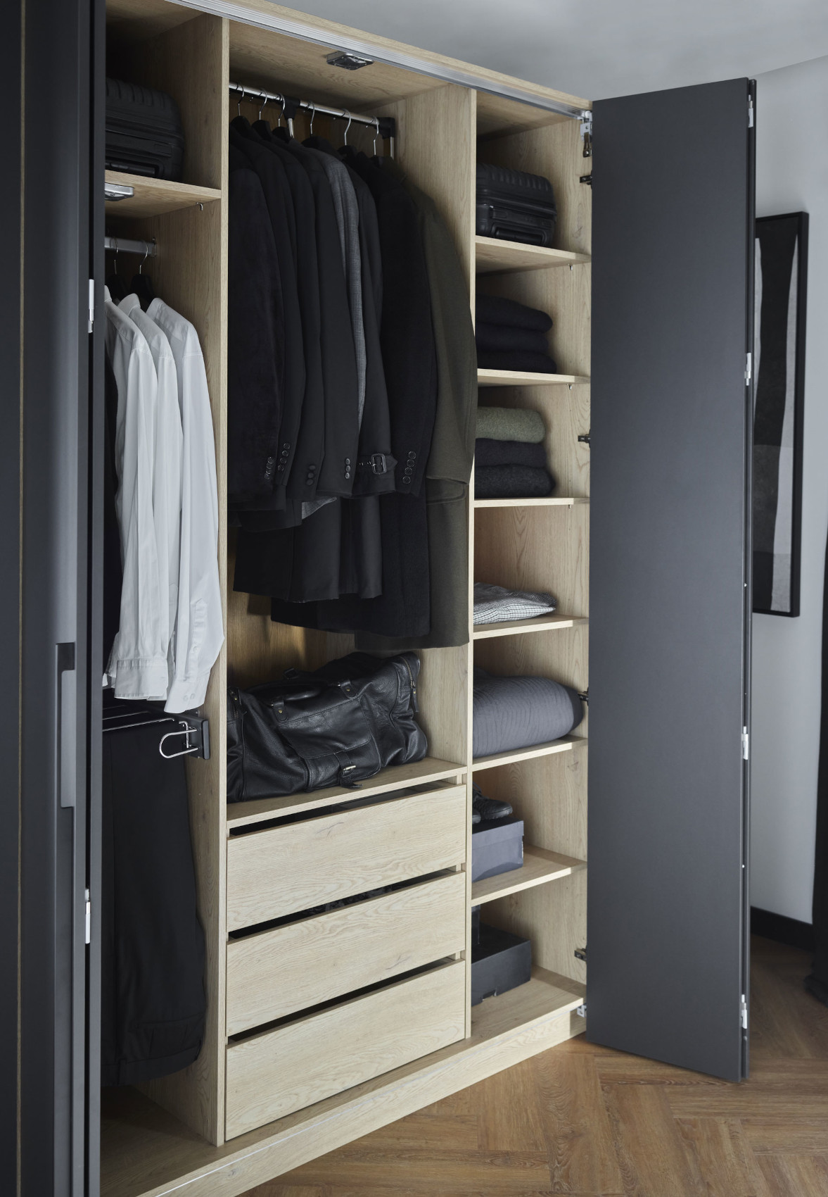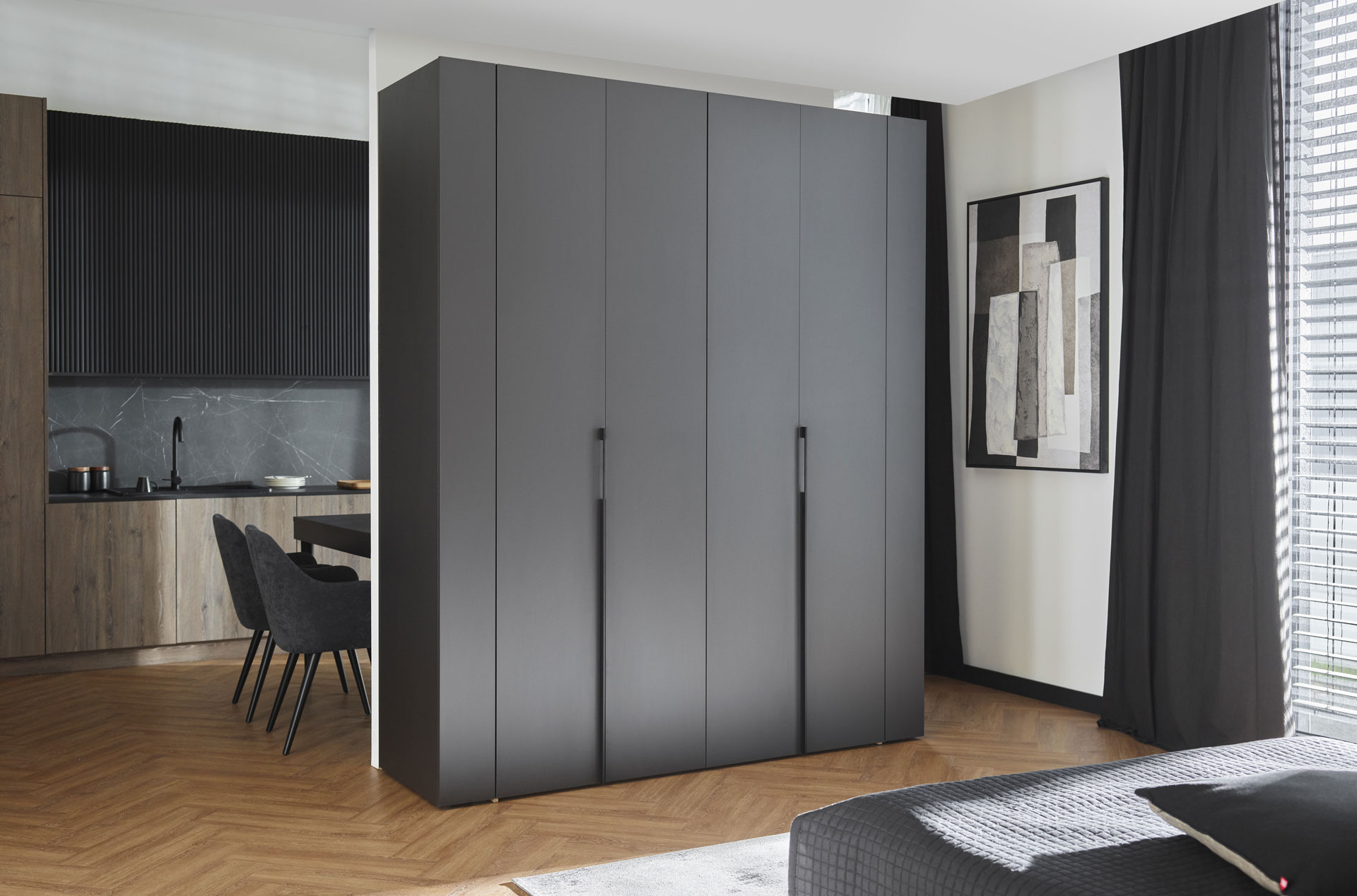 Šatní skříň Stor vás zaujme svým moderním designem s luxusními prvky. Můžete ji využít jako samostatně stojící skříň nebo díky maskovacím panelům snadno nahradí nábytek na míru. Je vyrobena z vysoce kvalitní nábytkové desky, odolná vůči poškození. Úchyty jsou z masivního dubového dřeva nebo z kovu, záleží, jaký ze 6 typů rukojetí si vyberete. Součástí skříně je LED osvětlením s pohybovým senzorem, které se rozsvítí při otevření skříně. Dveře jsou posuvné a skládací do akordeonu. Zároveň mají zabudovaný systém tichého dovírání. Vnitřní část skříně je vždy v odstínu dubu, na vás záleží jakou barvu předních a bočních částí si vyberete.