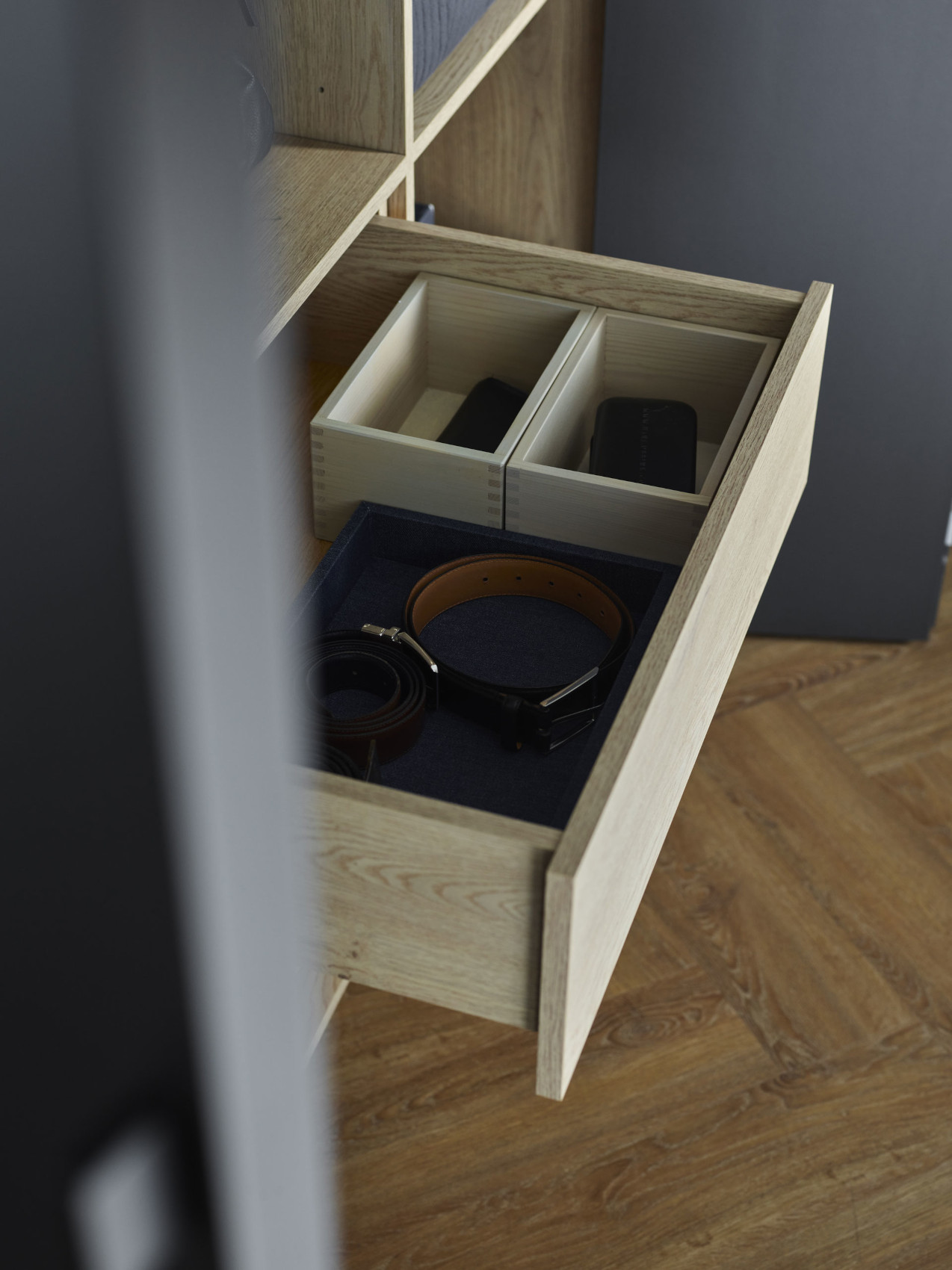 Varianta Easy má 3 pevné lakované horní police, 3 šatní tyče a 7 polic s libovolně nastavitelnou výškou. Comfort má 3 pevné horní police, 3 šatní tyče, 5 polic s libovolně nastavitelnou výškou a skříňku s 3 prostornými zásuvkami na kovových pojezdech.