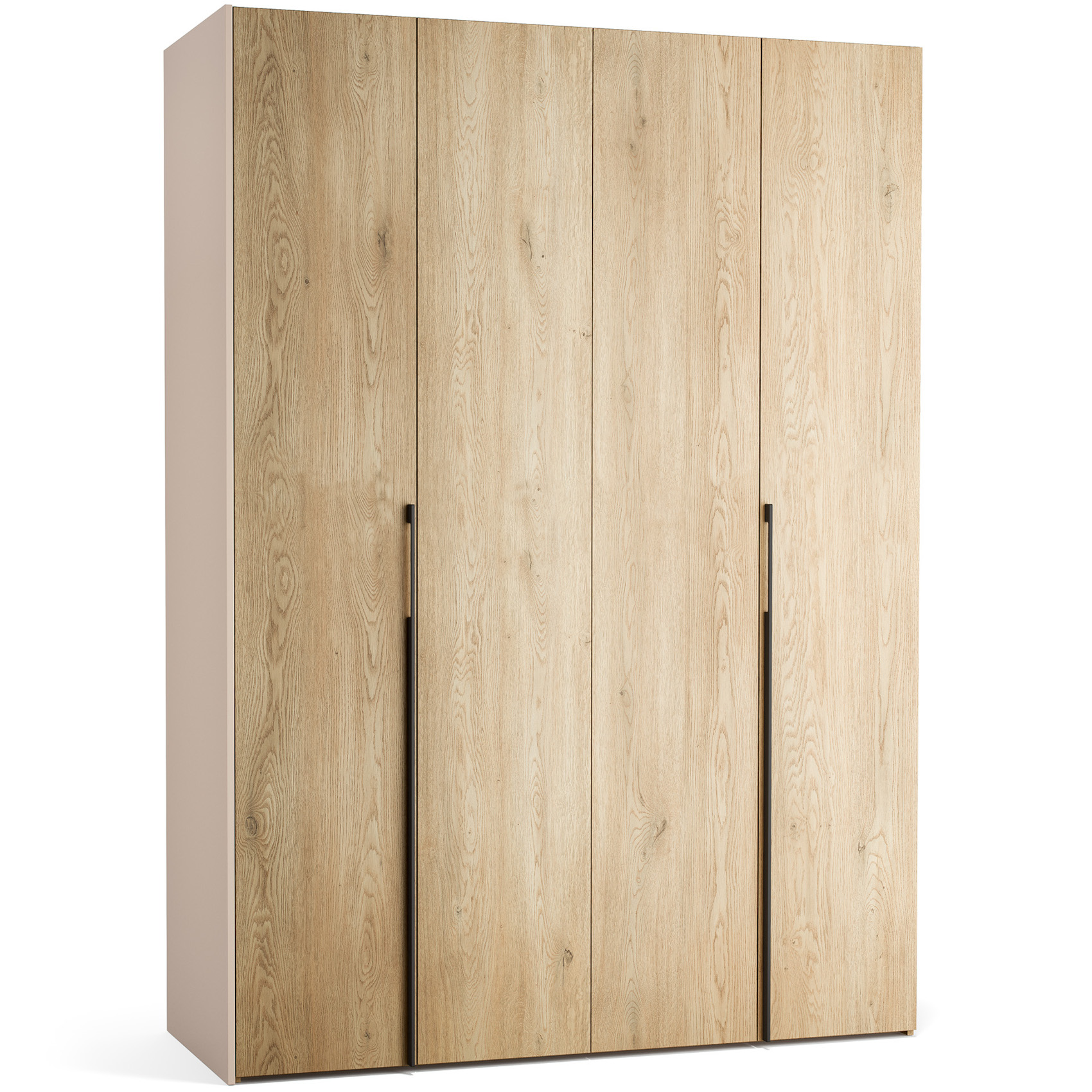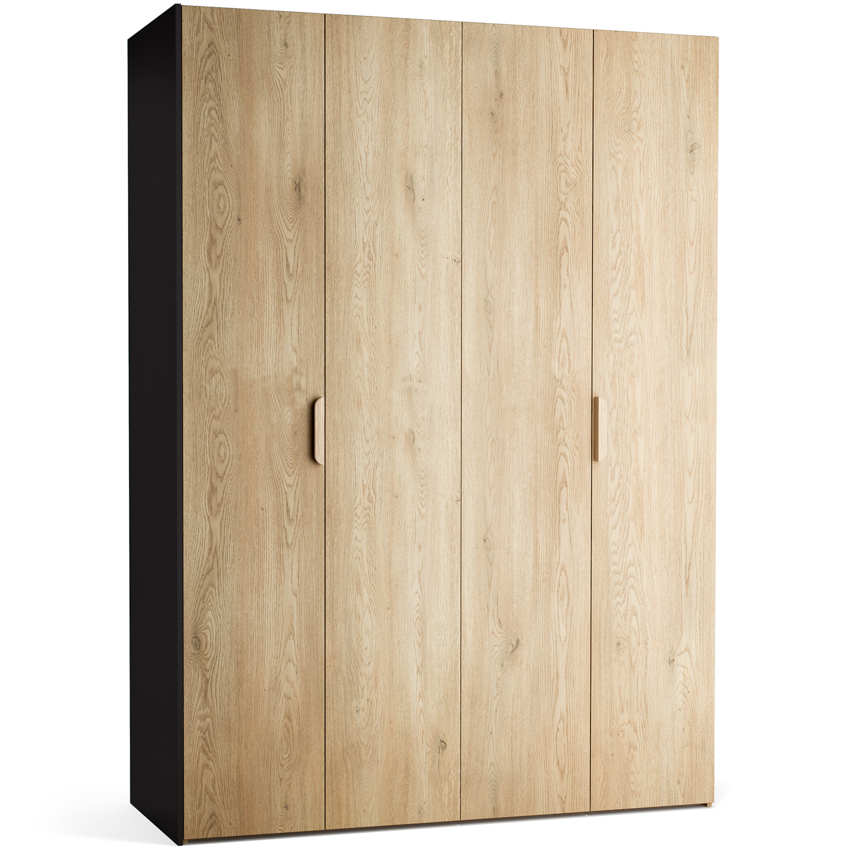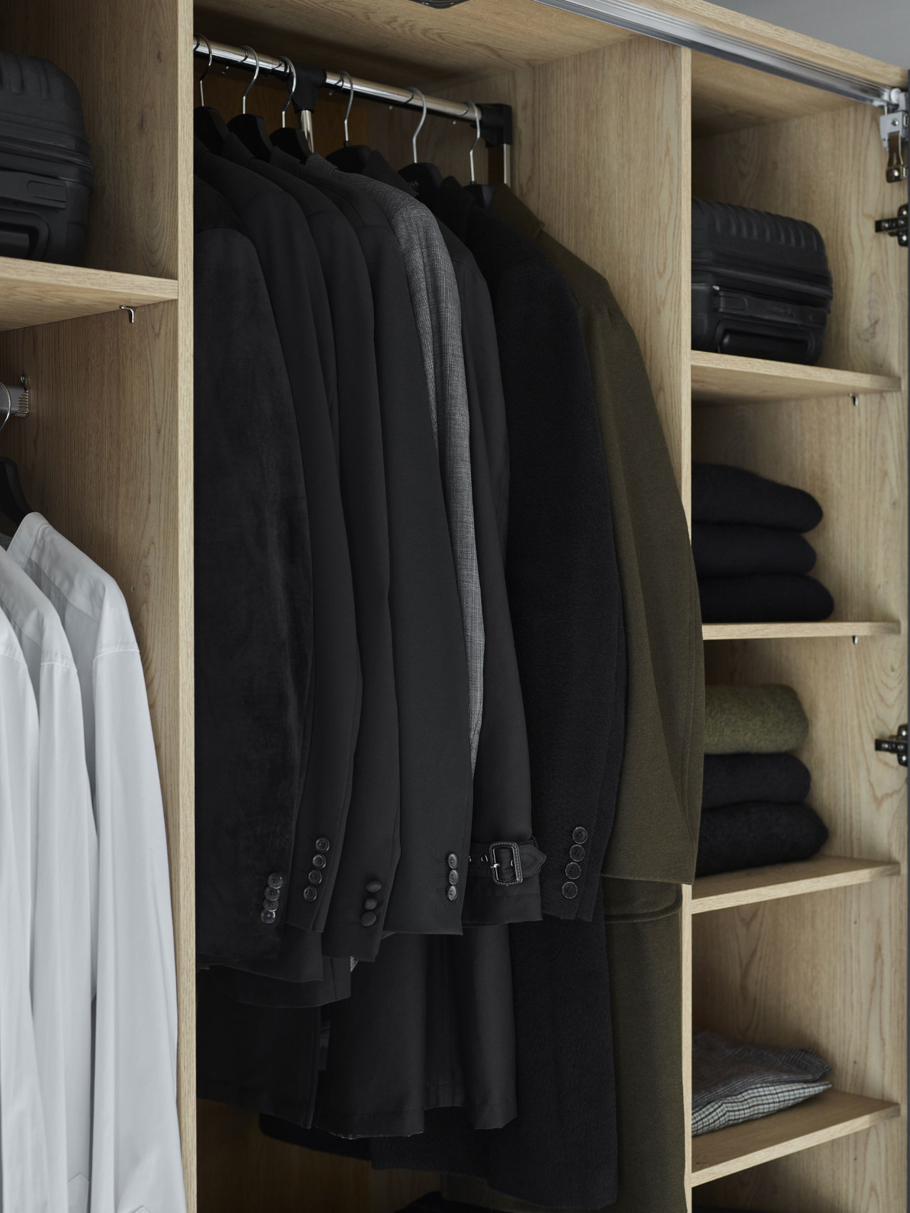 Šatní skříň Stor vás zaujme svým moderním designem s luxusními prvky. Můžete ji využít jako samostatně stojící skříň nebo díky maskovacím panelům snadno nahradí nábytek na míru. Je vyrobena z vysoce kvalitní nábytkové desky, odolná vůči poškození. Úchyty jsou z masivního dubového dřeva nebo z kovu, záleží, jaký ze 6 typů rukojetí si vyberete. Součástí skříně je LED osvětlením s pohybovým senzorem, které se rozsvítí při otevření skříně. Dveře jsou posuvné a skládací do akordeonu. Zároveň mají zabudovaný systém tichého dovírání. Vnitřní část skříně je vždy v odstínu dubu, na vás záleží jakou barvu předních a bočních částí si vyberete.