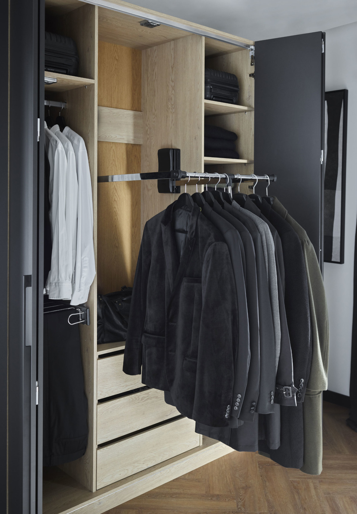 Varianta Easy má 3 pevné lakované horní police, 3 šatní tyče a 7 polic s libovolně nastavitelnou výškou. Comfort má 3 pevné horní police, 3 šatní tyče, 5 polic s libovolně nastavitelnou výškou a skříňku s 3 prostornými zásuvkami na kovových pojezdech. Varianta Maxi obsahuje 2 pevné police, 1 šatní tyč a výsuvný závěs na kalhoty, 5 polic s libovolně nastavitelnou výškou a skříňku s 3 prostornými zásuvkami na kovových pojezdech. Ve středu je ještě spuštěn bar, který vám umožní lepší přístup k oblečení.