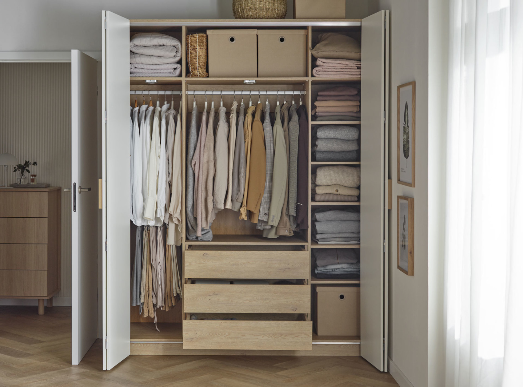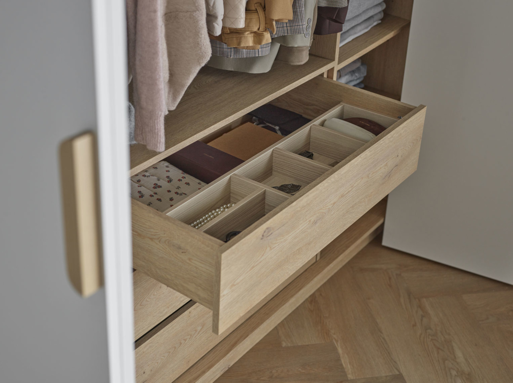 Varianta Easy má 3 pevné lakované horní police, 3 šatní tyče a 7 polic s libovolně nastavitelnou výškou. Comfort má 3 pevné horní police, 3 šatní tyče, 5 polic s libovolně nastavitelnou výškou a skříňku s 3 prostornými zásuvkami na kovových pojezdech.