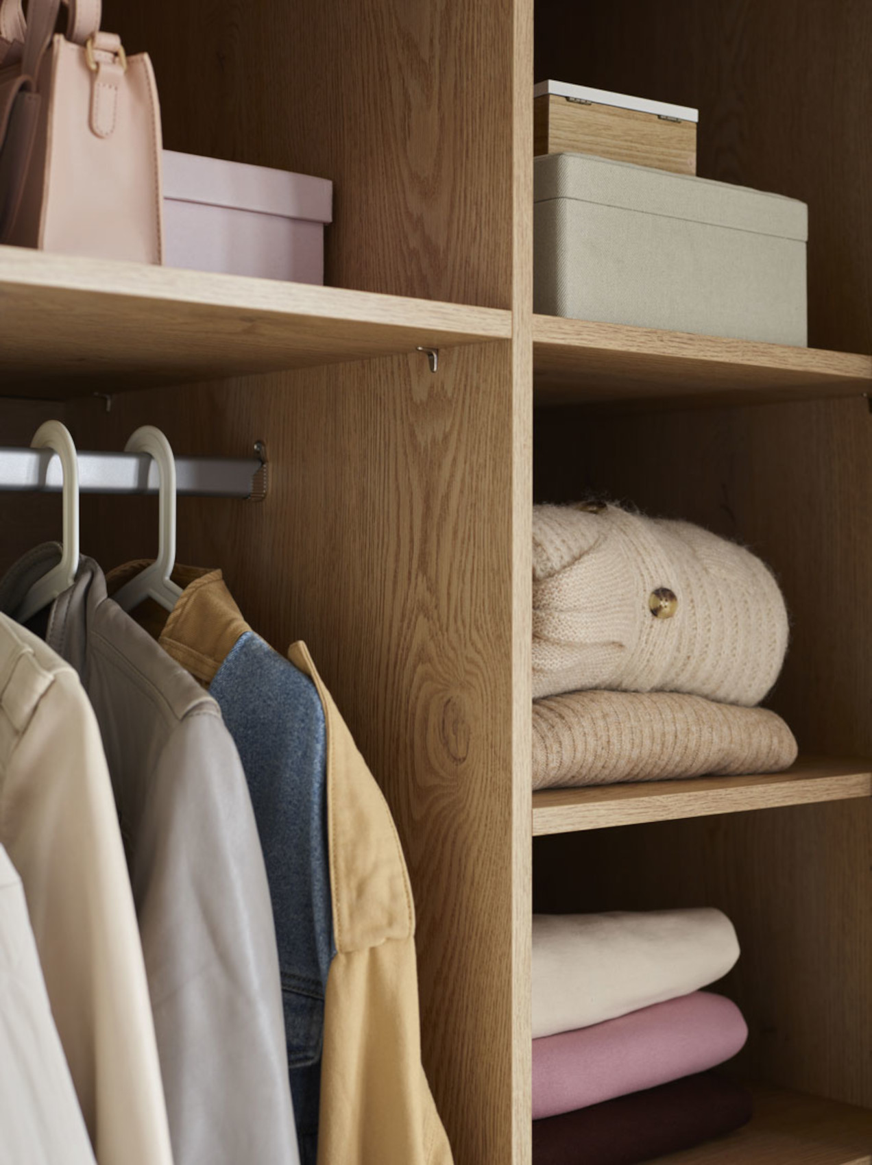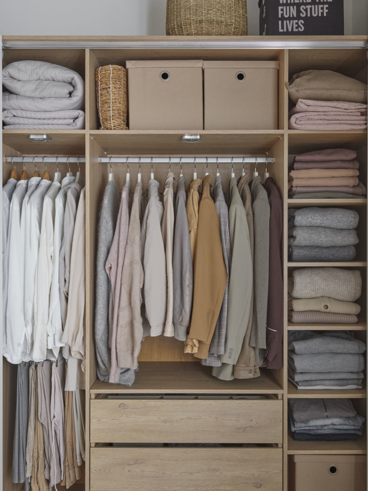Varianta Easy má 3 pevné lakované horní police, 3 šatní tyče a 7 polic s libovolně nastavitelnou výškou. Comfort má 3 pevné horní police, 3 šatní tyče, 5 polic s libovolně nastavitelnou výškou a skříňku s 3 prostornými zásuvkami na kovových pojezdech. Varianta Maxi obsahuje 3 pevné police, 1 šatní tyč, 5 polic s libovolně nastavitelnou výškou a skříňkou se 3 prostornými zásuvkami na kovových pojezdech. Ve střední části je rozbalovací lišta k lepší dostupnosti oblečení.