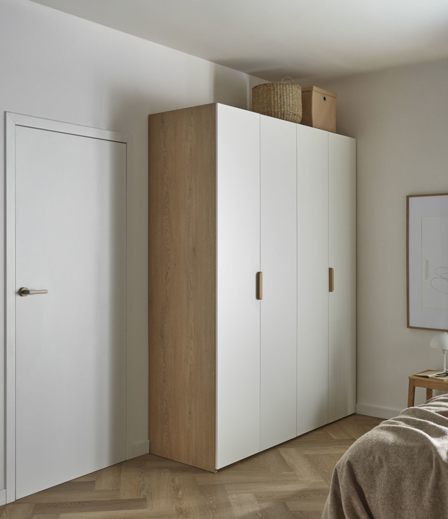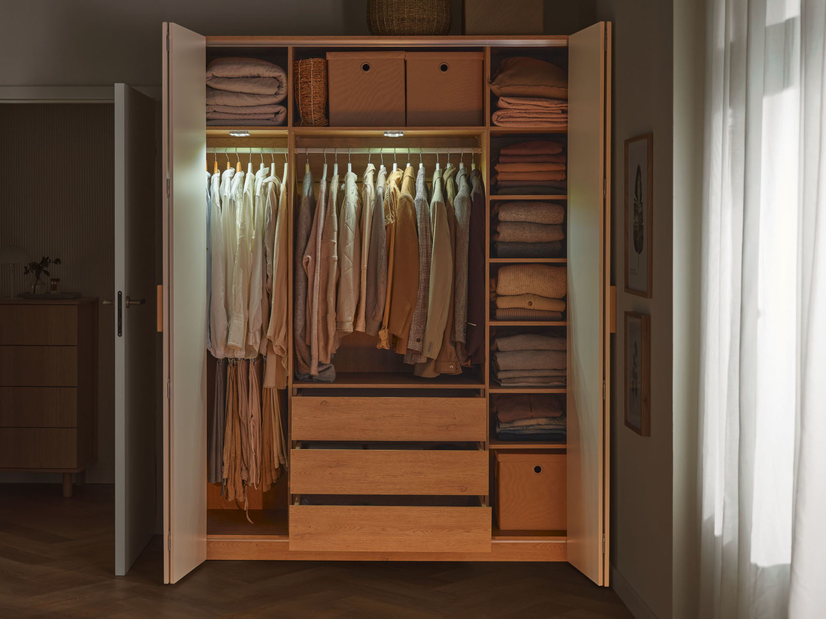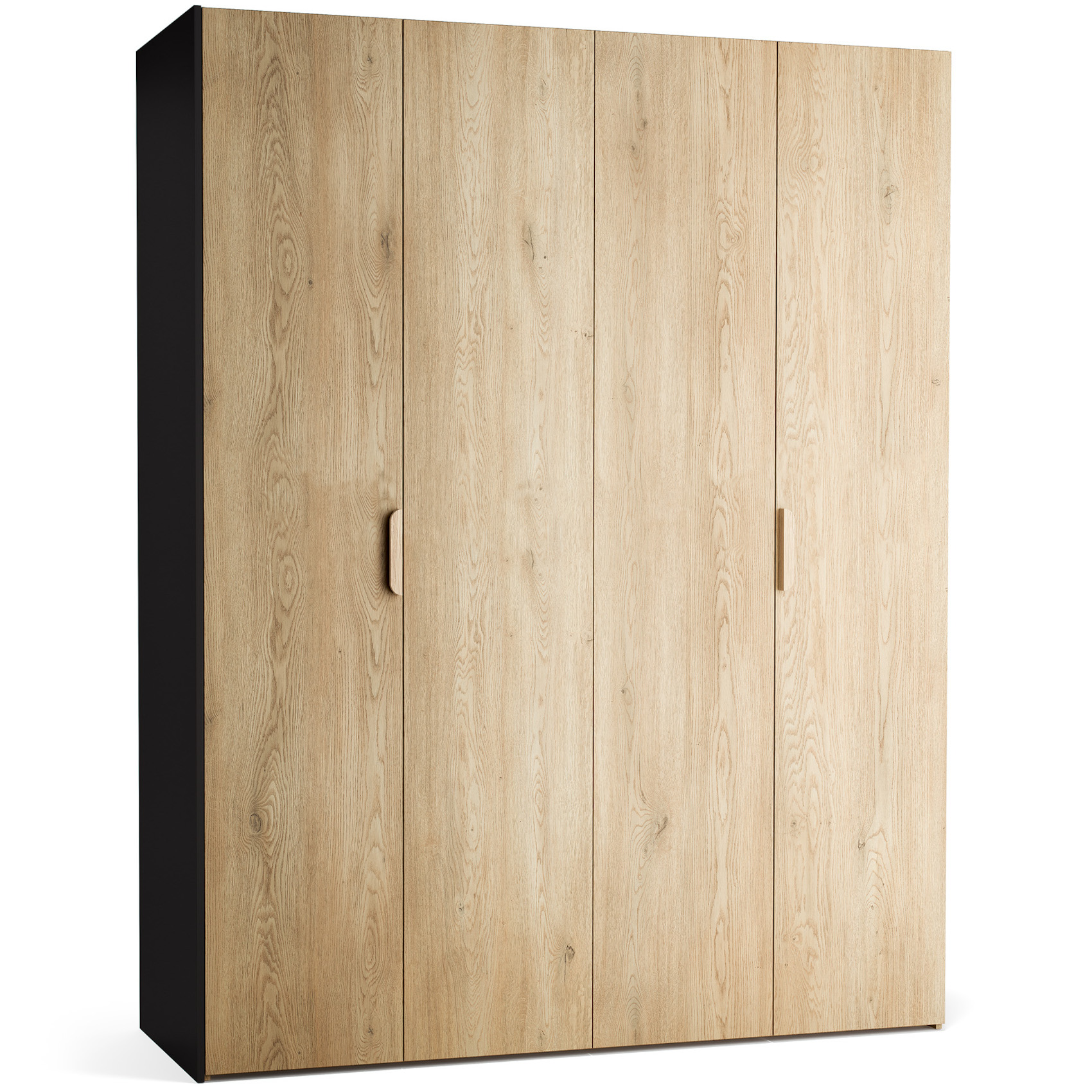 Šatní skříň Stor vás zaujme svým moderním designem s luxusními prvky. Můžete ji využít jako samostatně stojící skříň nebo díky maskovacím panelům snadno nahradí nábytek na míru. Je vyrobena z vysoce kvalitní nábytkové desky, odolná vůči poškození. Úchyty jsou z masivního dubového dřeva nebo z kovu, záleží, jaký ze 6 typů rukojetí si vyberete. Součástí skříně je LED osvětlením s pohybovým senzorem, které se rozsvítí při otevření skříně. Dveře jsou posuvné a skládací do akordeonu. Zároveň mají zabudovaný systém tichého dovírání. Vnitřní část skříně je vždy v odstínu dubu, na vás záleží jakou barvu předních a bočních částí si vyberete.