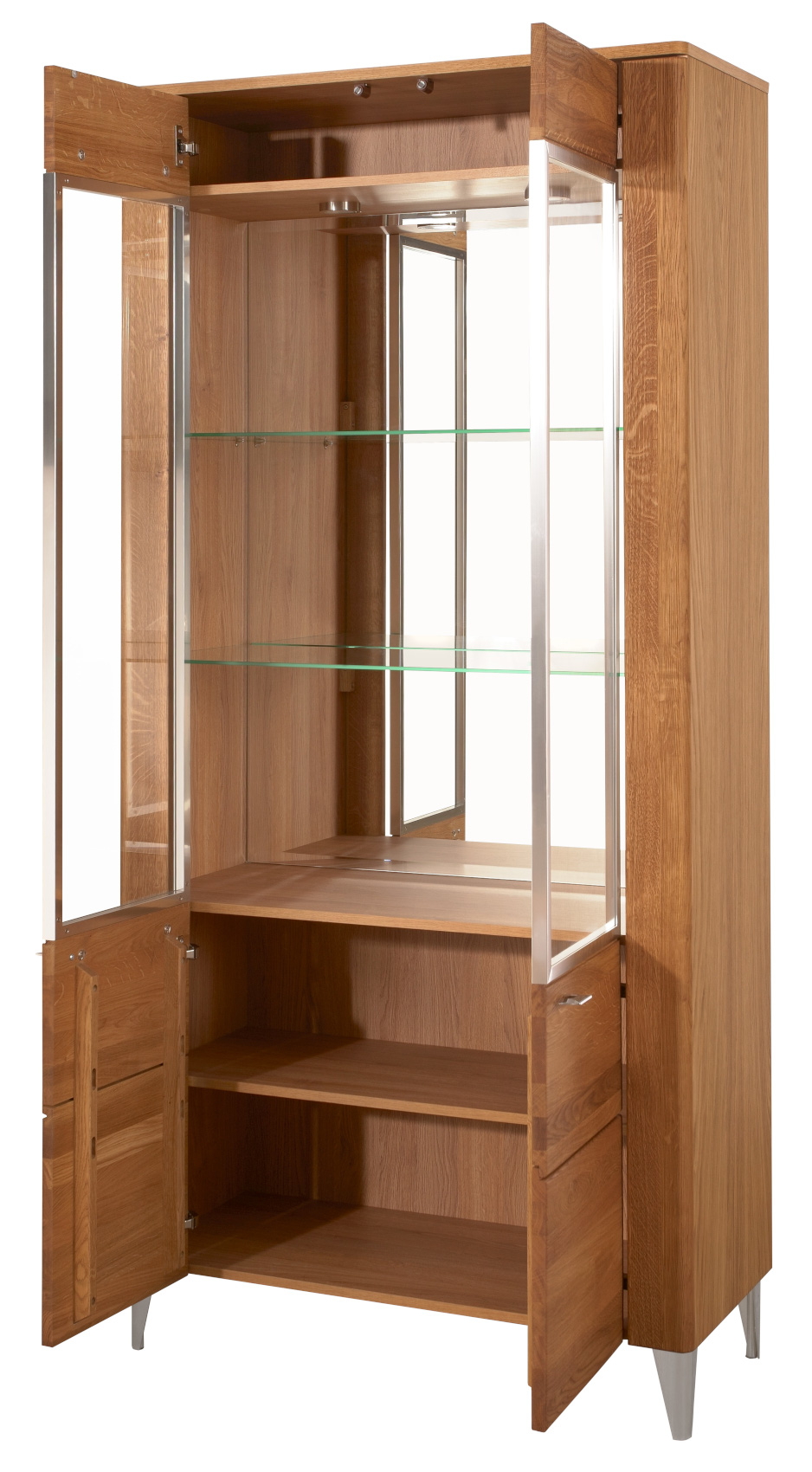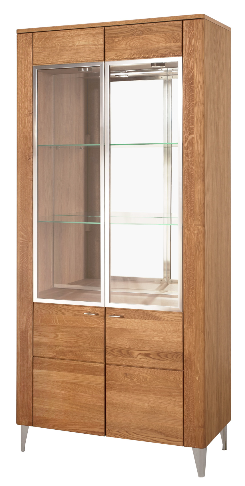 Moderní dvoudveřová vitrína Latina 12 vás zaujme svým přírodním designem se strukturou dřevěných lét s chromovými detaily. Přední dvířka jsou vyrobena z masivního dubového dřeva a korpus z přírodní dubové dýhy. Vitrína stojí na chromových nožkách, které provzdušní celý váš interiér a úchyty jsou vyrobeny také z chromu.