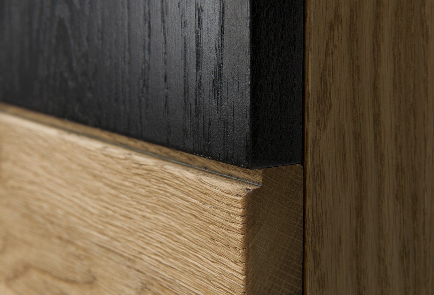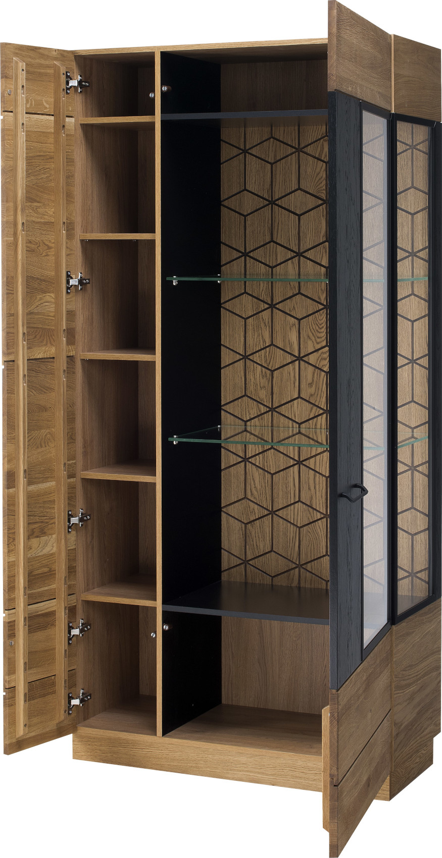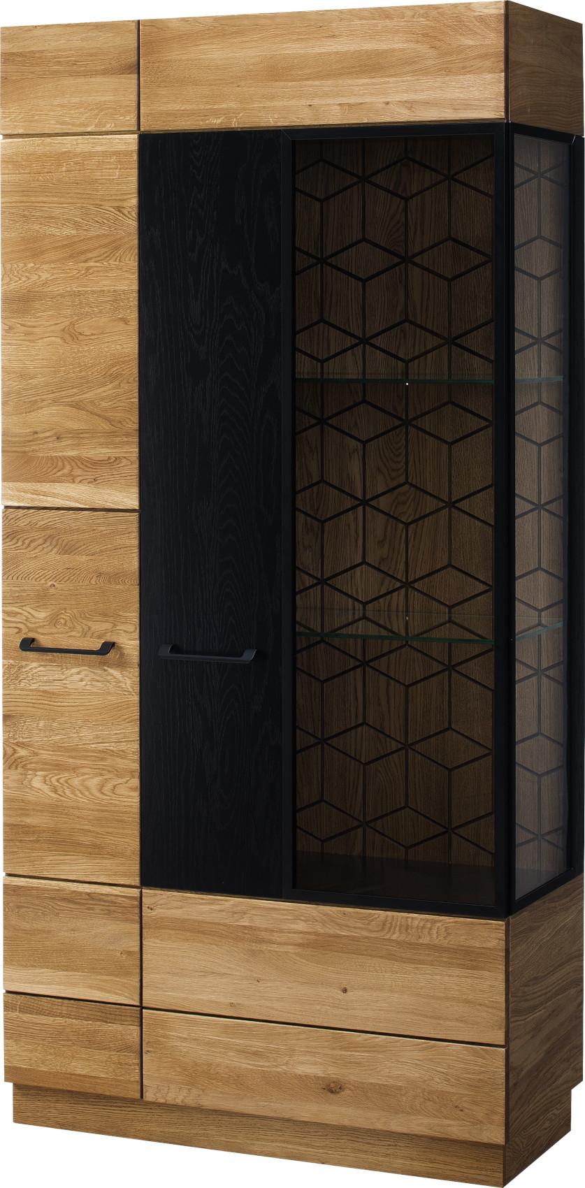 Moderní dvoudveřová vitrína Mosaic vás zaujme svým luxusním designem se strukturou přírodního dřeva. Přední část vitríny je vyrobena z masivního dubového dřeva a korpus z přírodní dubové dýhy. Jedinečnými prvky jsou černé matné lakované detaily na dvířkách a zadní stěně vitríny. Dvířka mají černě matné úchyty.