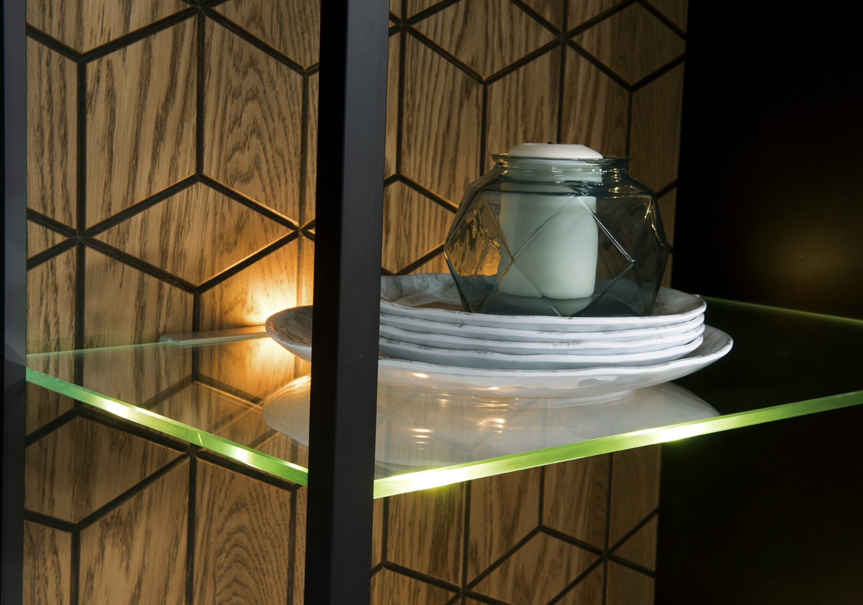 Ve vnitřním prostoru, na pravé straně, jsou vloženy 2 skleněné a 2 lakované police. Na levé straně je 5 lakovaných polic.