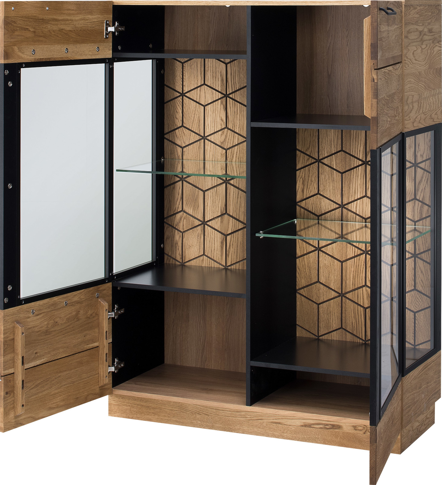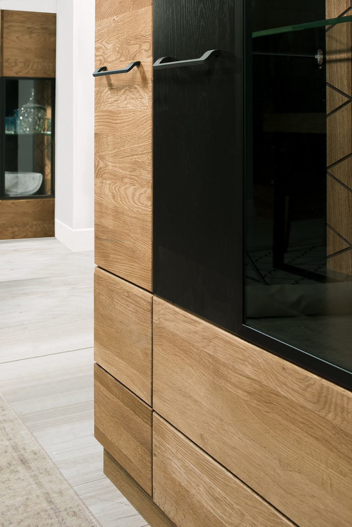 Moderní dvoudveřová vitrína Mosaic 15 nízká vás zaujme svým luxusním designem se strukturou přírodního dřeva. Přední část vitríny je vyrobena z masivního dubového dřeva a korpus z přírodní dubové dýhy. Jedinečnými prvky jsou černé matné lakované detaily na dvířkách a zadní stěně vitríny. Dvířka i zásuvky mají černě matné úchyty.