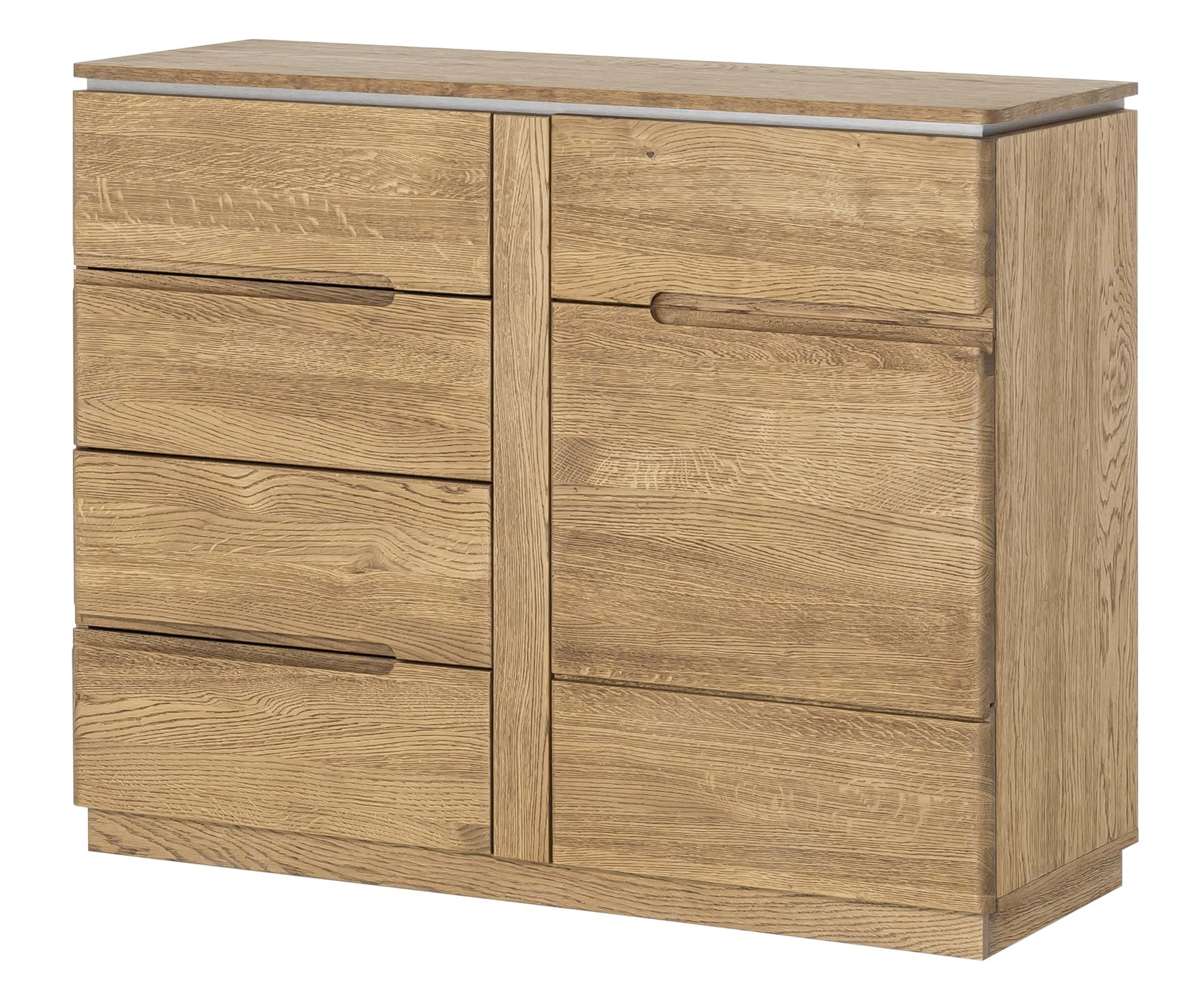 Moderní komoda Montenegro 44 vás zaujme svým elegantní designem. Přední část je vyrobena z masivního dubové dřeva a korpus z přírodní dubové dýhy. Jedinečným prvkem celého systému jsou kovové detaily pod horní deskou.