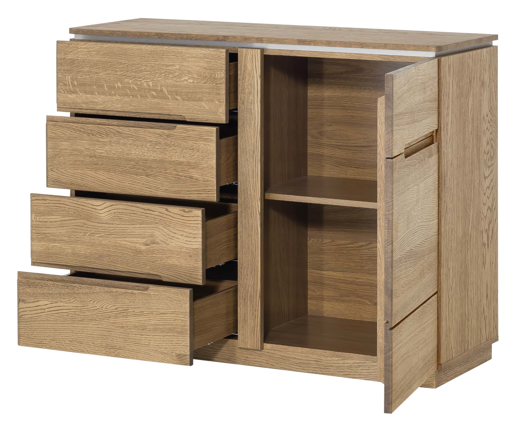 Komoda má 1 plná dvířka, za kterými je vložena 1 lakovaná police. Na levé straně jsou 4 zásuvky na kovových pojezdech.