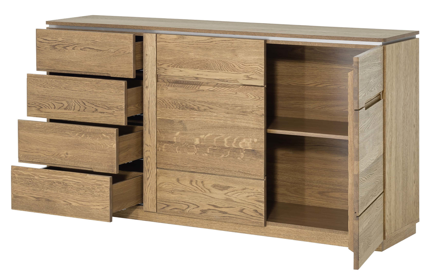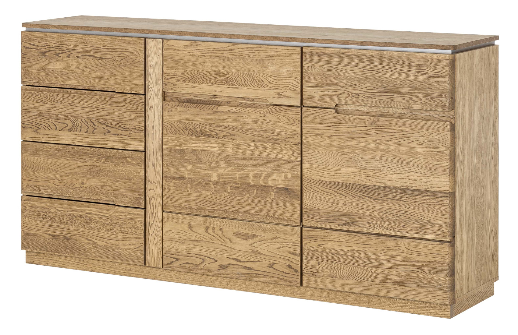 Moderní komoda Montenegro 45 vás zaujme svým elegantní designem. Přední část je vyrobena z masivního dubové dřeva a korpus z přírodní dubové dýhy. Jedinečným prvkem celého systému jsou kovové detaily pod horní deskou.