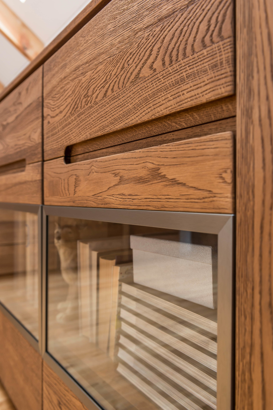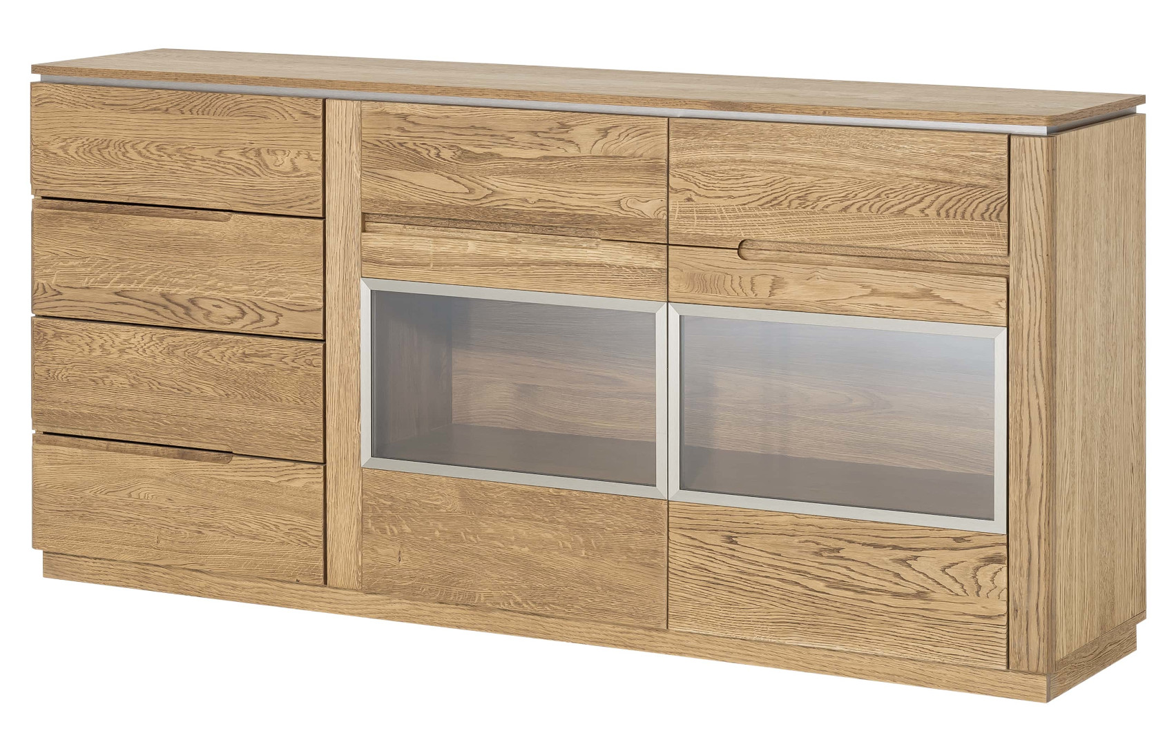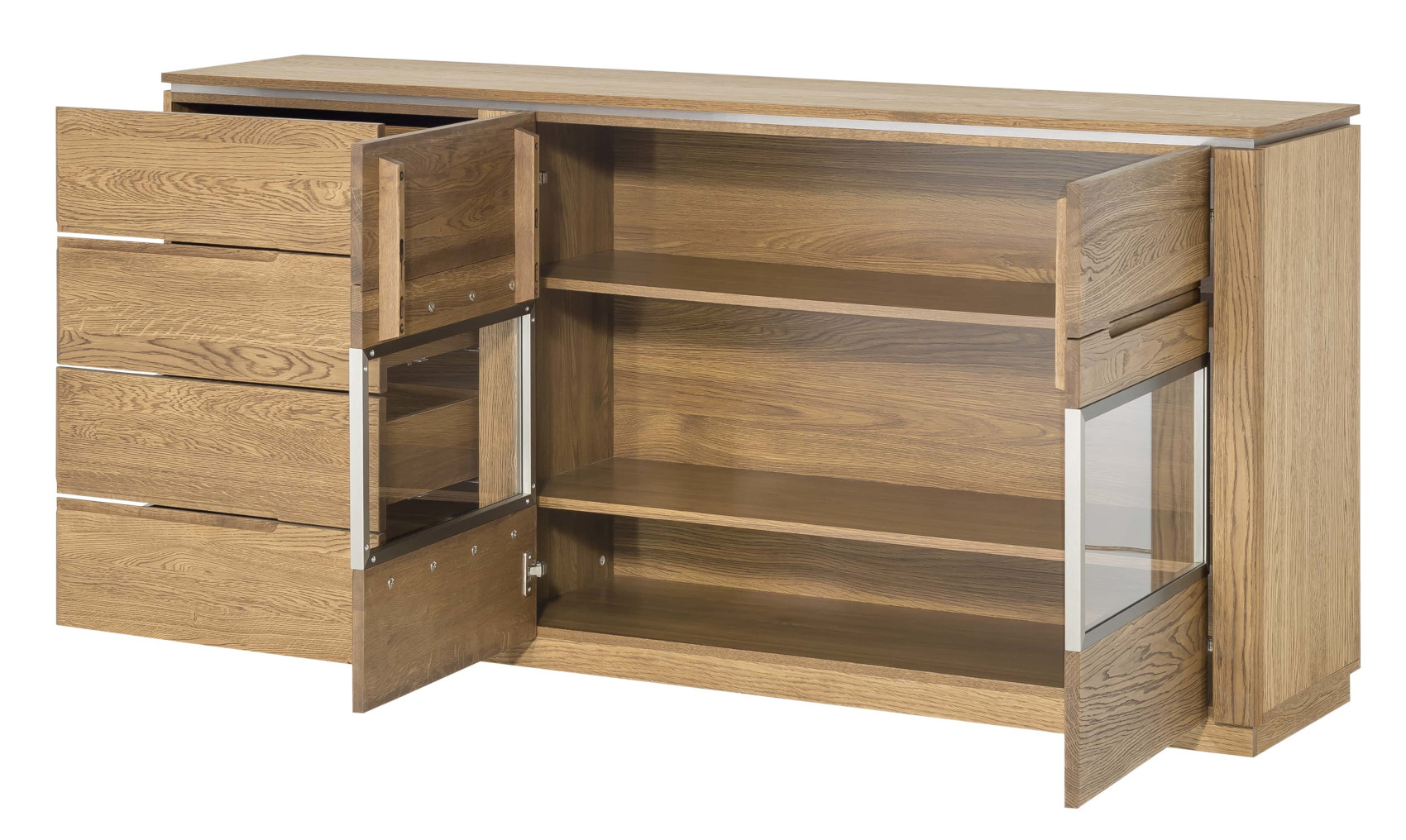 Moderní komoda Montenegro 47 vás zaujme svým elegantní designem. Přední část je vyrobena z masivního dubové dřeva a korpus z přírodní dubové dýhy. Jedinečným prvkem celého systému jsou kovové detaily pod horní deskou.