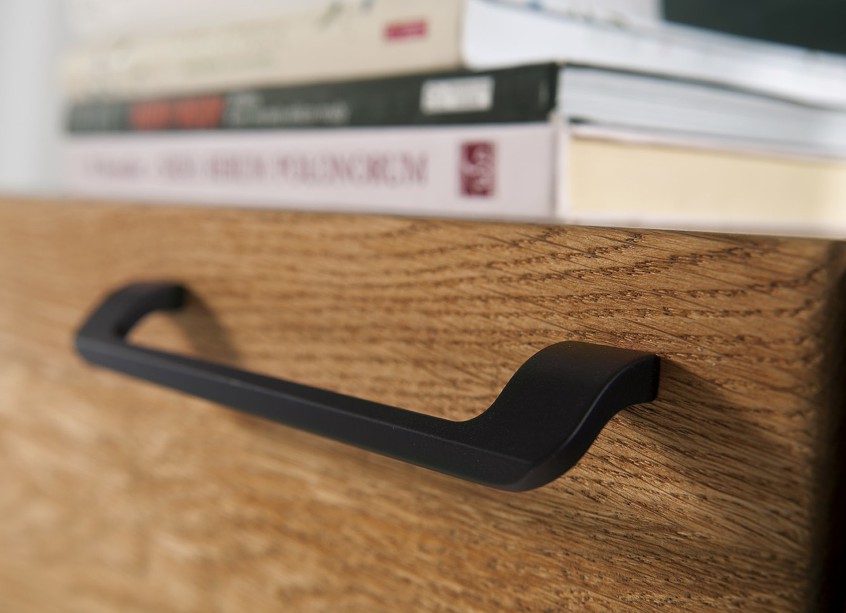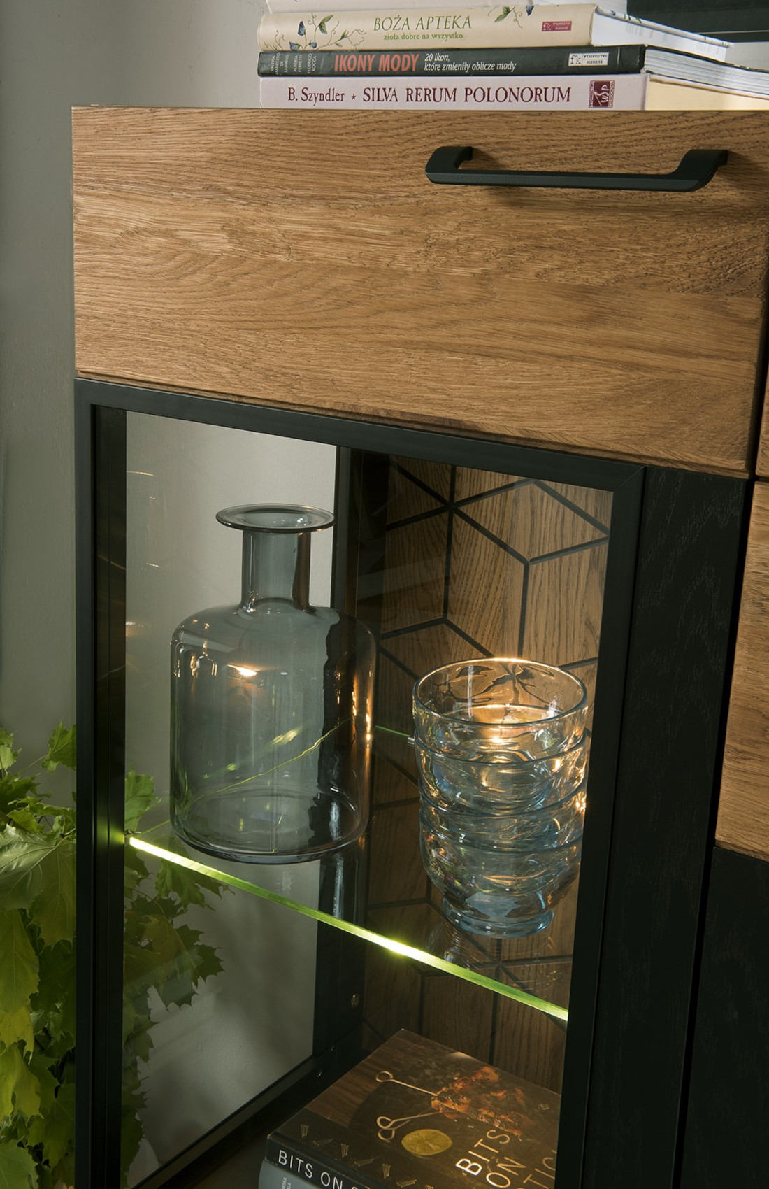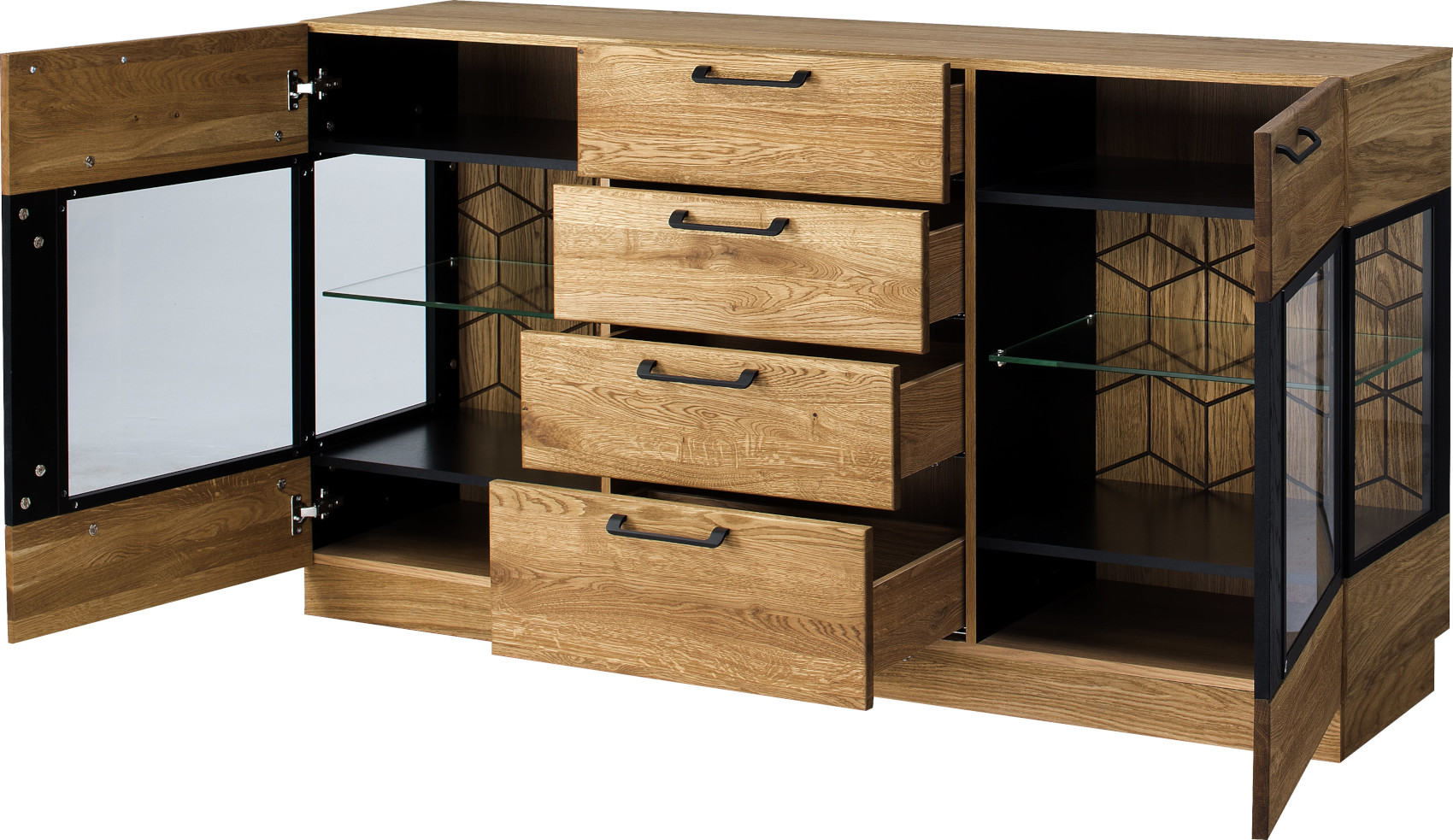 Moderní komoda Mosaic 47 vás zaujme svým luxusním designem se strukturou přírodního dřeva. Přední část komody je vyrobena z masivního dubového dřeva a korpus z přírodní dubové dýhy. Jedinečnými prvky jsou černé matné lakované detaily na dvířkách a zadní stěně vitríny. Dvířka i zásuvky mají černě matné úchyty.