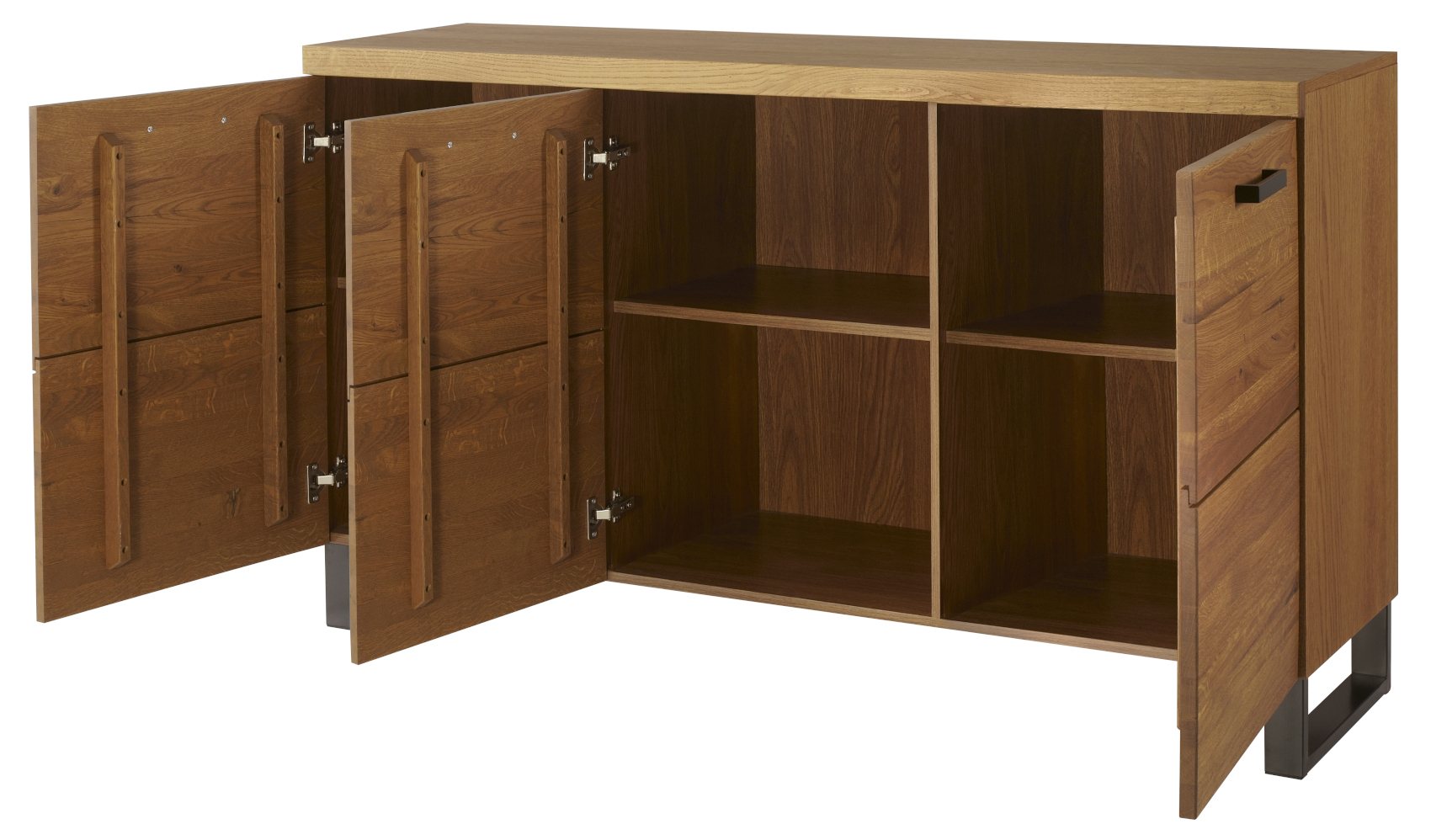 Moderní komoda Pratto 45 vás zaujme svým luxusním přírodním designem. Je vyrobena z masivního dubového dřeva a přírodní dubové dýhy s černě matnými lakovanými detaily. Jedinečným prvkem jsou viditelné struktury dřevěných lét a černé kovové úchyty. Vitrína stojí na černých kovových nožkách, které provzdušní váš celkový interiér.