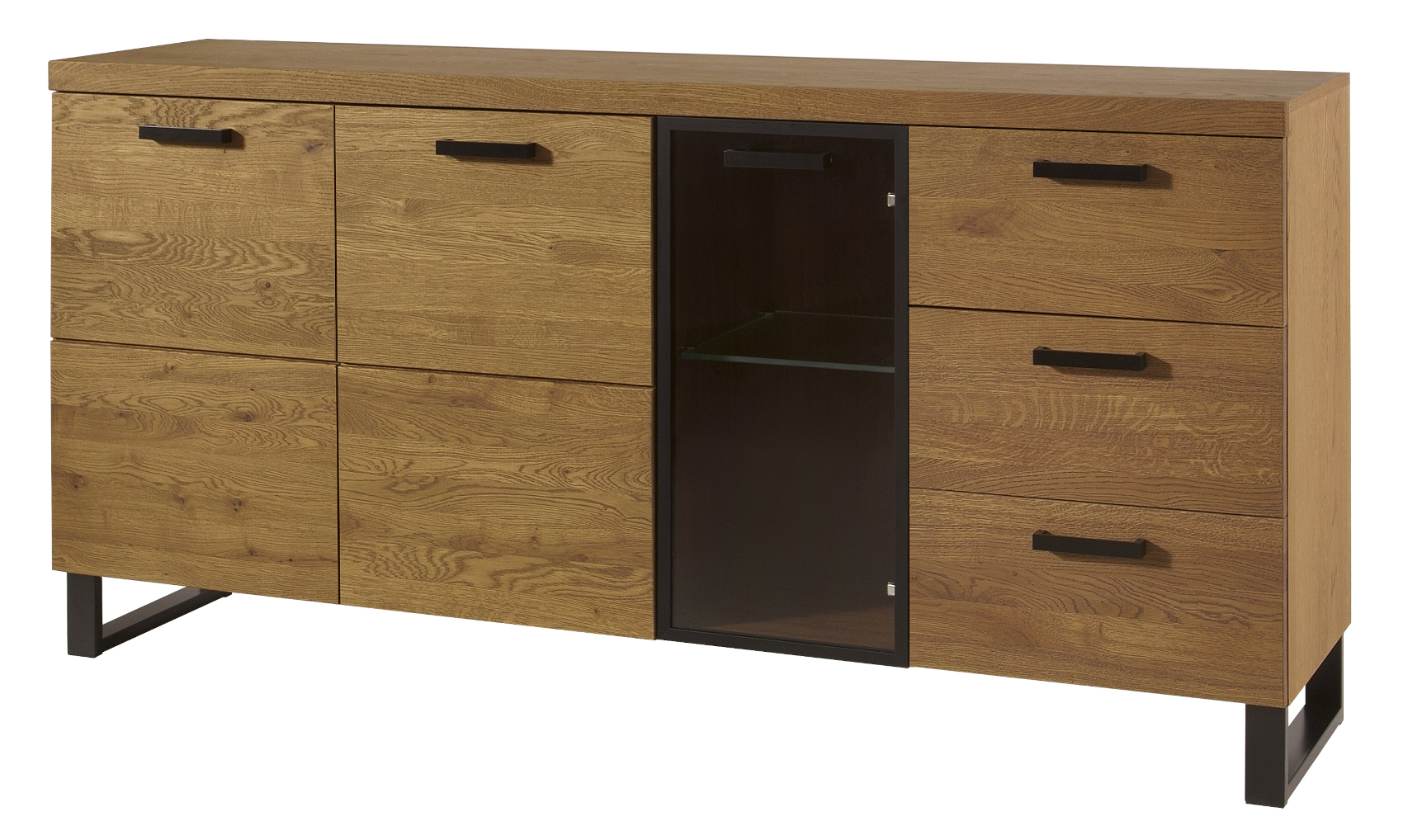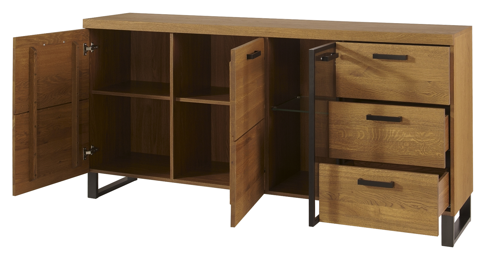 Komoda má 2 plná dvířka, za kterými jsou vloženy 2 lakované police a za prosklenými dvířky je 1 skleněná police. Na kraji jsou 3 zásuvky na kovových pojezdech.
