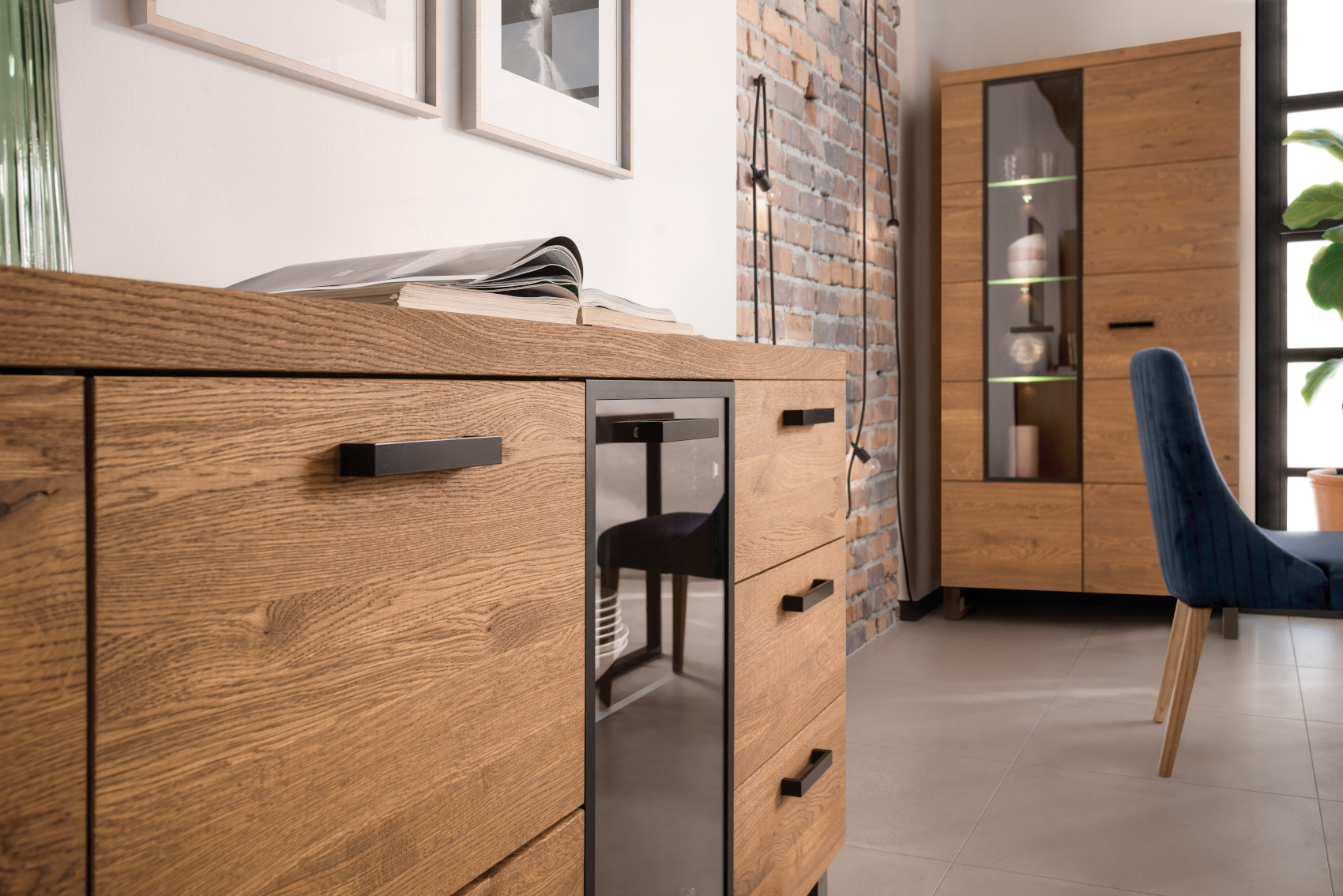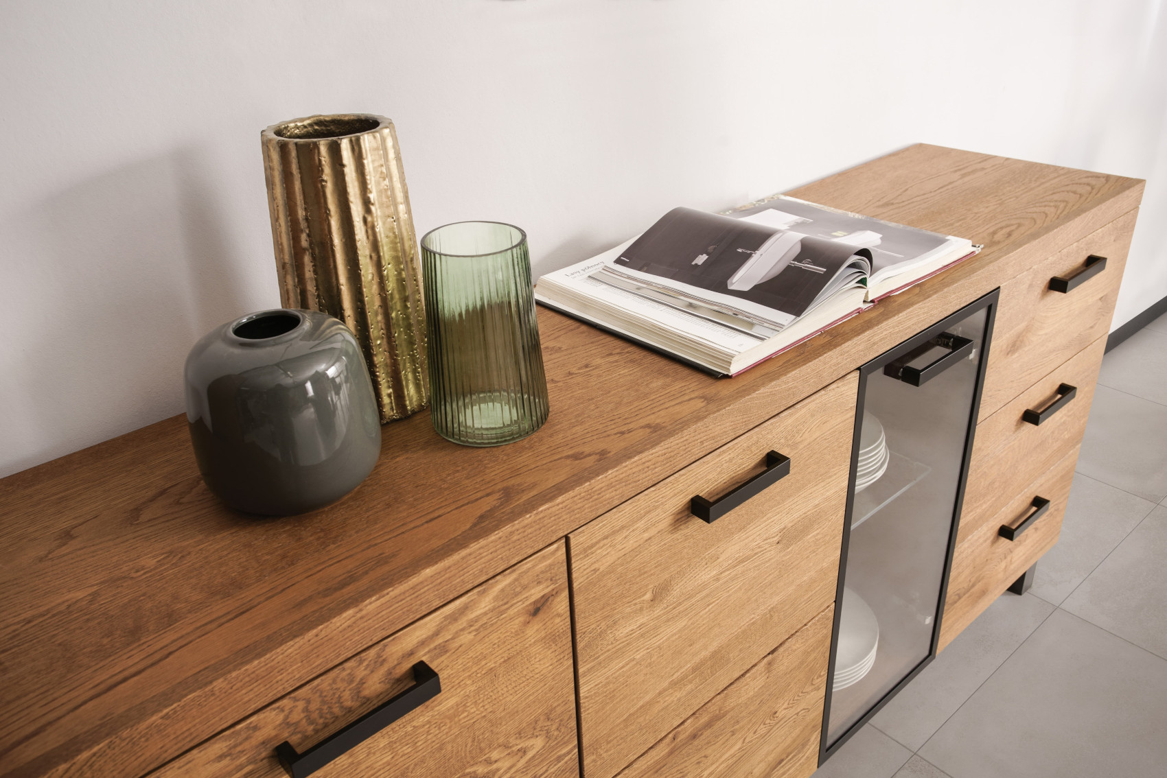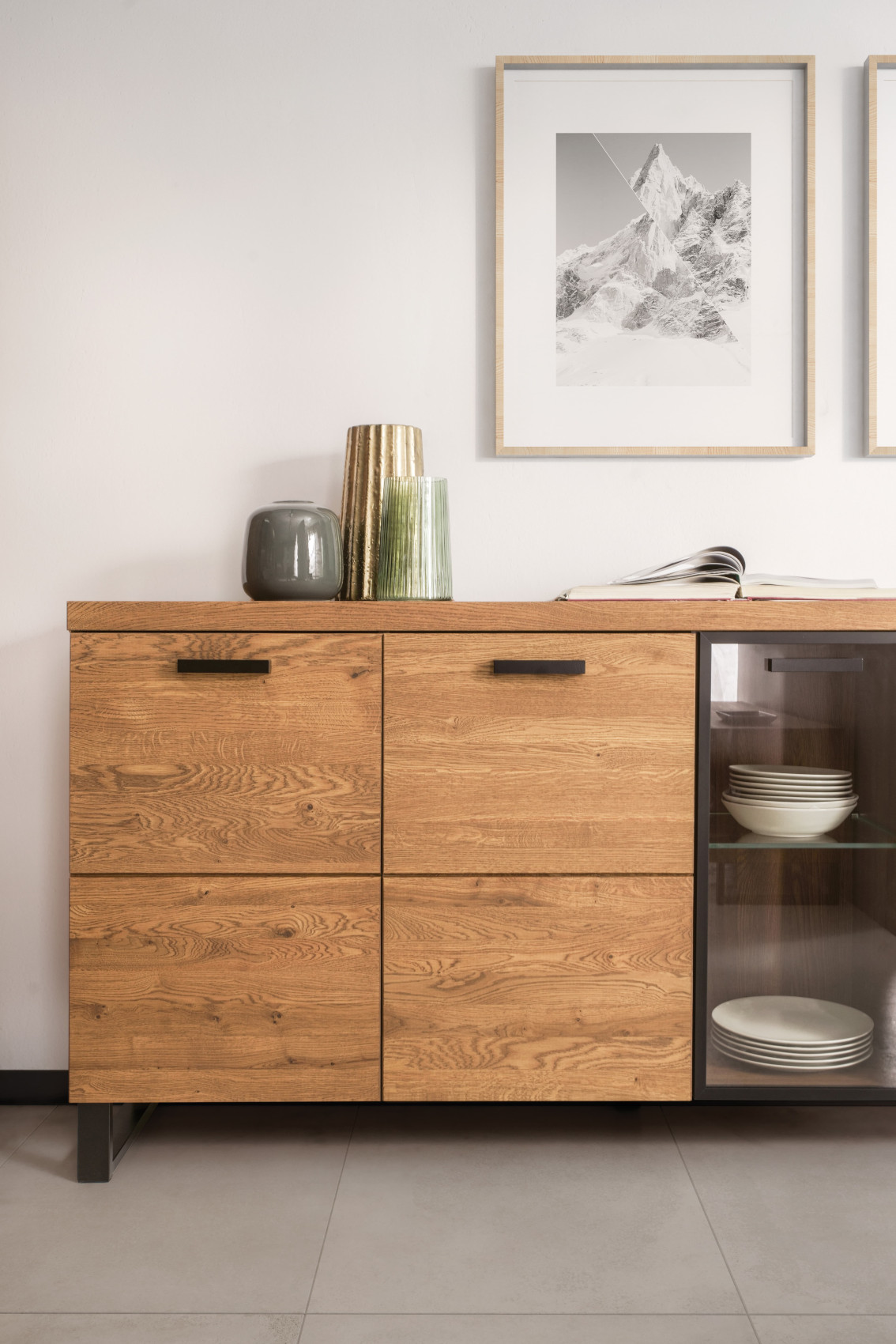 Moderní komoda Pratto 47 vás zaujme svým luxusním přírodním designem. Je vyrobena z masivního dubového dřeva a přírodní dubové dýhy s černě matnými lakovanými detaily. Jedinečným prvkem jsou viditelné struktury dřevěných lét a černé kovové úchyty. Komoda stojí na černých kovových nožkách, které provzdušní váš celkový interiér.