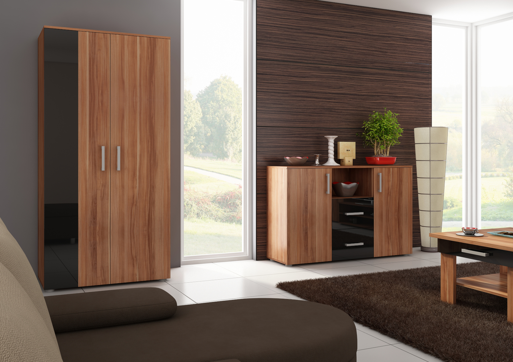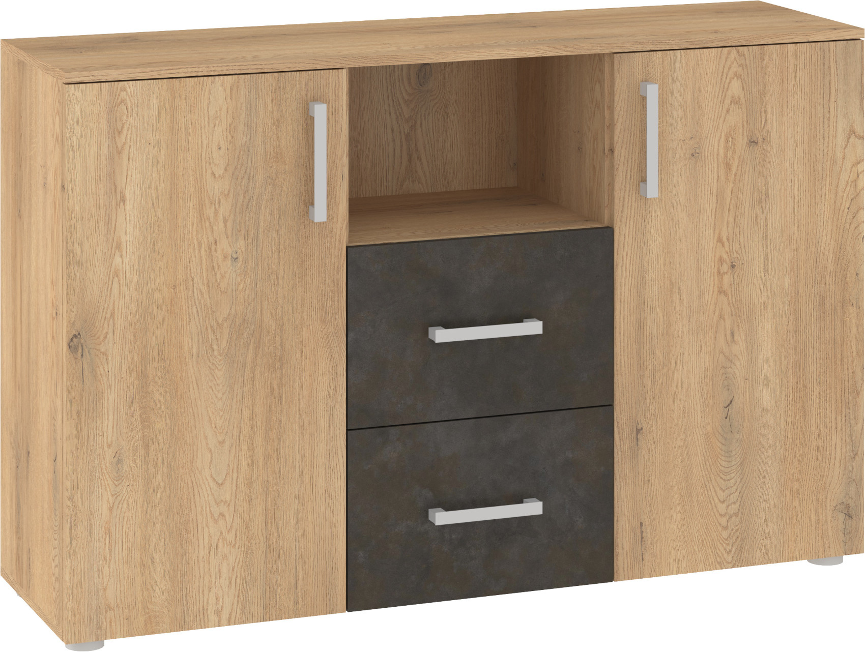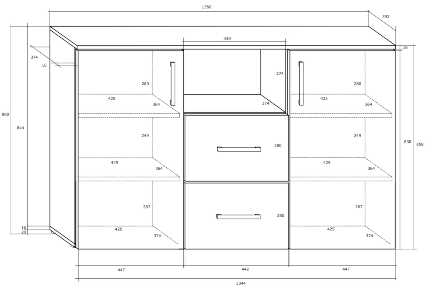 Součástí komody jsou 2 plná dvířka, za kterými jsou vloženy 4 lakované police. Uprostřed jsou 2 prostorné zásuvky na kovových pojezdech. Nad zásuvkami je otevřená nika k uložení vašich nezbytností.