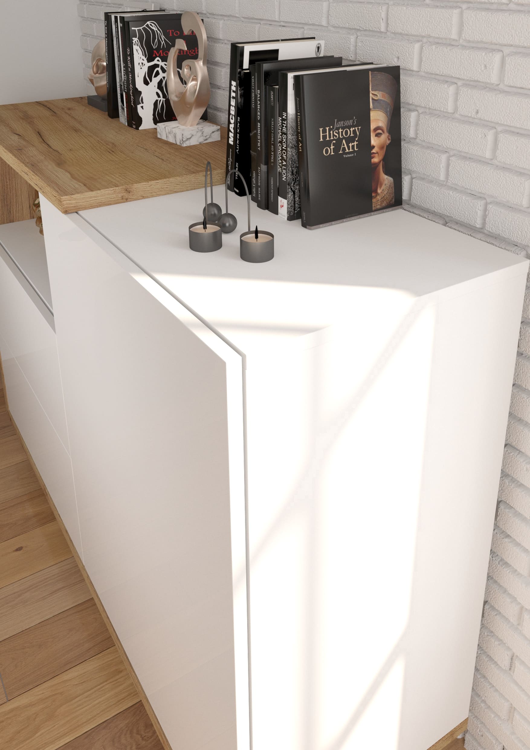 Komoda Hybrid 05 disponuje 3 otevřenými policemi a skříňkou s poličkou uvnitř. Dodáváme v demontu.