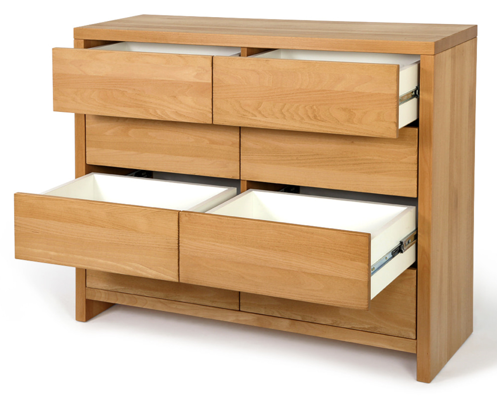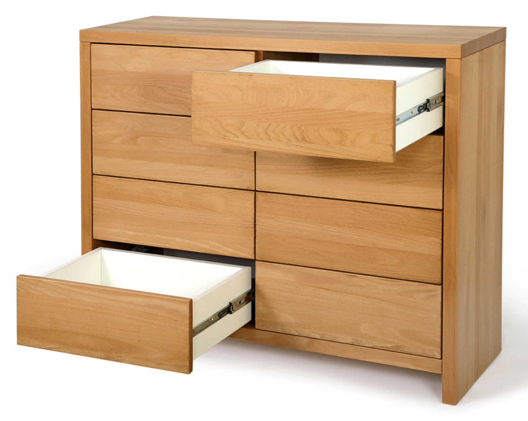 Moderní komoda LEVITTA vás zaujme svým jednoduchým a elegantním designem. Je vyrobena z masivního bukového dřeva o síle 4 cm, které vám zaručí kvalitu, odolnost a stabilitu. Součástí komody jsou prostorné zásuvky na kovových pojezdech (široká varianta komody má 8 zásuvek)Zásuvky mají zabudovaný jednoduchý dotykový systém otevírání Push to open.