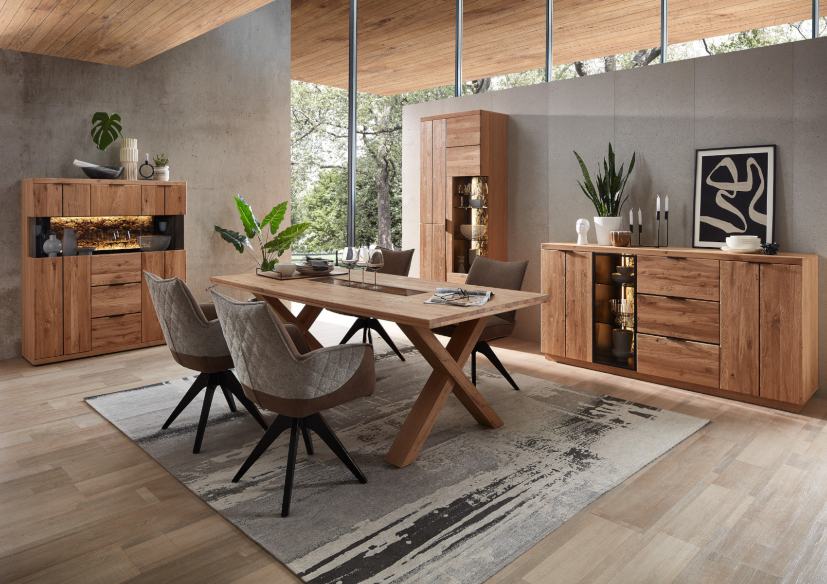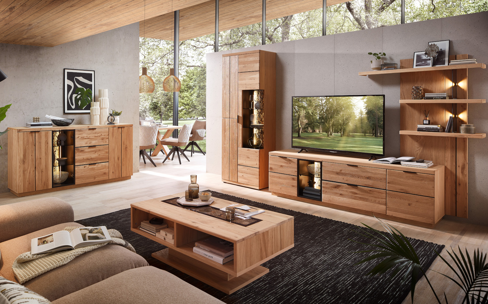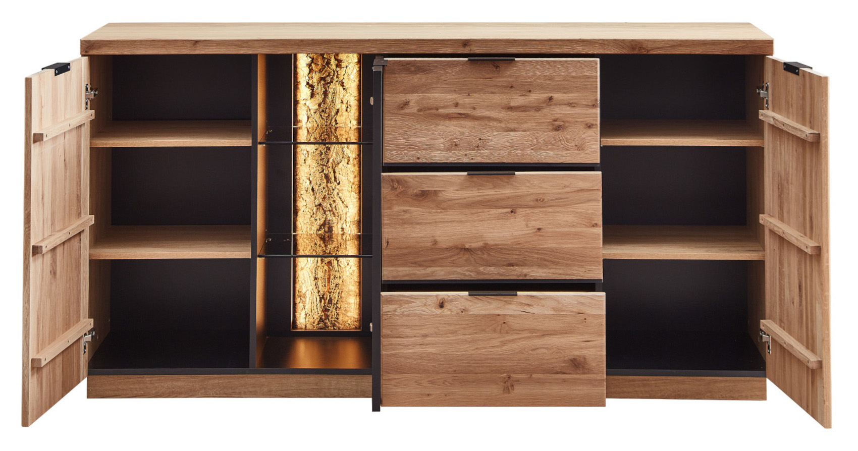 Třídveřová moderní komoda Napoli 20 vás zaujme svým přírodním designem s viditelnou strukturou dřevěných lét. Přední dvířka a zásuvky, se systémem tichého dovírání, jsou vyrobeny z masivního dubového dřeva a korpus z přírodní dubové dýhy, která je potažena fólií. Součástí komody jsou kovové černě lakované úchyty, které dodají nábytku nádech elegance. Nábytek stojí na velmi nízkých černých plastových nožkách.