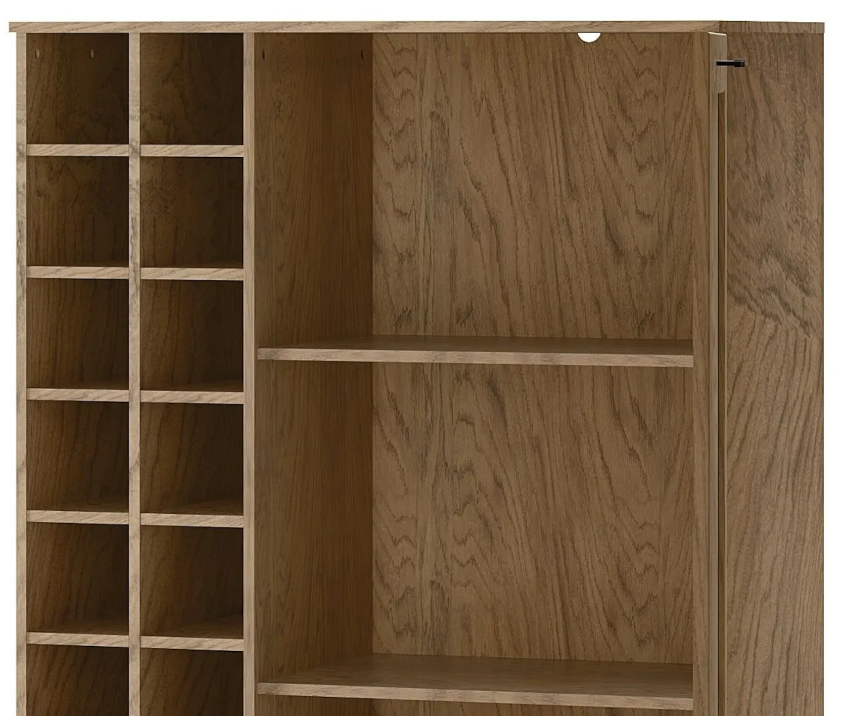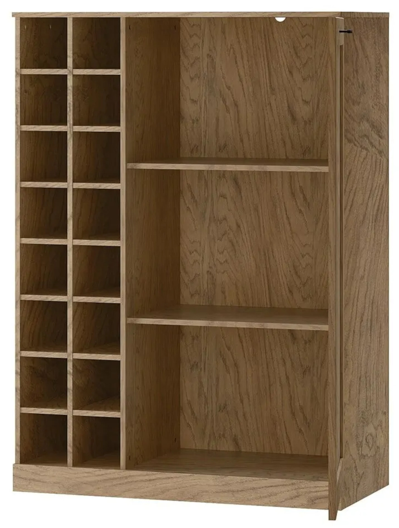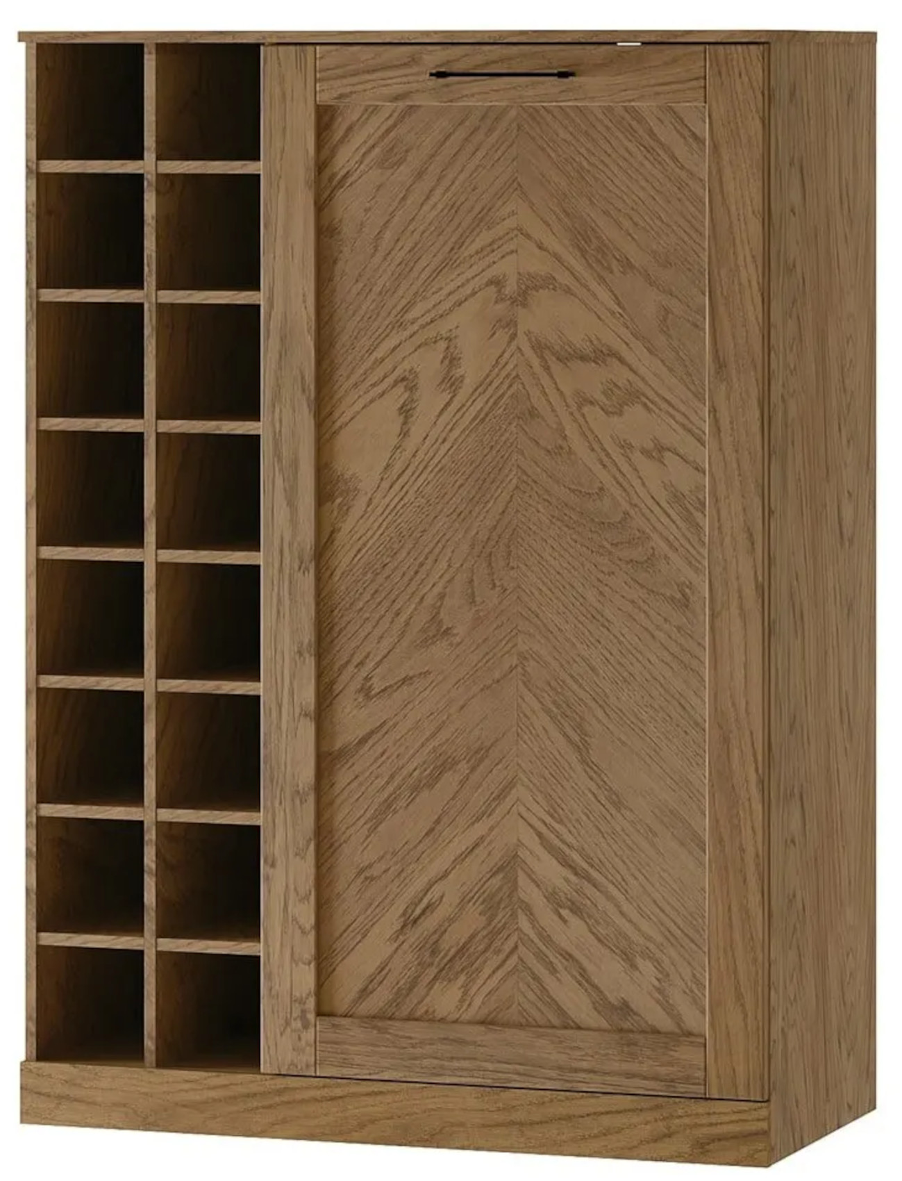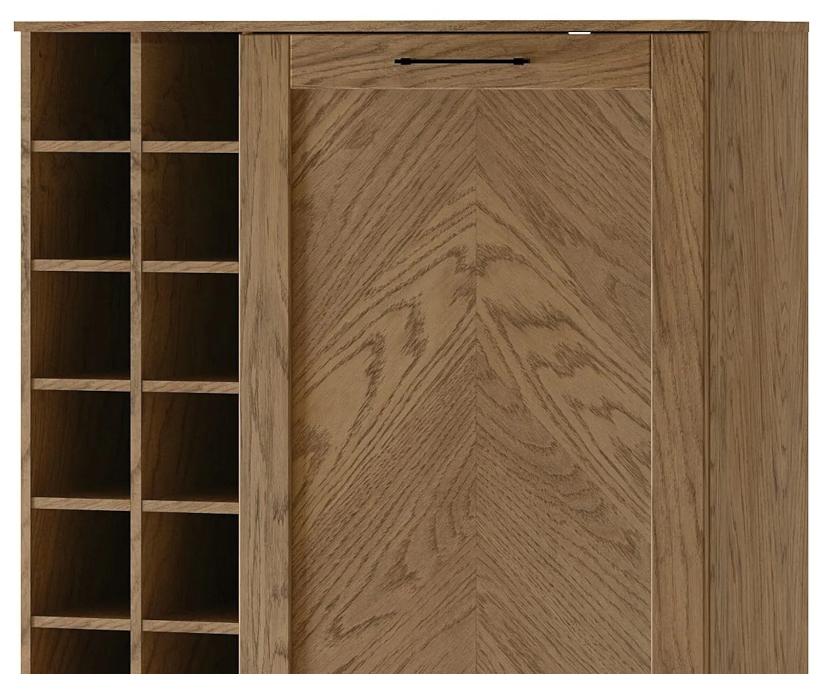 Moderní barová komoda Cozy 15 vás zaujme svým přírodním designem s viditelnou strukturou dřevěných lét. Přední dvířka, se systémem tichého dovírání, jsou vyrobena z masivního dubového dřeva a korpus z přírodní dubové dýhy, která je potažena fólií. Součástí komody jsou kovové úchyty v odstínu černý mat, které dodají nábytku nádech elegance.