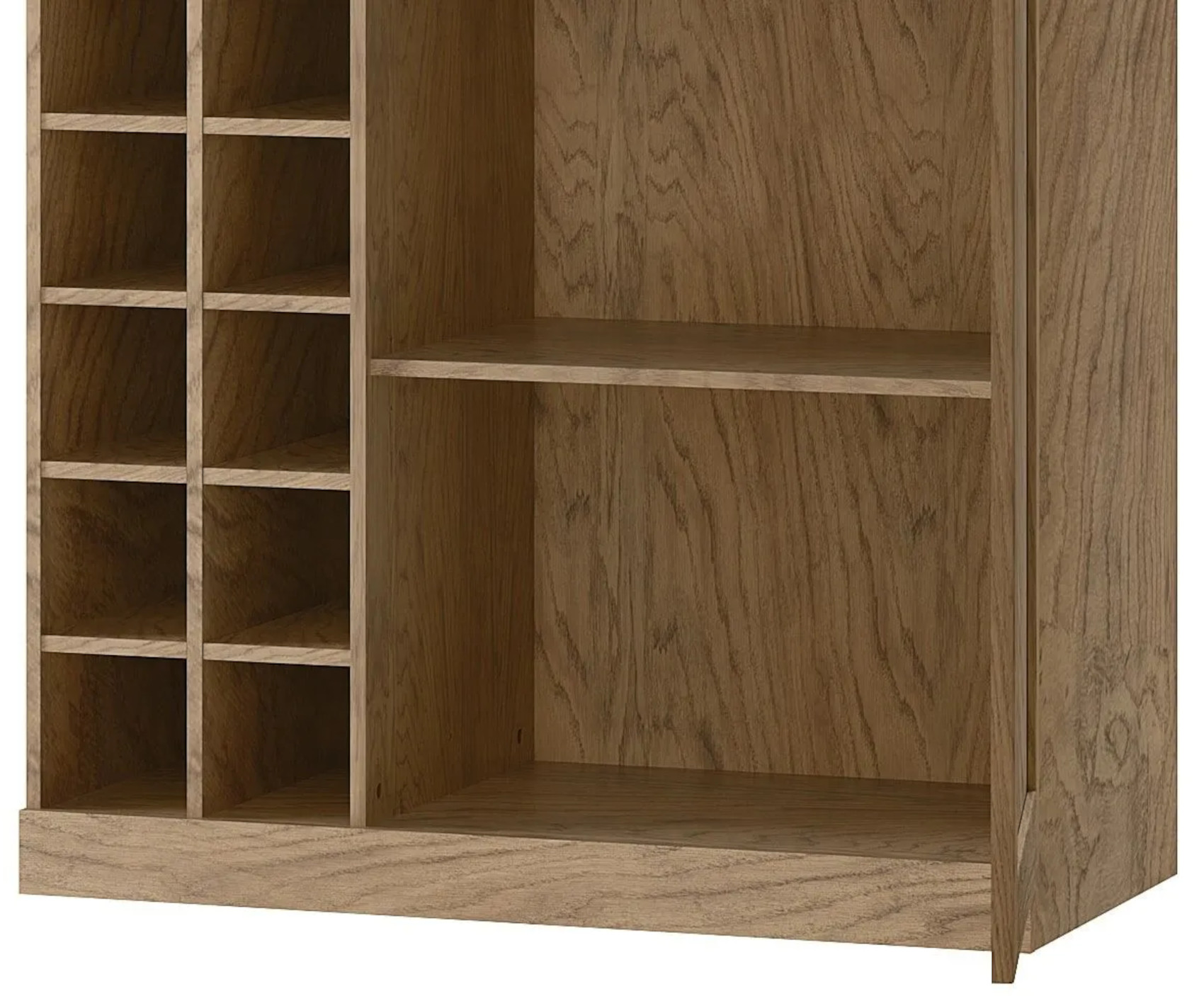 Za plnými dvířky jsou vloženy 2 dlouhé lakované police a v levé straně je několik otevřených nik k uložení vinných láhví.