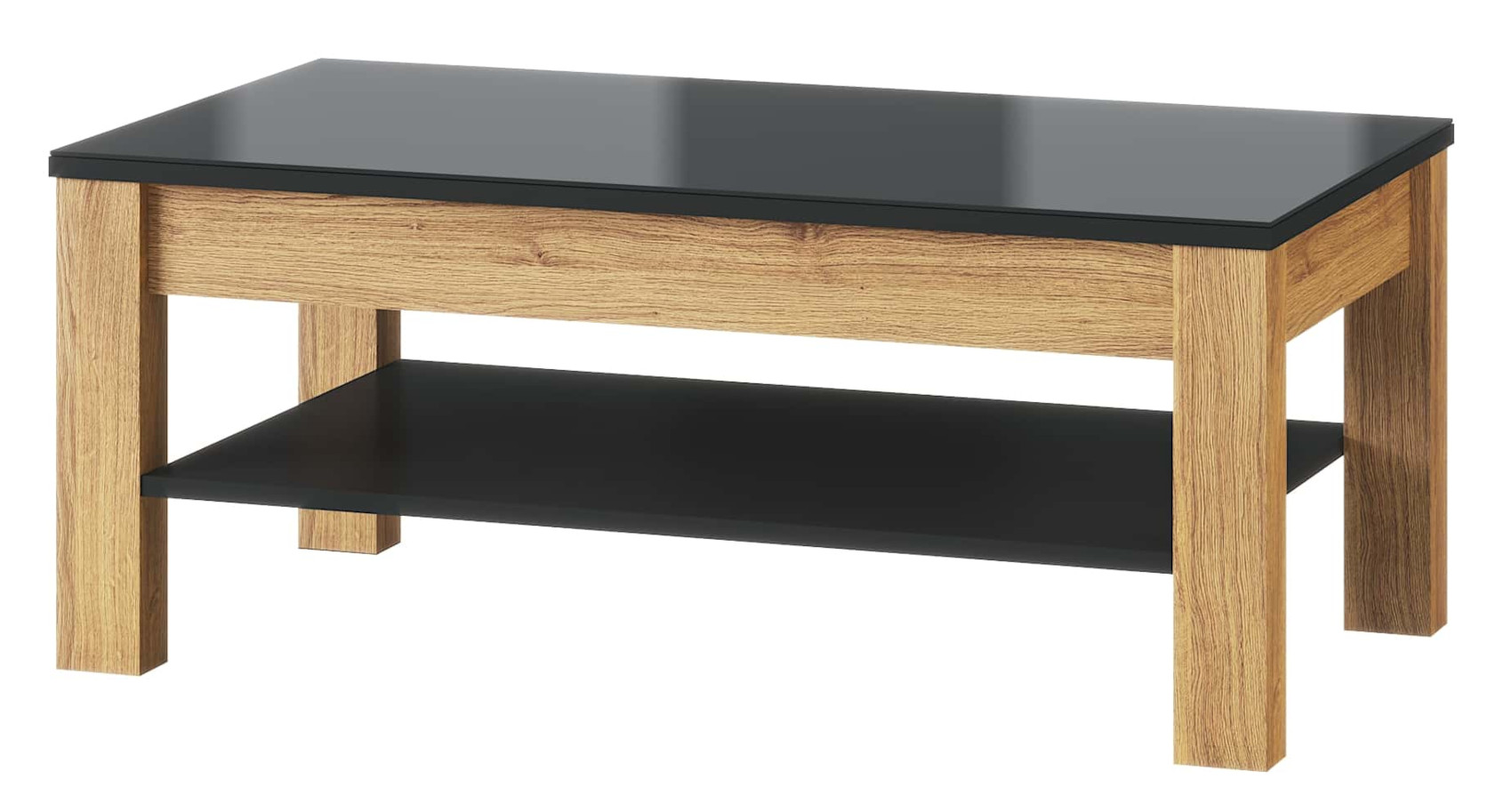 Moderní konferenční stolek Kama 41 vás zaujme svým prostým designem s viditelnou strukturou dřevěných lét. Je vyroben z lamina potaženého fólií, která navodí dojem přírodního dřeva. Jedinečným prvkem je černá skleněná horní deska.