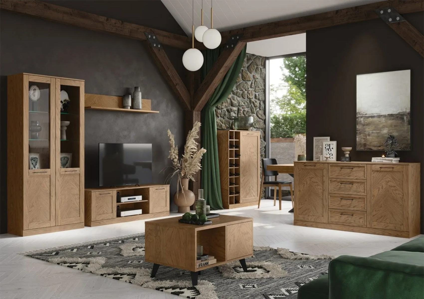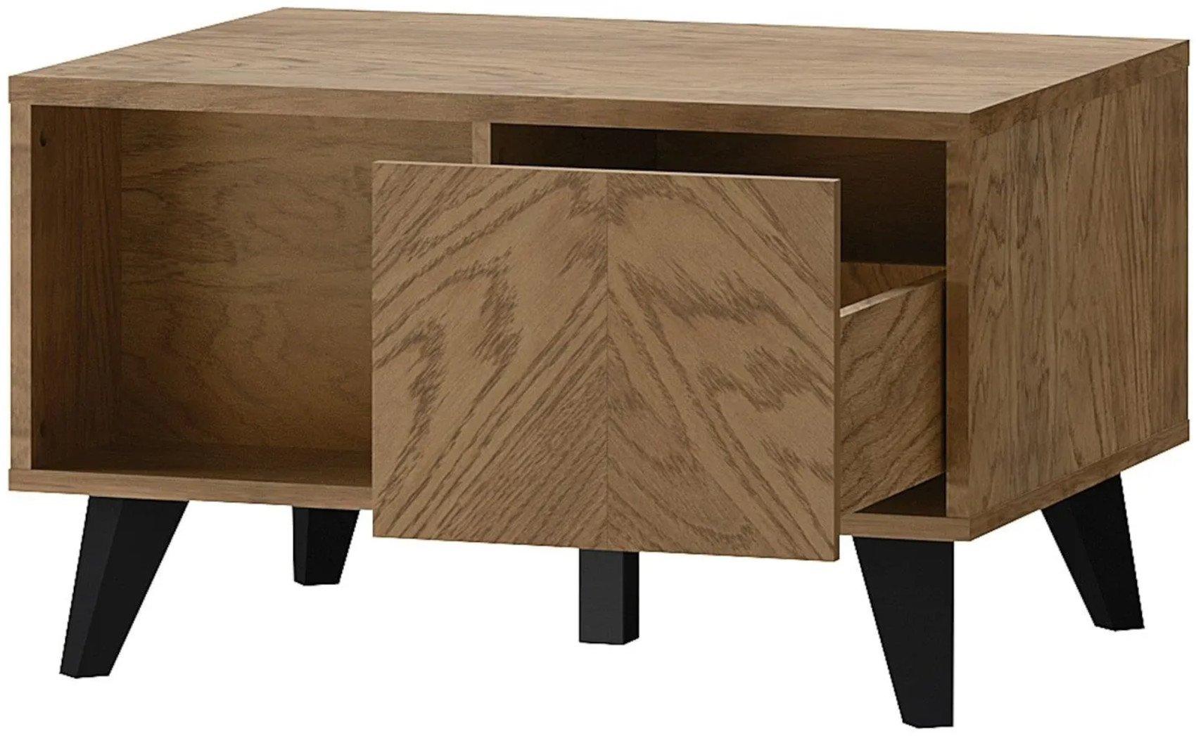 Moderní konferenční stolek Cozy 41 vás zaujme svým přírodním designem s viditelnou strukturou dřevěných lét. Přední zásuvka, se systémem tichého dovírání, je vyrobena z masivního dubového dřeva a korpus z přírodní dubové dýhy, která je potažena fólií. Součástí stolku jsou černé zkosené nožky, které provzdušní místnost a nábytku dodají nádech elegance.