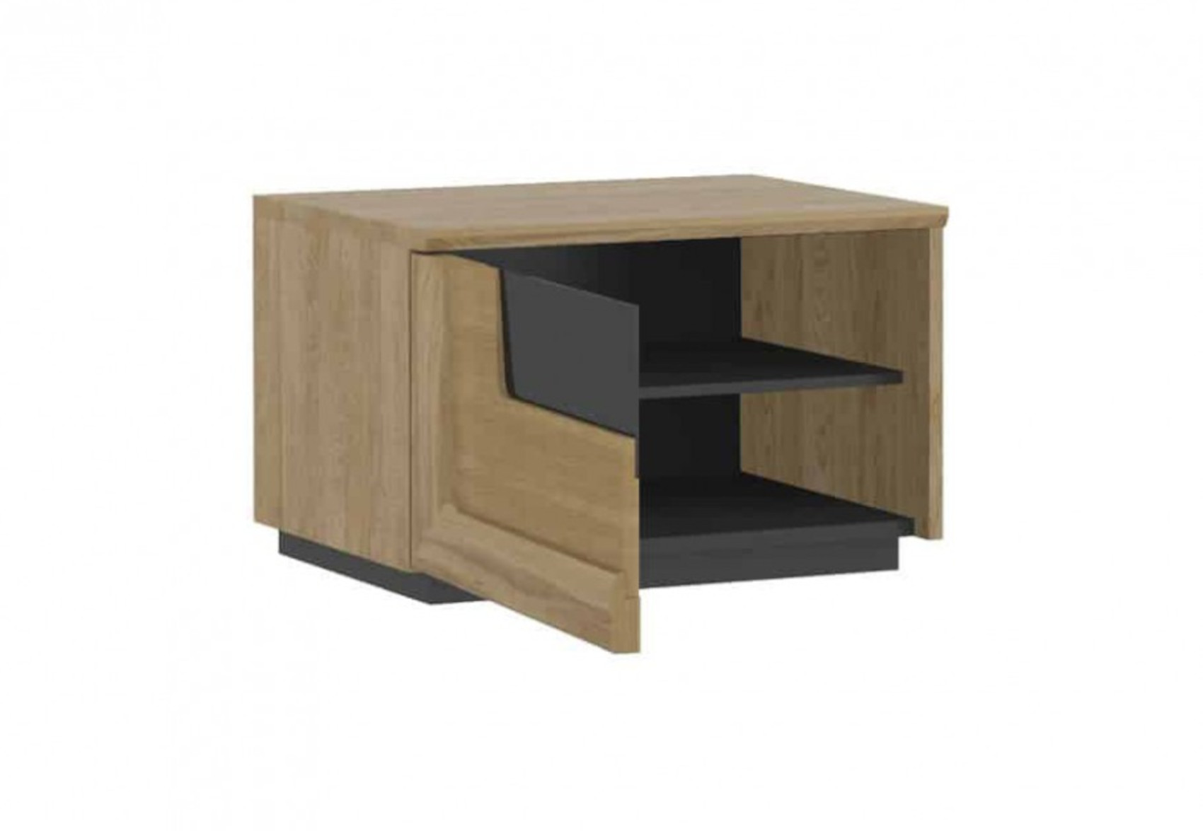 Noční stolek má plná dvířka, za kterými je vložena 1 lakovaná police.