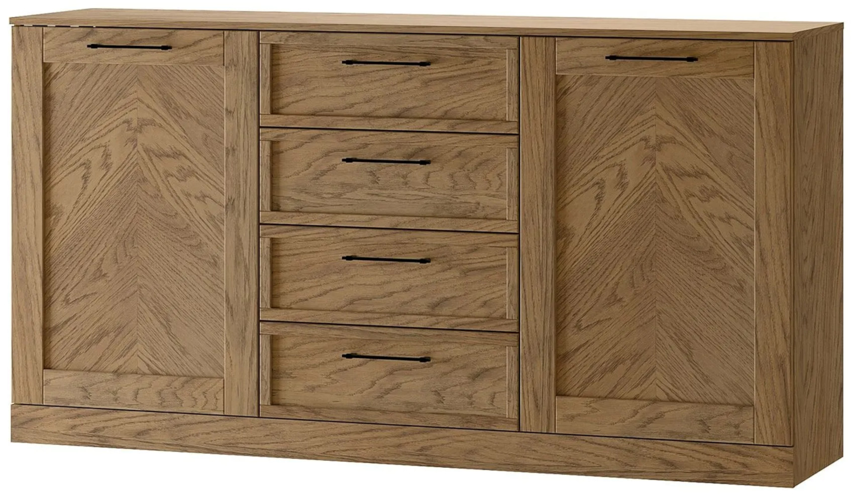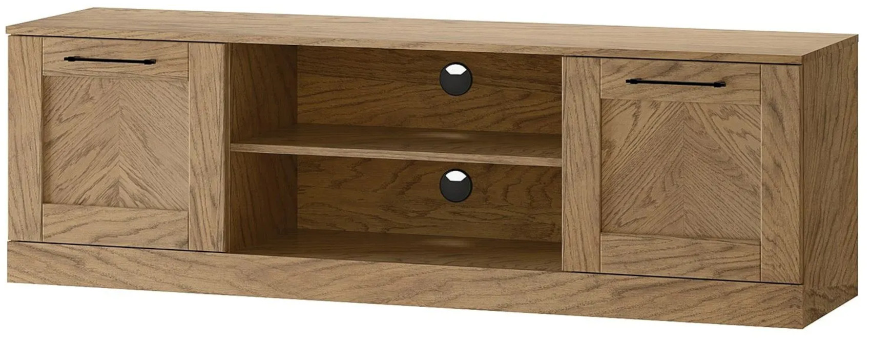 Moderní obývací pokoj Cozy vás zaujme svým přírodním designem s viditelnou strukturou dřevěných lét. Přední dvířka a zásuvky, se systémem tichého dovírání, jsou vyrobeny z masivního dubového dřeva a korpus z přírodní dubové dýhy, která je potažena fólií. Součástí jsou kovové úchyty v odstínu černý mat, které dodají nábytku nádech elegance.