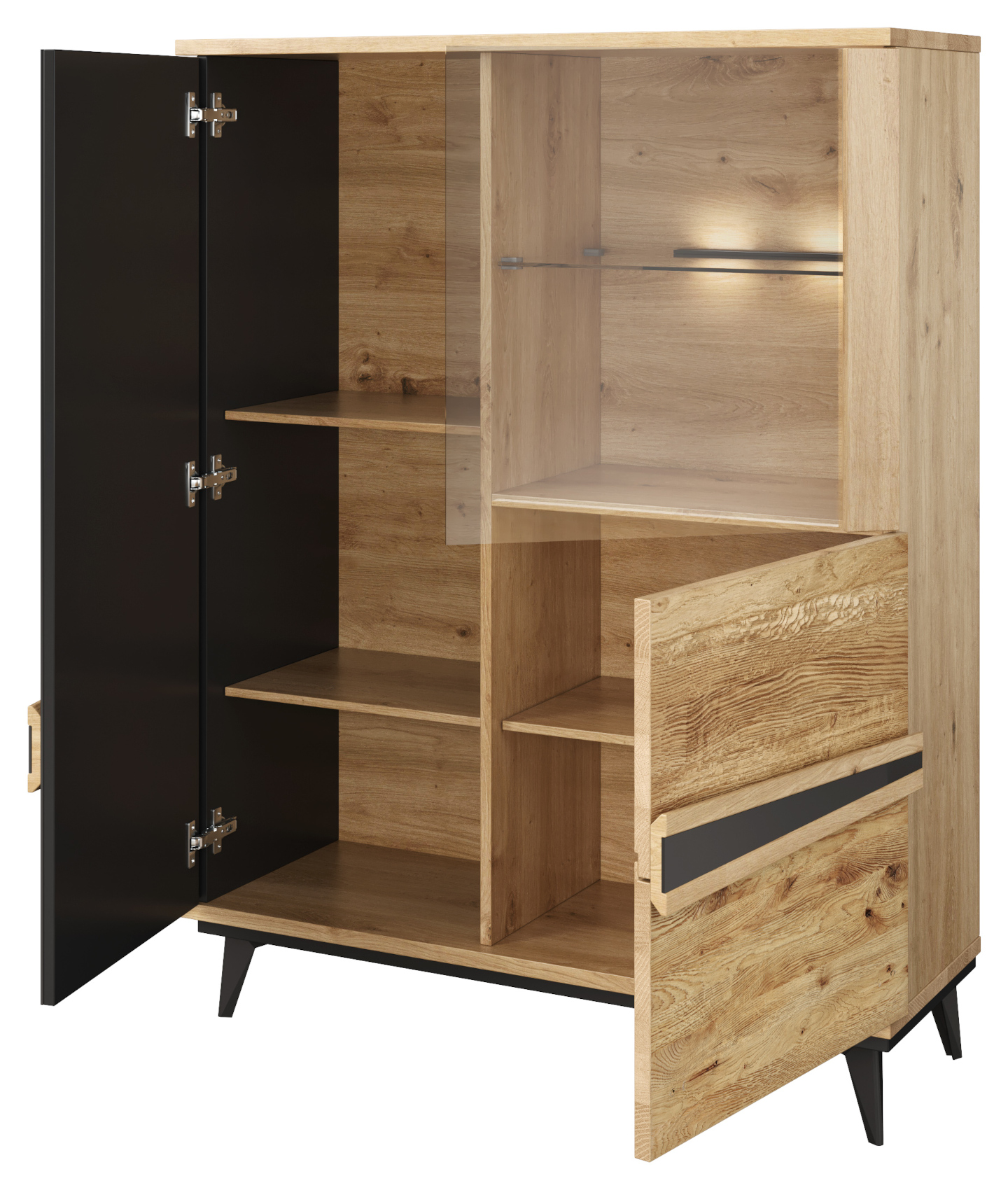 Obývací pokoj Etna vás zaujme svým industriálním designem. Jedinečným prvkem jsou zvláštní rukojeti na dvířkách, které dodají nábytku nádech elegance. Produkty jsou vyrobeny z masivního dubového dřeva a přírodní dubové dýhy s černými skleněnými prvky a dvířky. Kvalitní technologie lakování a moření navodí přírodní vzhled dřeva a zvýrazní tak jeho léta. Nábytek stojí na černých kovových nožkách, které provzdušní váš celkový prostor. Dvířka i zásuvky v celém systému mají jednoduchý systém tichého dovírání.