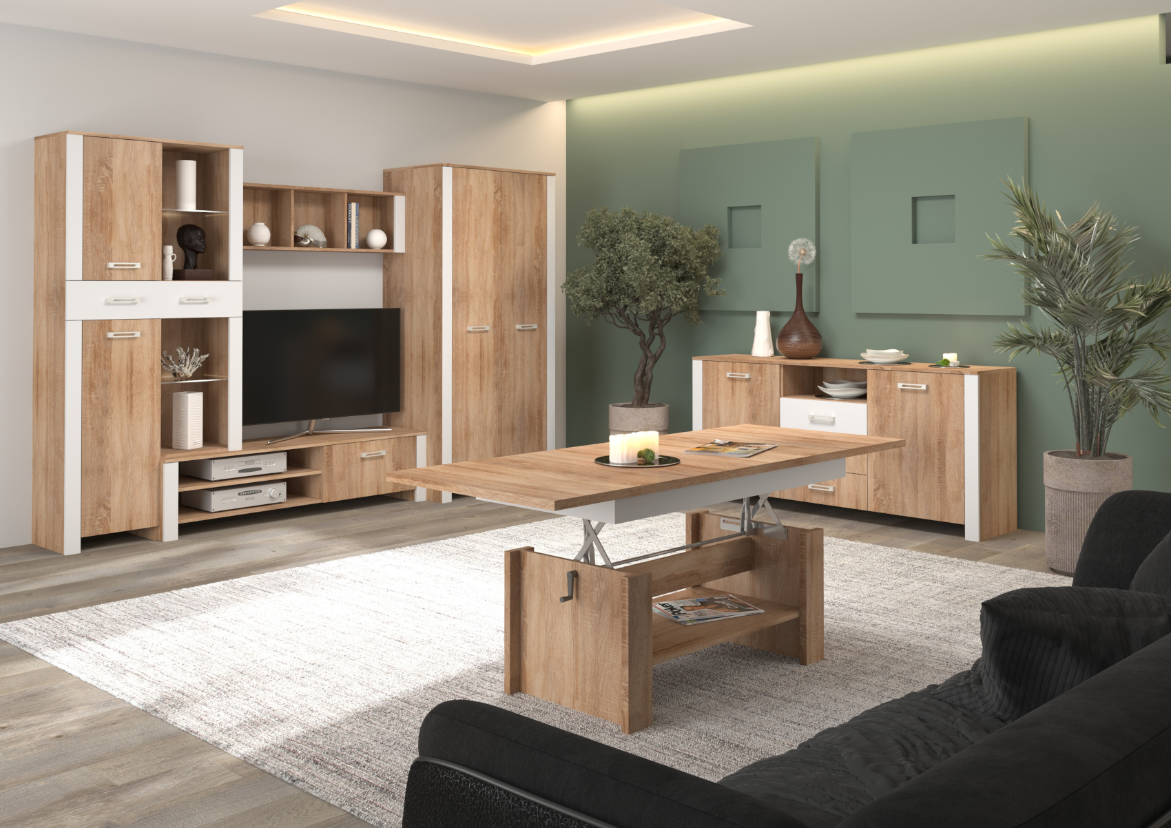 Ke stěně si můžete také doobjednat vyobrazený konferenční stolek Mexico a komodu Hugo 02, které nejsou součástí naceněné sestavy.