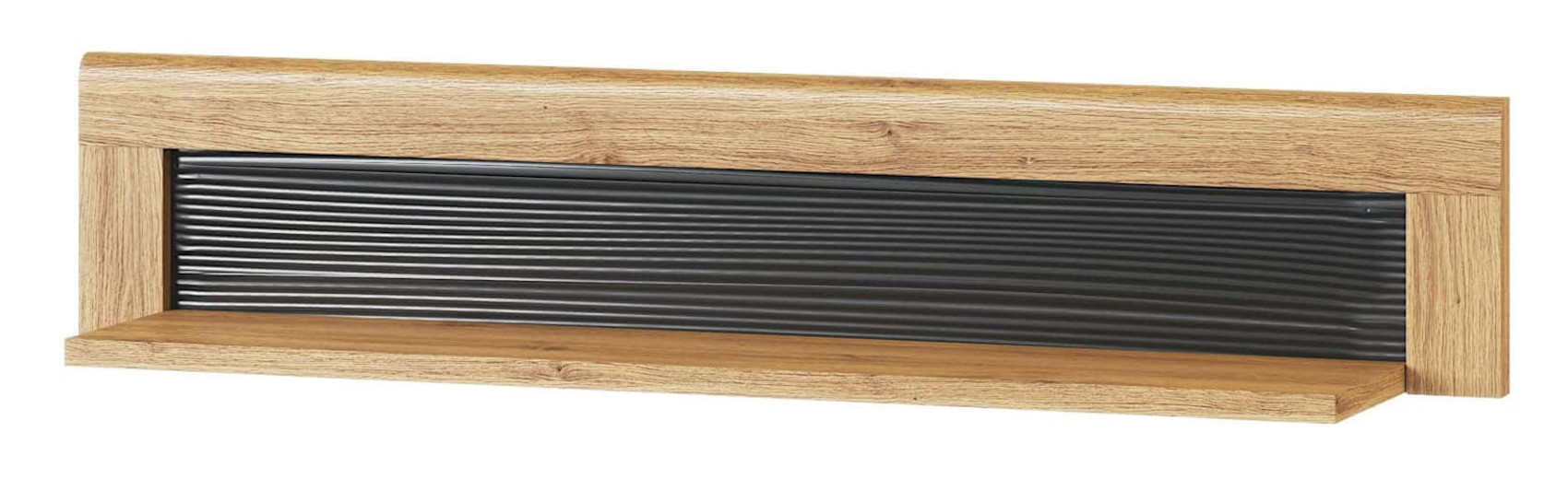 Moderní police Kama 34 krátká vás zaujme svým prostým designem s viditelnou strukturou dřevěných lét. Je vyrobena z lamina potaženého fólií, která navodí dojem přírodního dřeva. Jedinečným prvkem jsou matně černé lakované detaily.