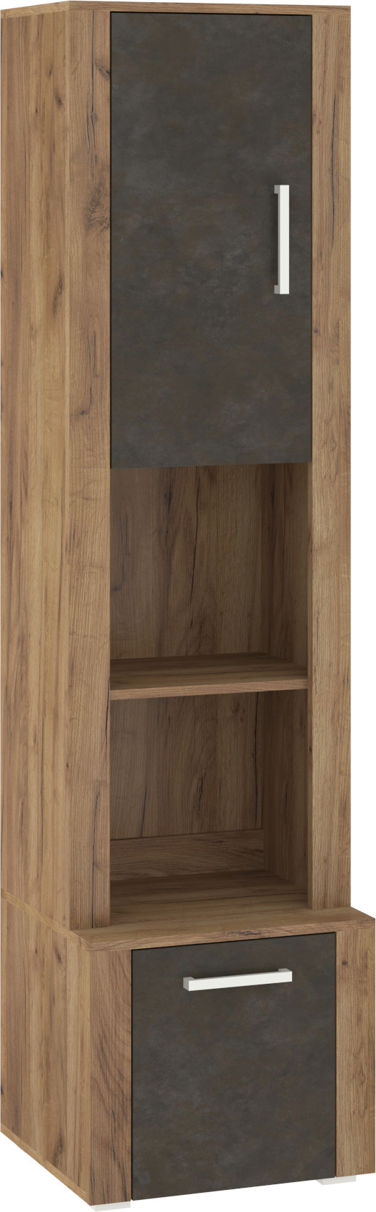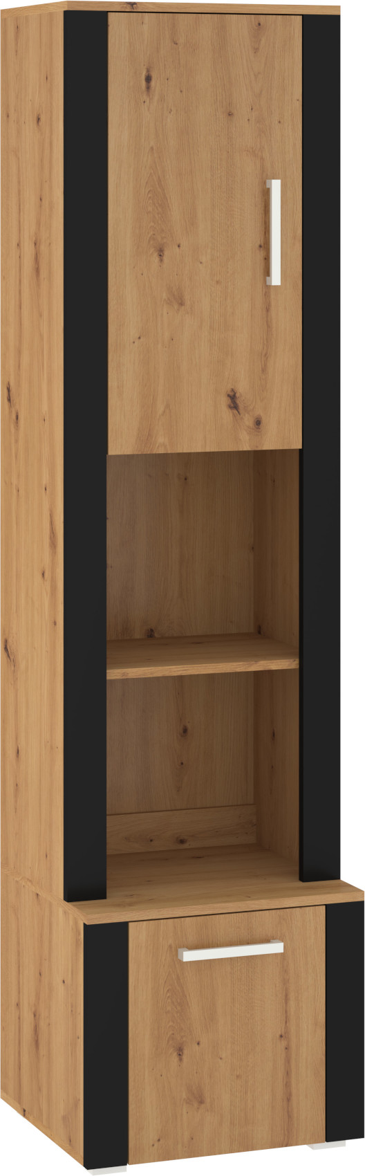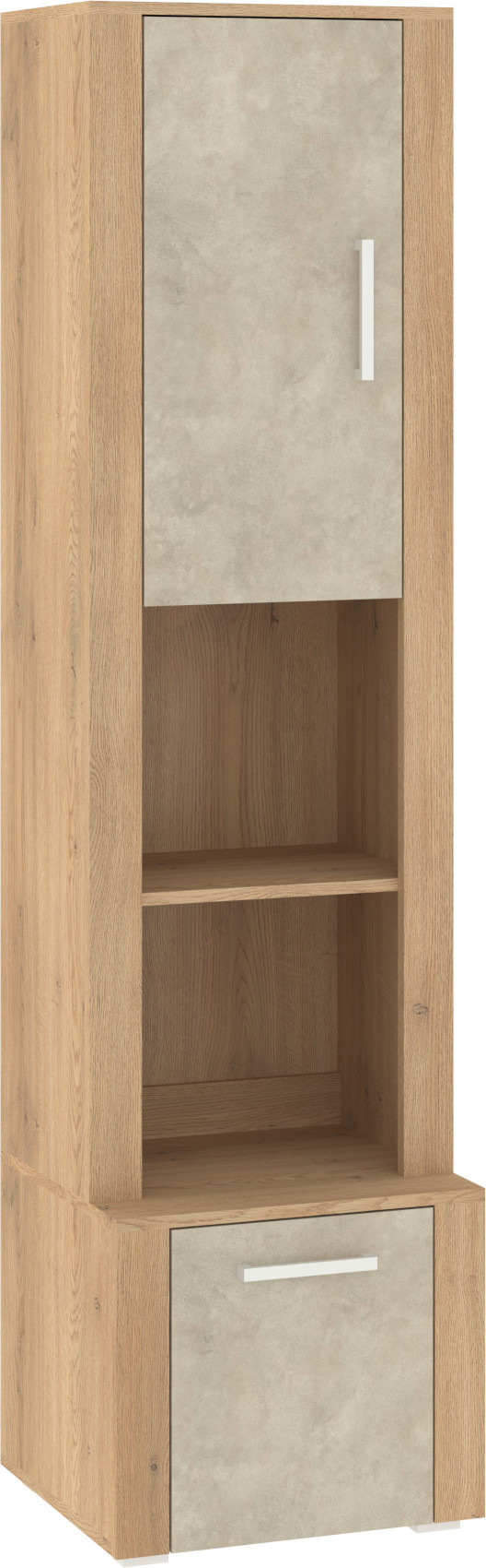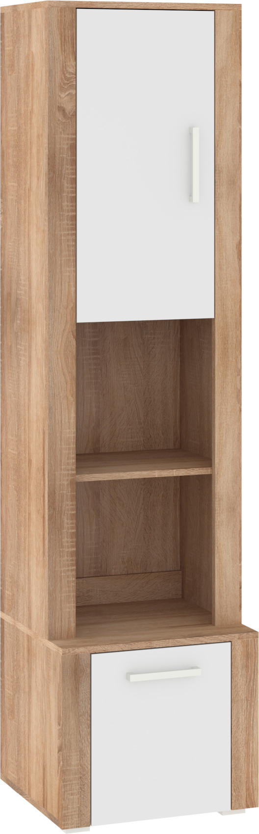 Součástí regálu jsou 2 plná dvířka, za kterými je vložena 1 lakovaná police. Součástí jsou 2 otevřené niky k vystavení vašich oblíbených dekorací, rámečků či jiných nezbytností.