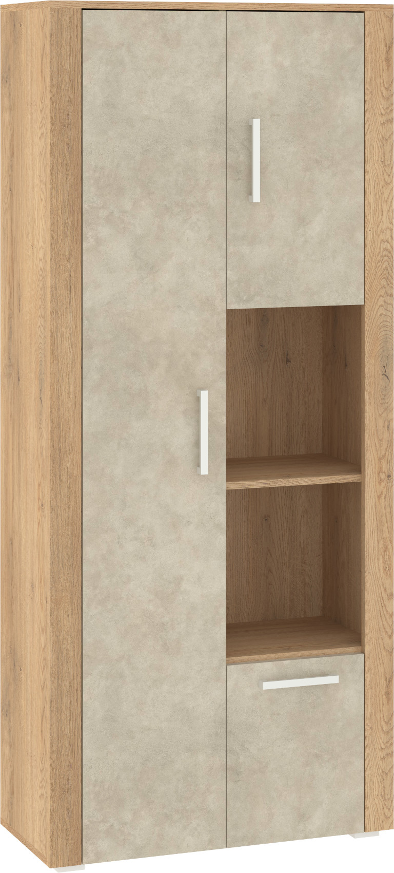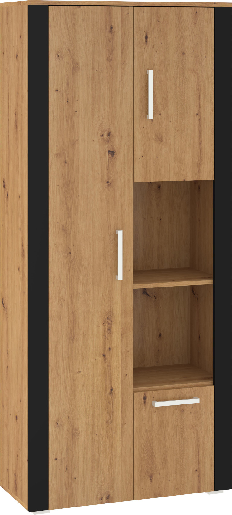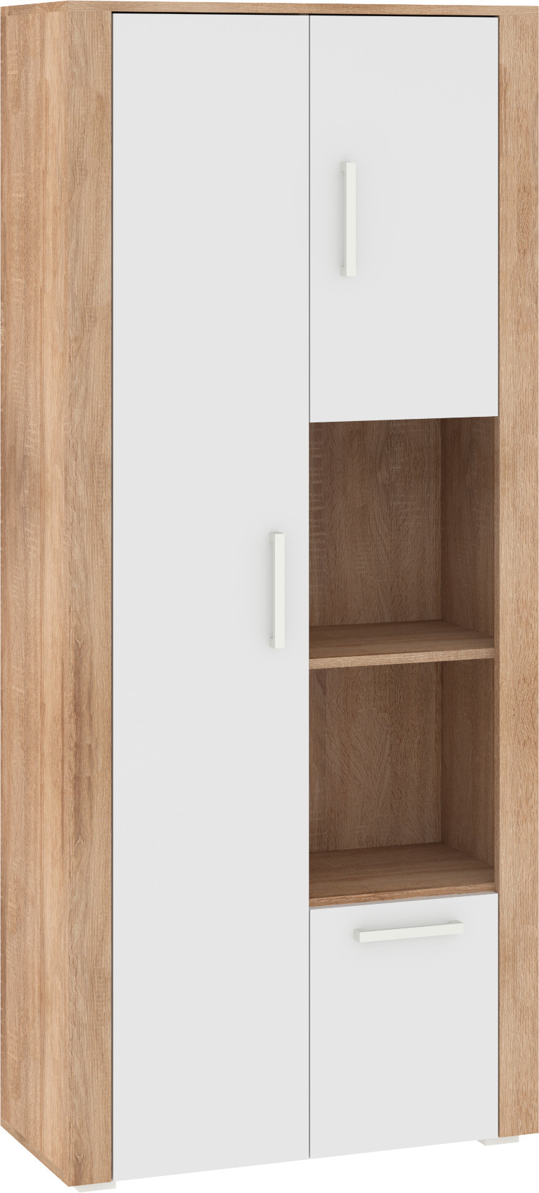 Součástí regálu jsou 3 plná dvířka, za kterými je vloženo 5 lakovaných polic. V pravé části jsou 2 otevřené niky k vystavení vašich oblíbených knih, dekorací, rámečků s fotografiemi či jiných nezbytností.