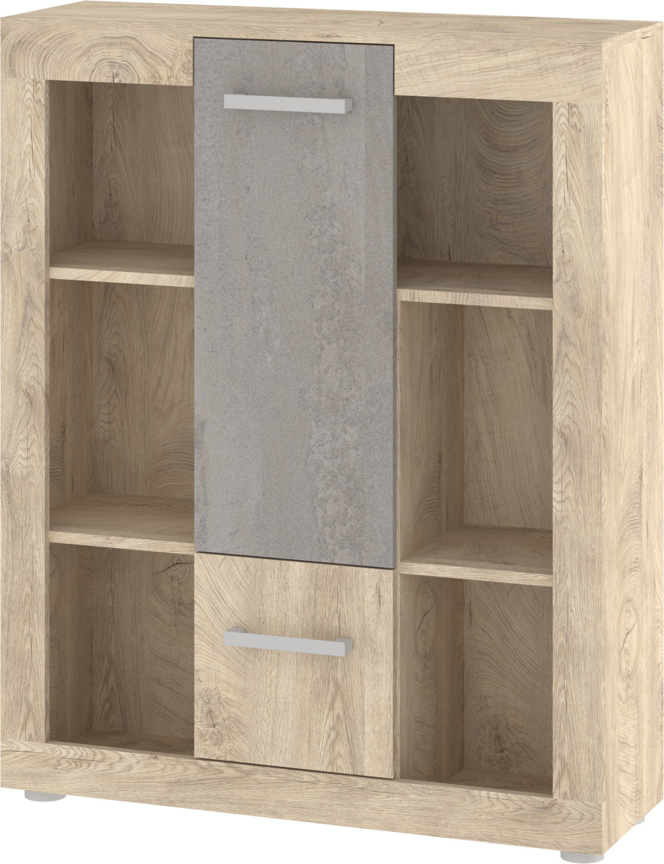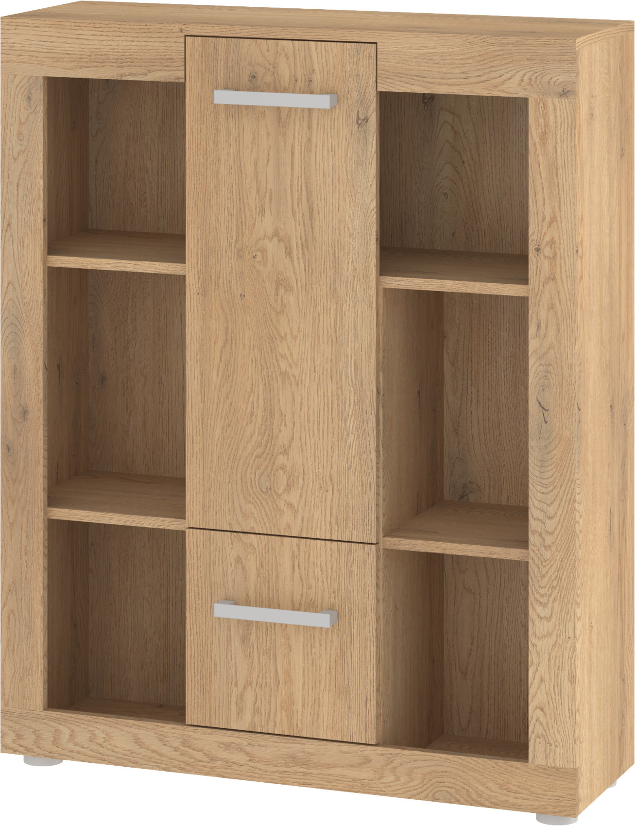 Součástí jsou 2 plná prostřední dvířka, za kterými je vložena 1 lakovaná police. Zbytek prostoru je otevřený a můžete jej využít k vystavení vašich oblíbených knih, dekorací či jiných nezbytností.