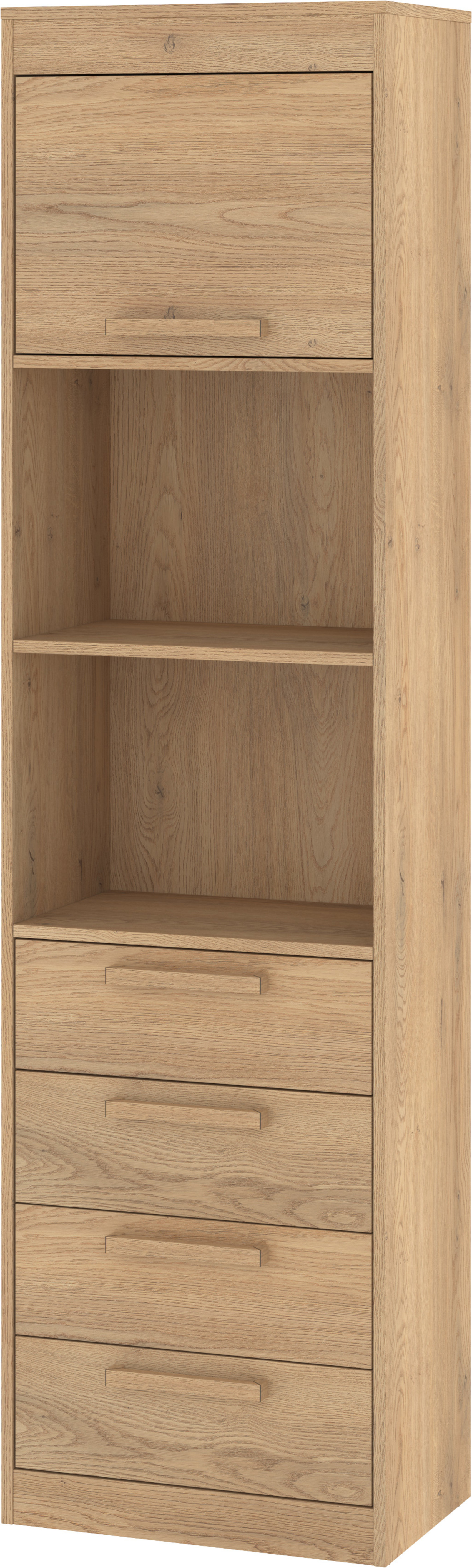 Součástí regálu jsou 4 zásuvky na kovových pojezdech, 1 skříňka s plnými dvířky a 2 otevřené niky k vystavení vašich oblíbených knih, dekorací či rámečků s fotografiemi.
