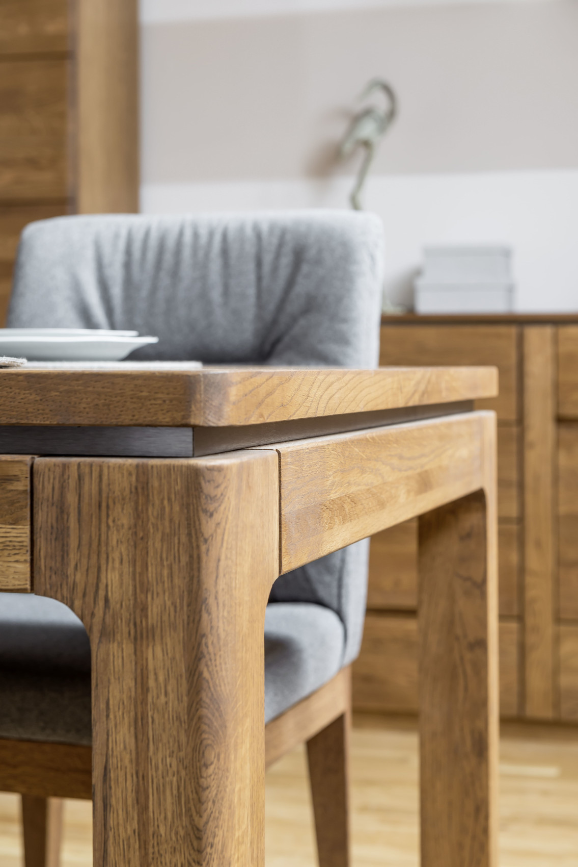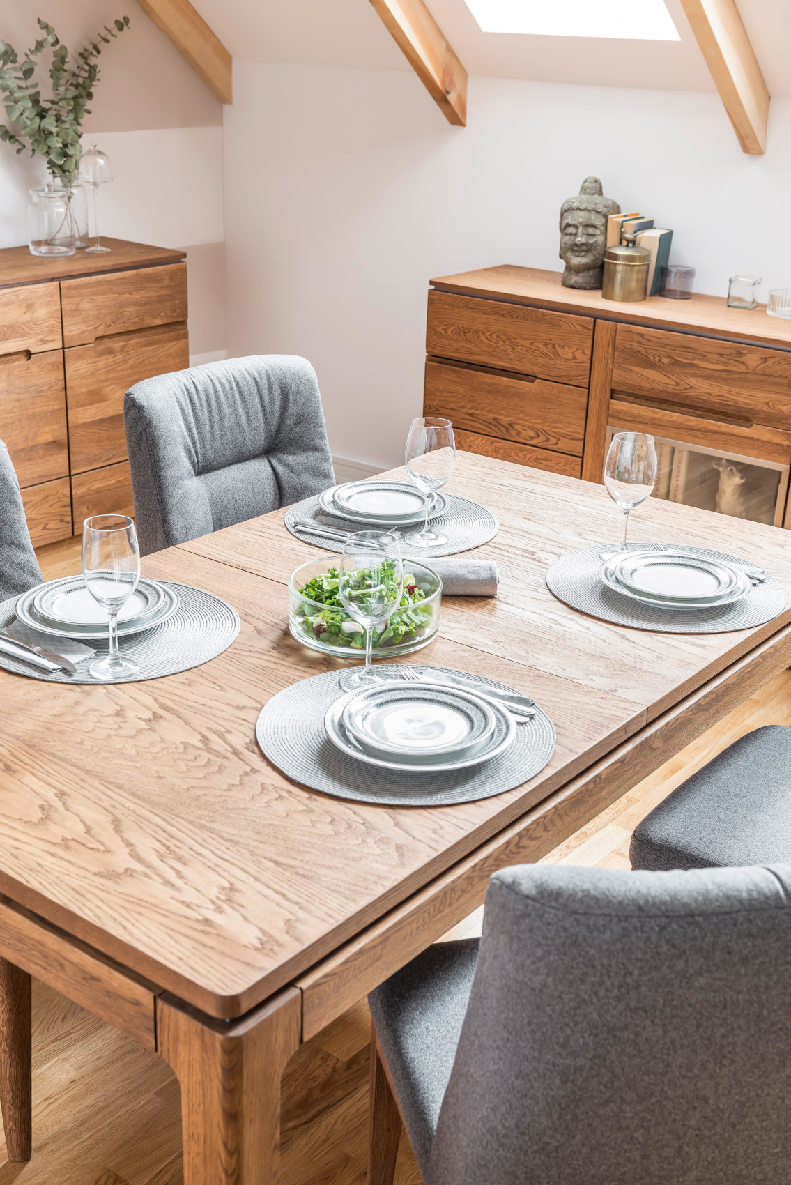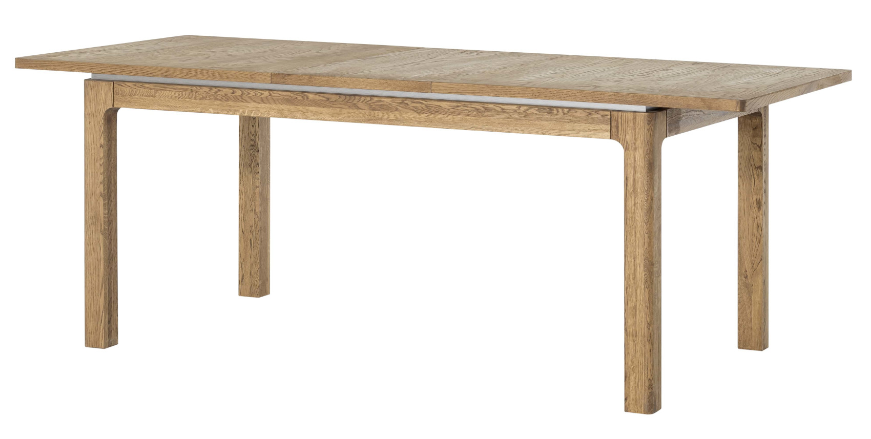 Moderní rozkládací jídelní stůl Montenegro 40 vás zaujme svým elegantní designem. Je vyroben z masivního dubové dřeva a přírodní dubové dýhy. Jedinečným prvkem celého systému jsou kovové detaily pod horní deskou.