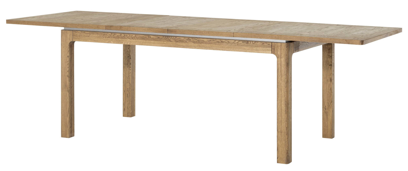 Díky kovovému kolejnicovému systému můžete stůl rozložit do šířky od 160 cm do 250 cm. Pod horní deskou jsou vloženy 2 dřevěné vklady.