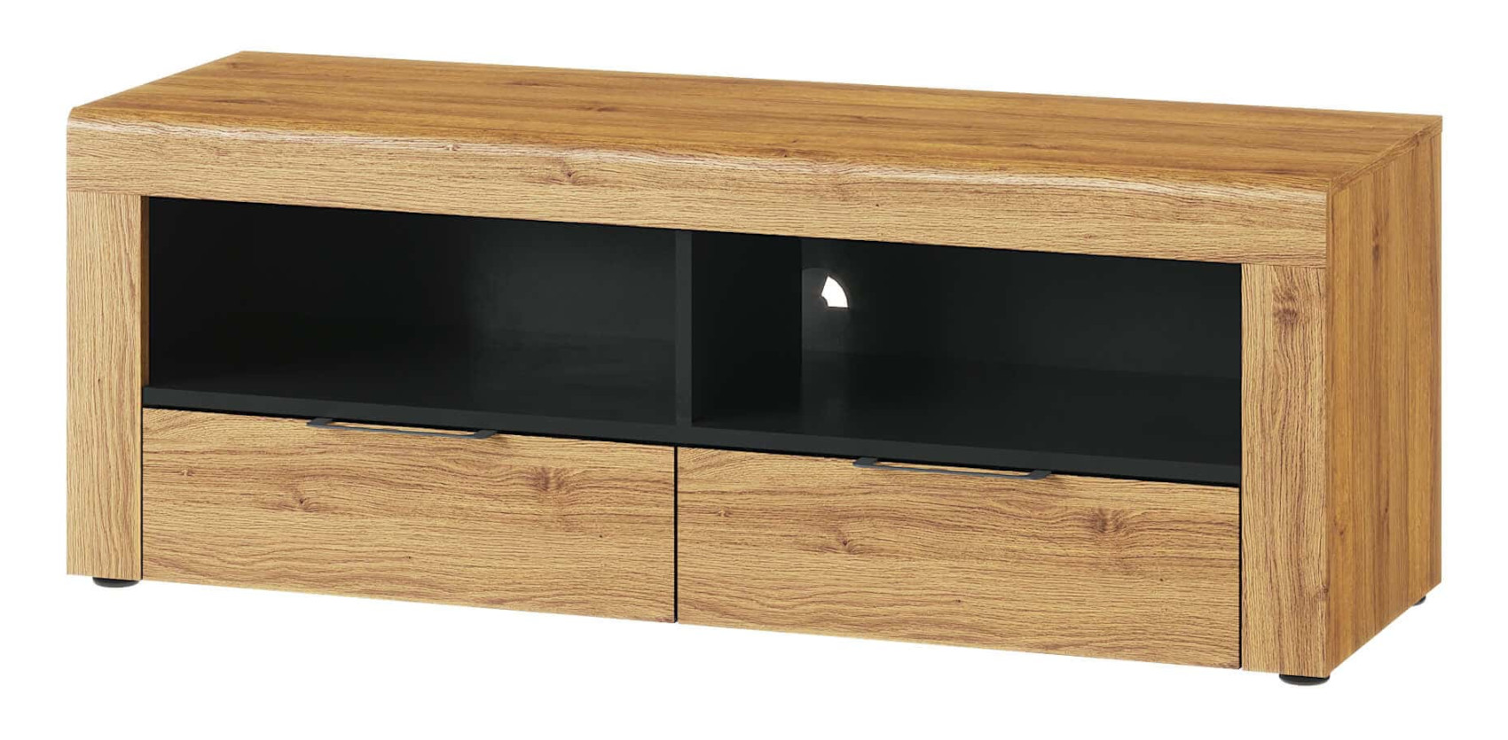 Moderní RTV stolek Kama 24 vás zaujme svým prostým designem s viditelnou strukturou dřevěných lét. Je vyroben z lamina potaženého fólii, která navodí dojem přírodního dřeva. Jedinečným prvkem jsou matně černé lakované detaily s úchyty. Zásuvky mají systém tichého dovírání.