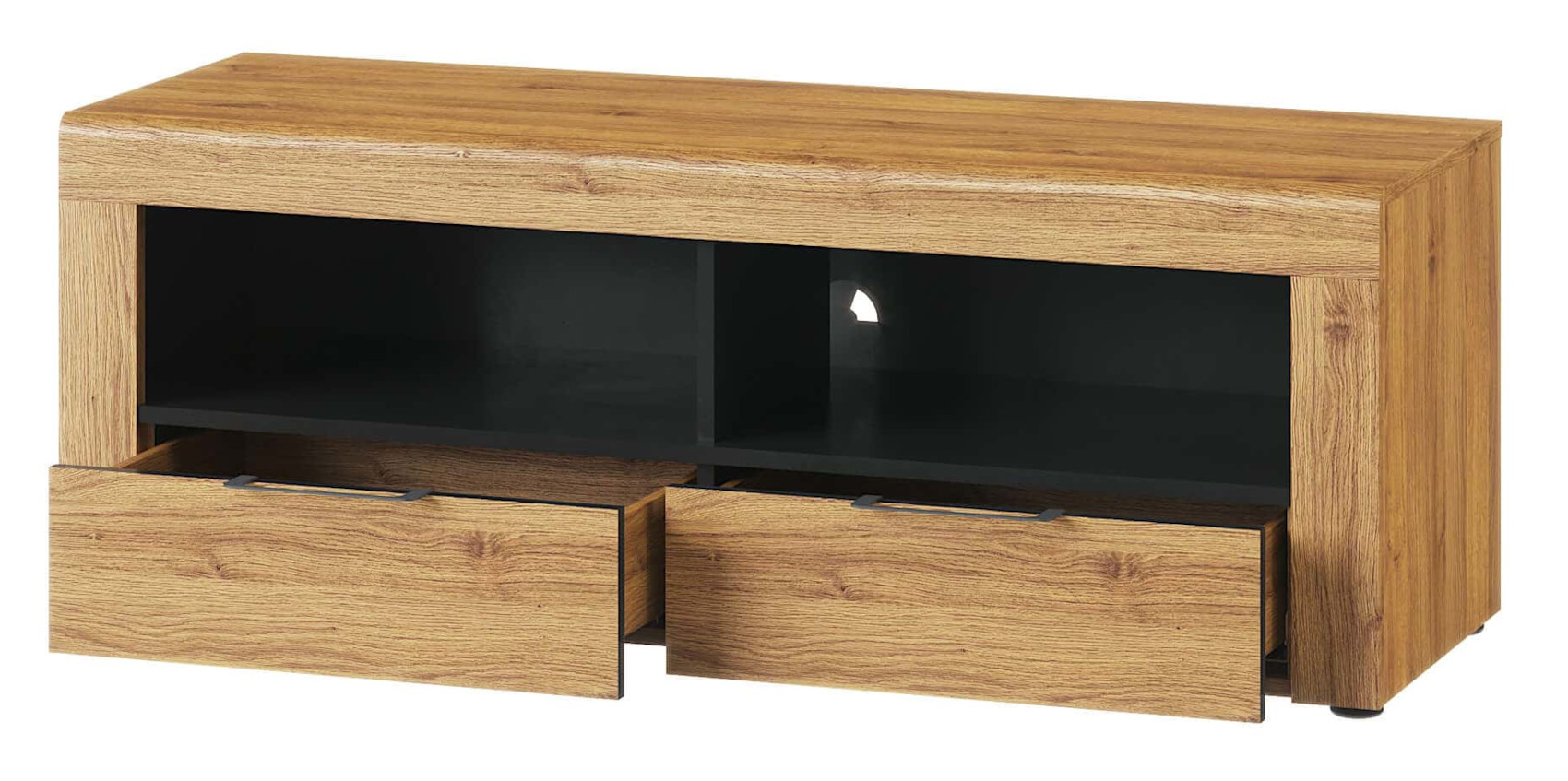 Součástí RTV stolku jsou 2 zásuvky na kovových pojezdech a nad nimi jsou 2 otevřené niky k uložení elektroniky nebo dekorací. V zadní straně niky je připraven vývod pro kabeláž.