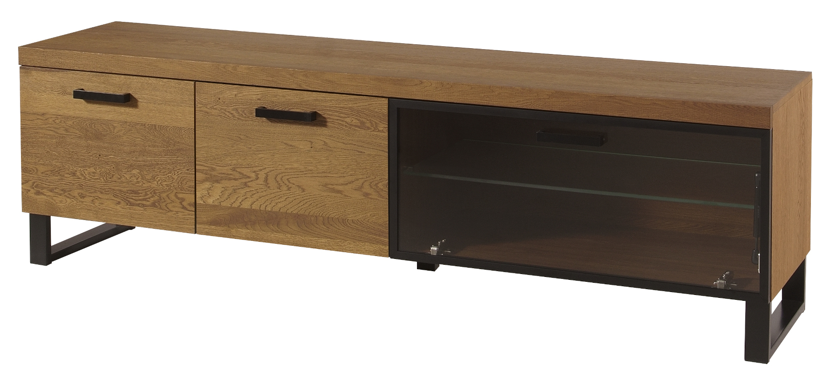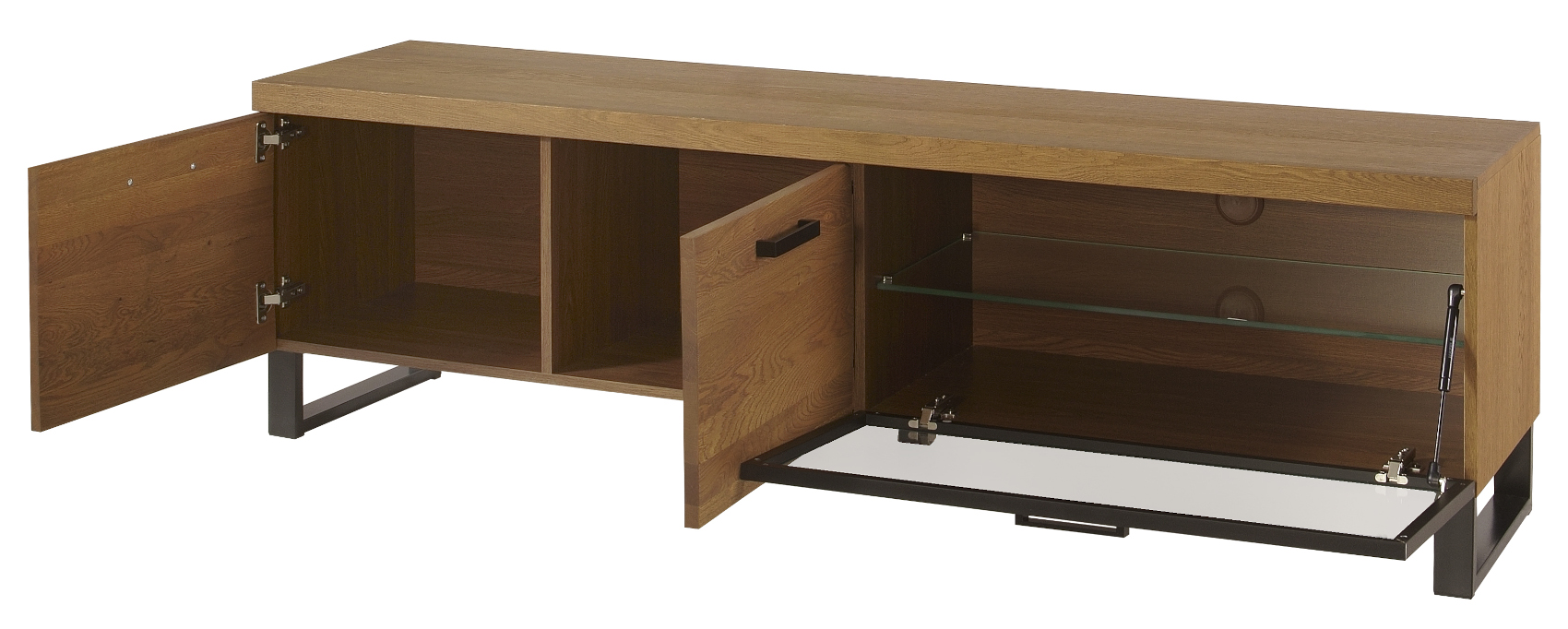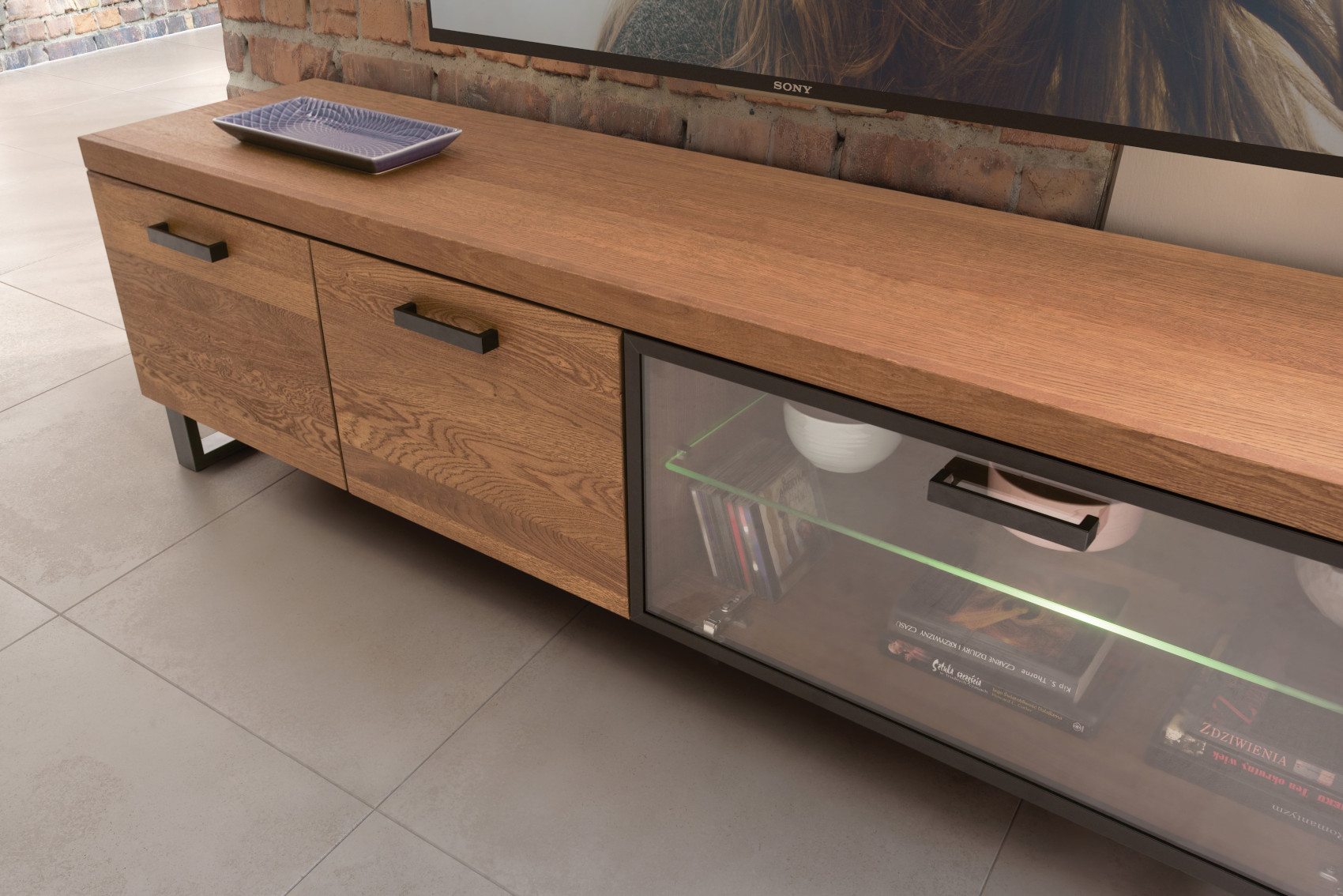 Moderní RTV stolek Pratto 25 vás zaujme svým luxusním přírodním designem. Je vyroben z masivního dubového dřeva a přírodní dubové dýhy s černé matnými lakovanými detaily. Jedinečným prvkem jsou viditelné struktury dřevěných lét a černé kovové úchyty. Stolek stojí na černých kovových nožkách, které provzdušní váš celkový interiér.