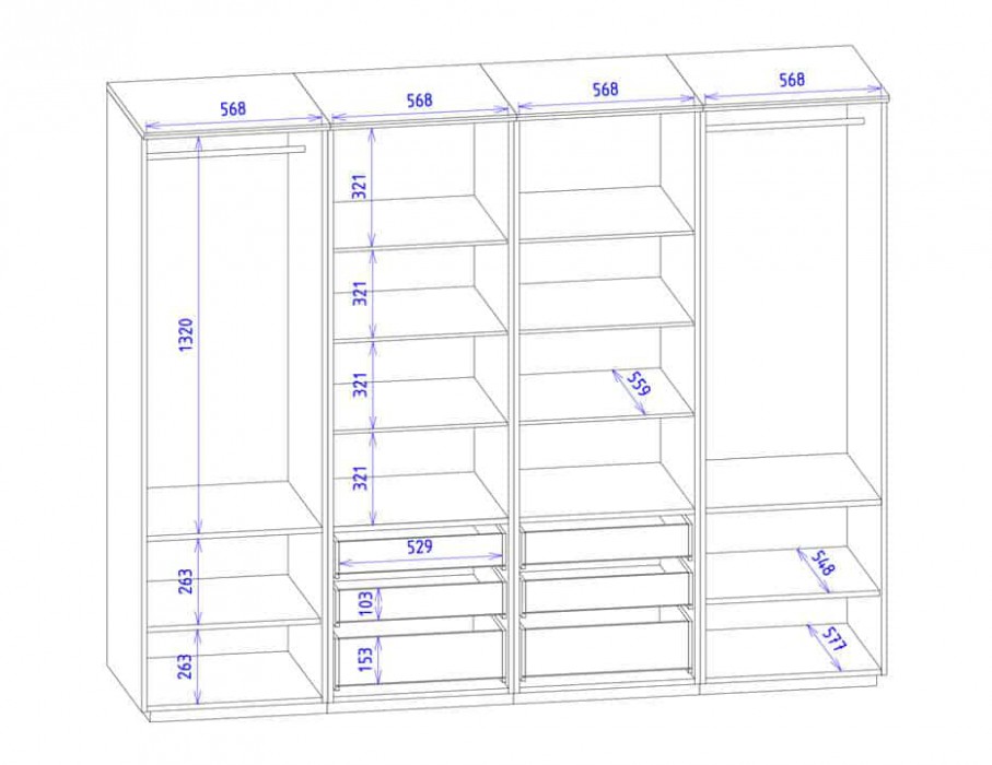 Šatní skříň má 2 krajní dveře se zrcadly a prostřední dveře jsou očalouněné. Vnitřní prostor je vyplněn 2 šatními tyčemi a 6 lakovanými policemi. Ve spodní části jsou 2 plná malá dvířka se 2 lakovanými policemi a uprostřed je 6 zásuvek na kovových pojezdech.