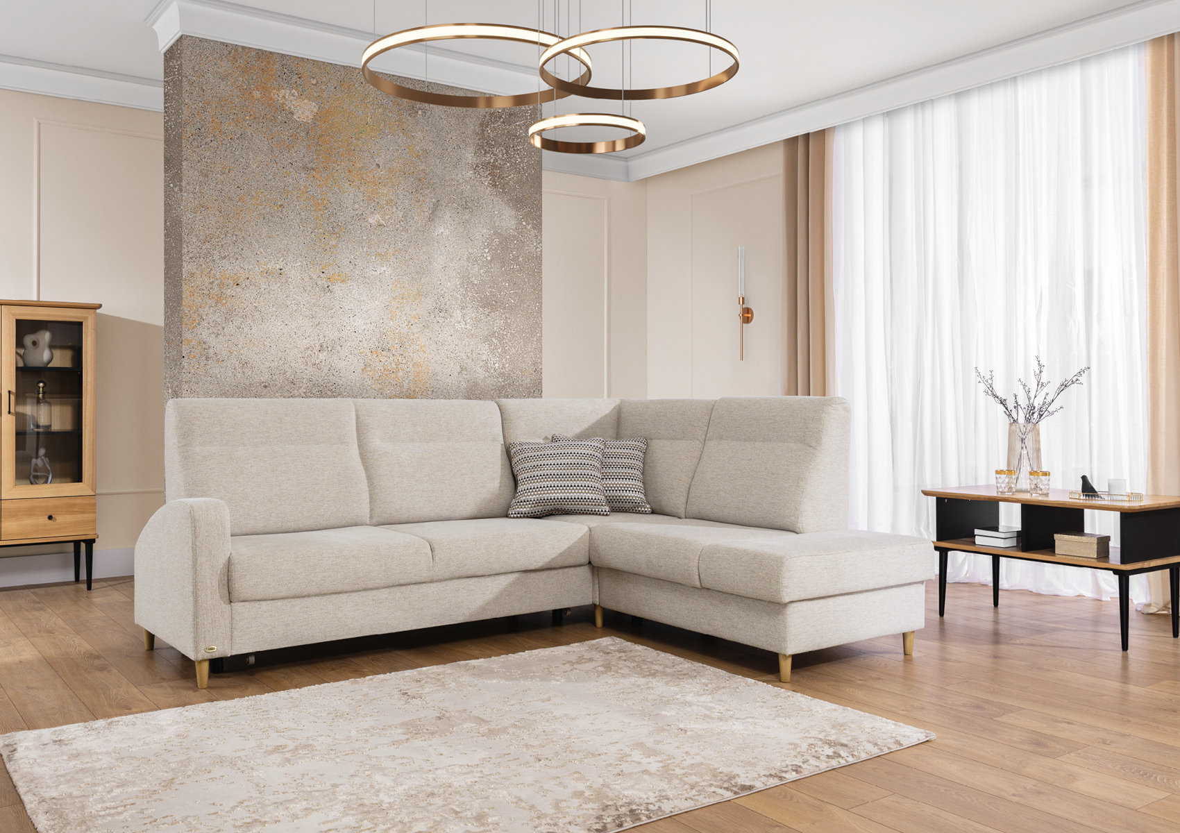 Rohová sedací souprava Boretto vás zaujme svým elegantním designem s retro prvky. Má rozkládací systém určený ke spánku a prostor k uložení ložního prádla, přikrývek nebo polštářů. Skelet je z masivního bukového dřeva, které je odolné a vzhledem k jeho tvrdosti vám zaručí stabilitu sedačky.