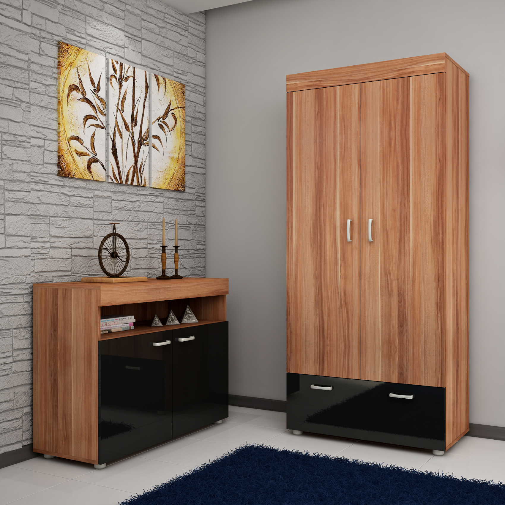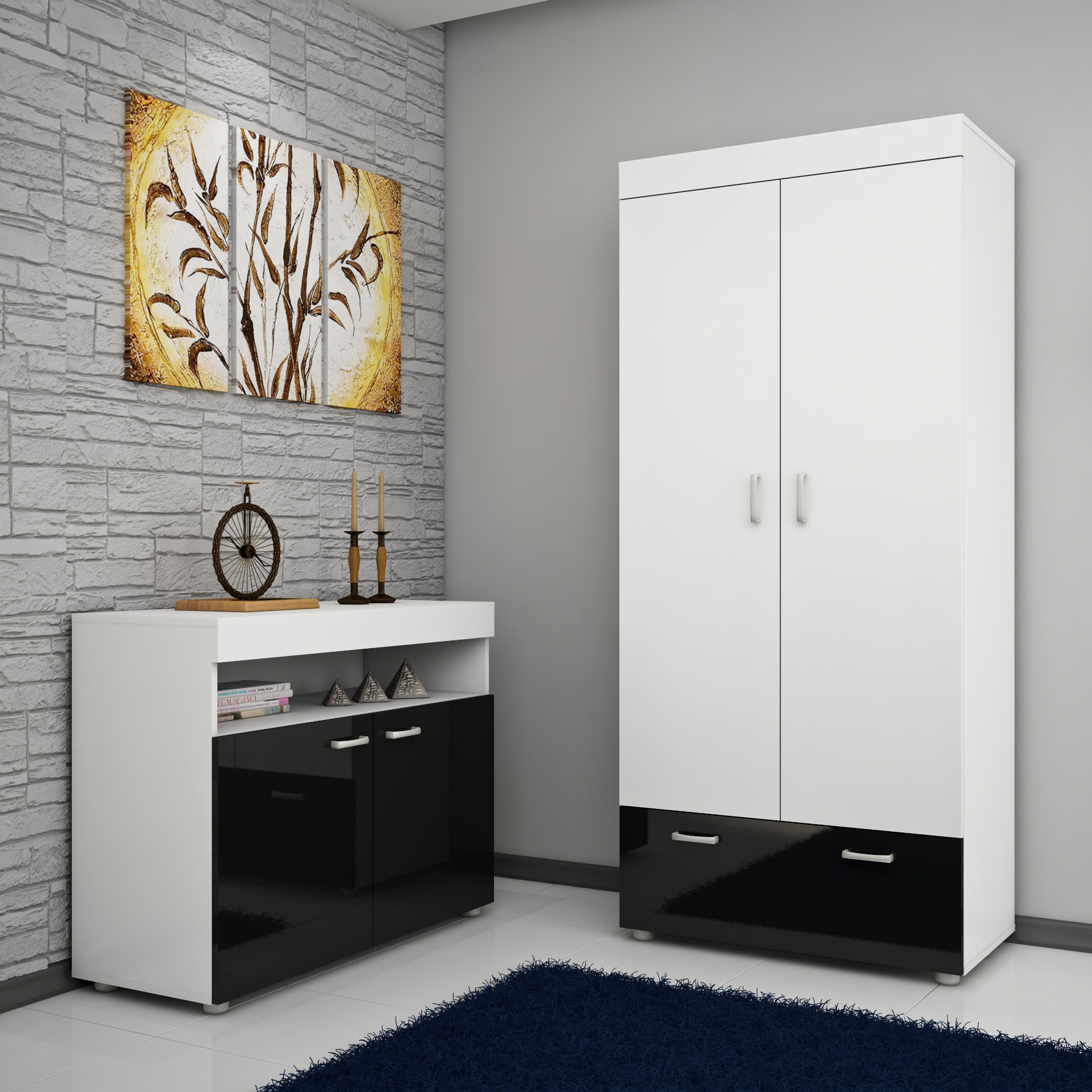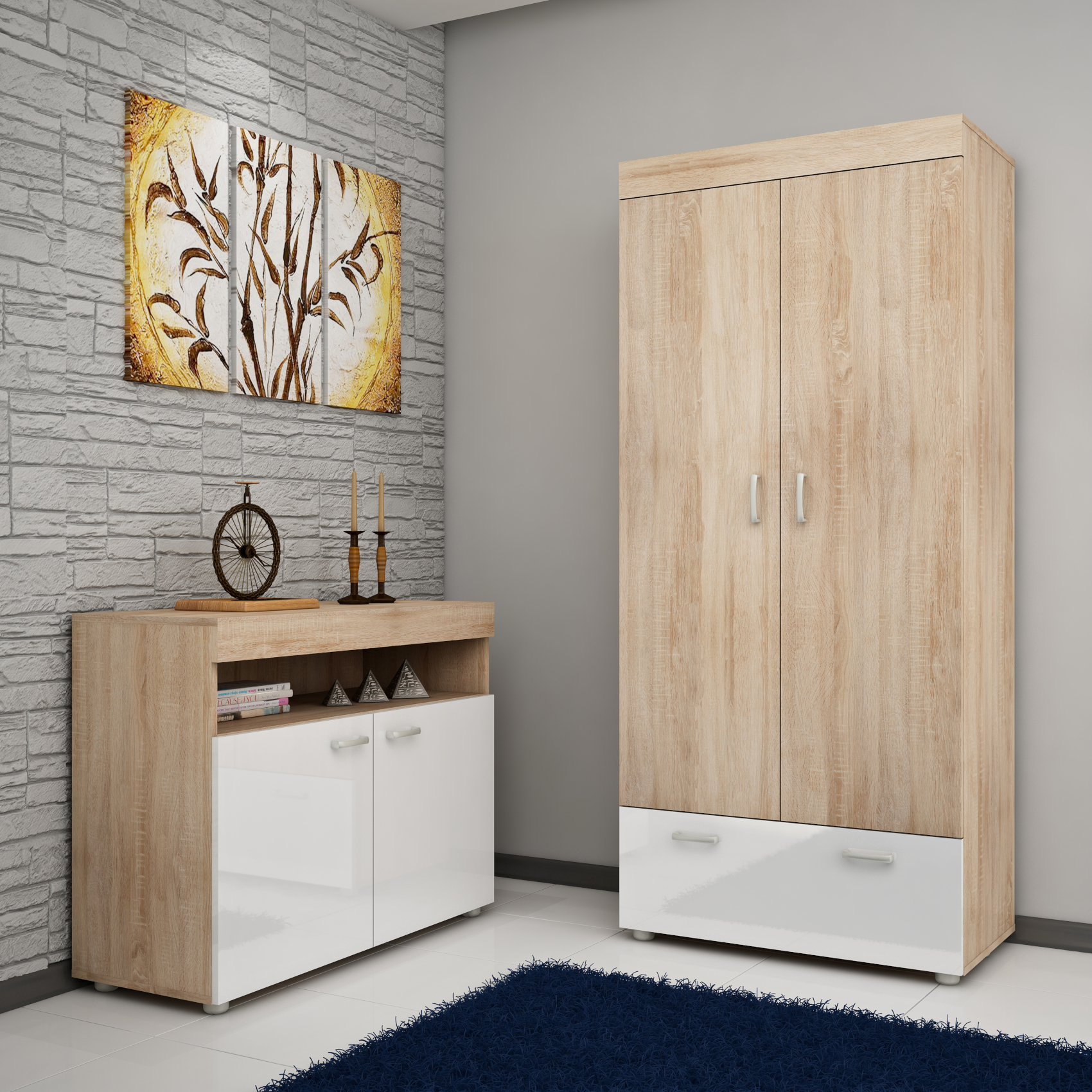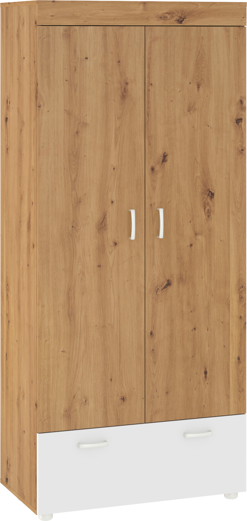 Součástí skříně jsou 2 plná dvířka, za kterými je vložena 1 dlouhá lakovaná police a 1 šatní tyč. Pod dvířky je 1 dlouhá a prostorná zásuvka.