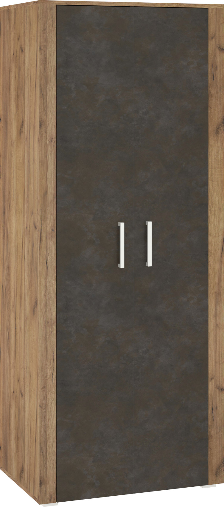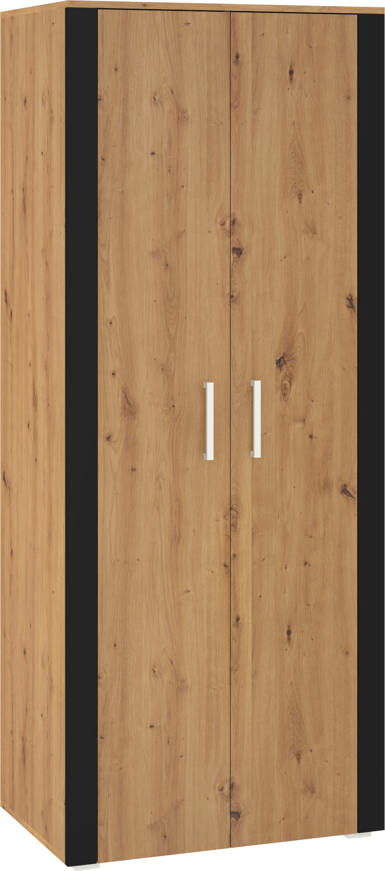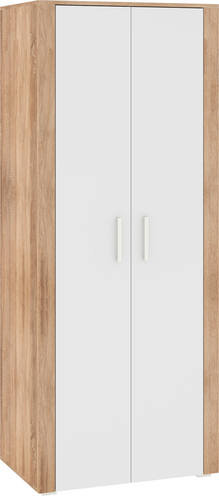 Součástí skříně jsou 2 plná dvířka, za kterými jsou vloženy 2 lakované police. Po horní policí je 1 šatní tyč.